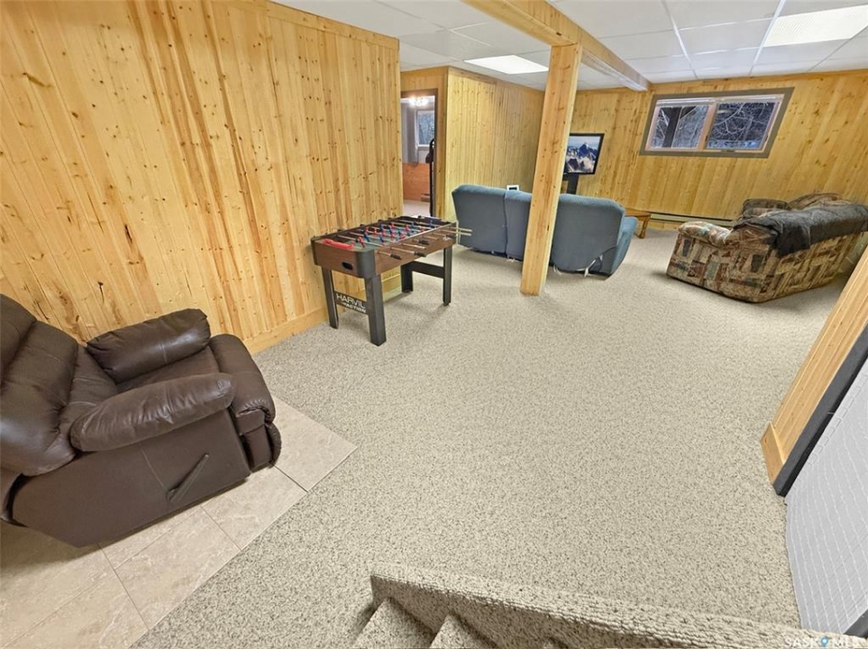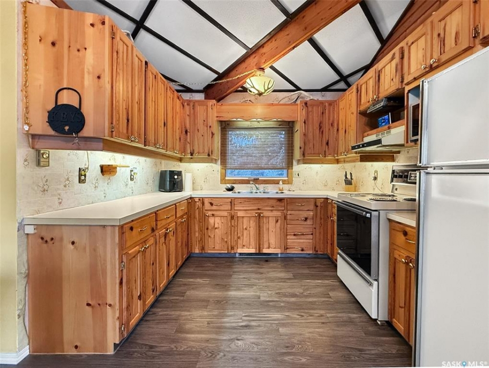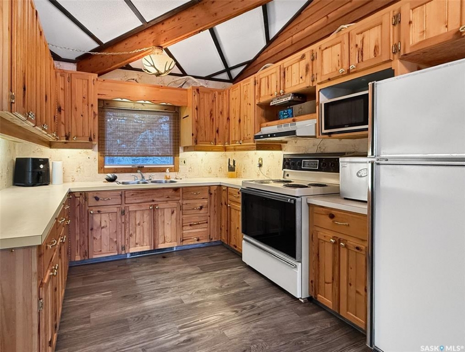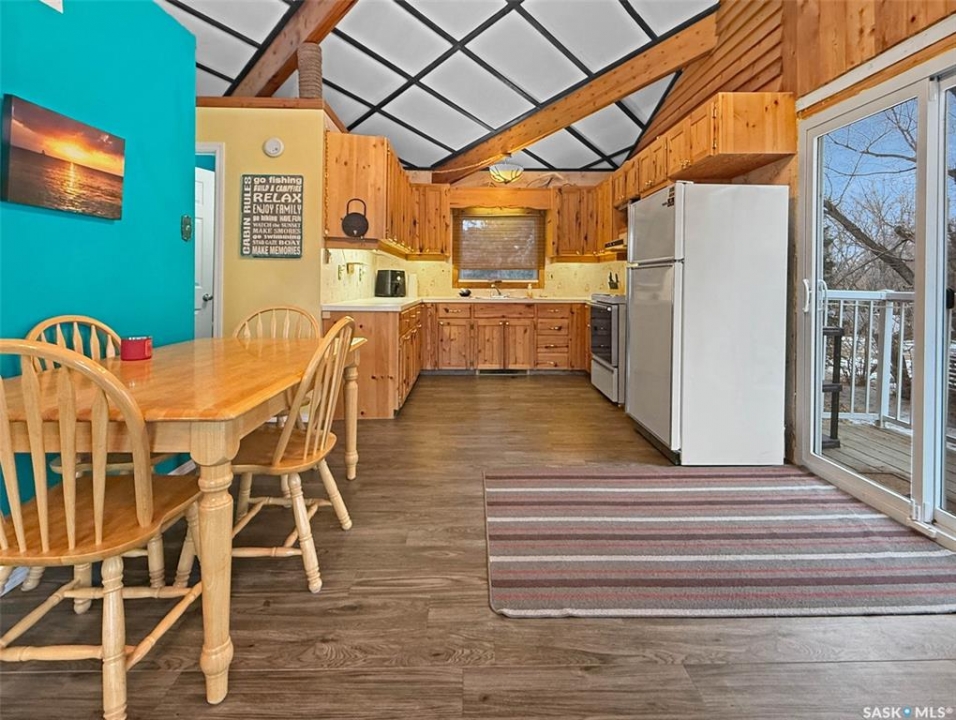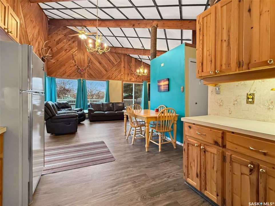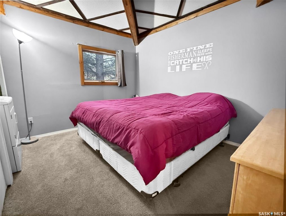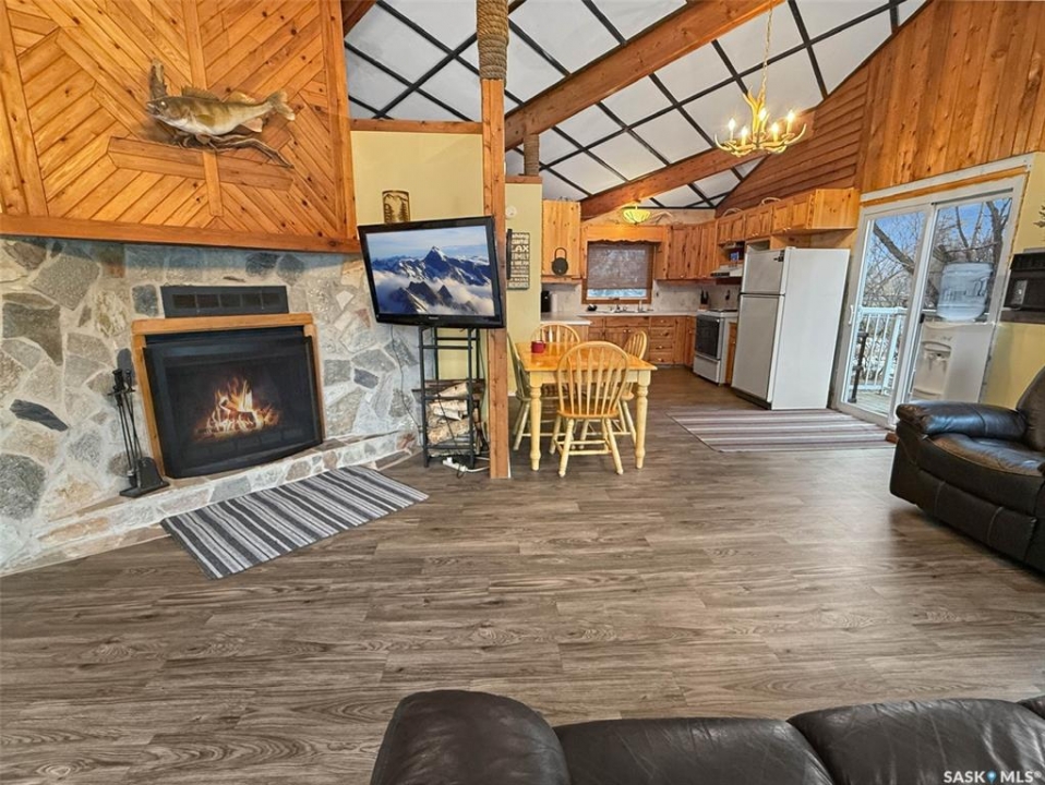 You've been searching for the perfect cabin in the highly sought-after resort village of Beaver Flat — your time has come. This modern chalet-style cabin on desirable Otter cres. is tucked into the trees and offers rare curb appeal with a generous wraparound deck (2017) overlooking the lake and mature landscaping. A single-car 14' x 24' garage with metal roof has been adapted to accommodate a boat. A community greenspace and park lie just to the rear. Inside, abundant natural light pours through perfectly situated windows onto an open-concept living area. Vaulted, open-beam ceilings and warm pine finishes create a welcoming alpine atmosphere. The kitchen is well-proportioned, featuring pine cabinetry, a double sink beneath a front-facing window, and seamless flow to the dining and living spaces. Updated vinyl plank flooring, pendant lighting, and a cozy wood-burning fireplace with mantle complete the main level. This level includes two bedrooms — a primary with laundry — and a four-piece bathroom. The finished lower level is ideal for evening gatherings, with a roomy den currently set up for games and TV, large windows, a third bedroom, a two-piece bath, storage and utility space (water system, water heater, electrical panel). Other features include air conditioning and an included deep freeze Situated one row in from the water and seconds from the boat launch, the resort community offers convenience store amenities, parks and excellent fishing. This cabin captures effortless lake-life charm — equally suited as a hunting or fishing retreat or a contemporary lakeside getaway. Schedule a private showing to experience it in person.