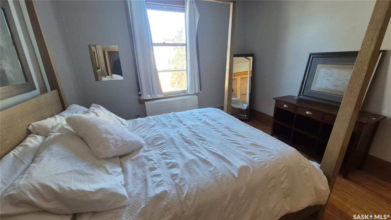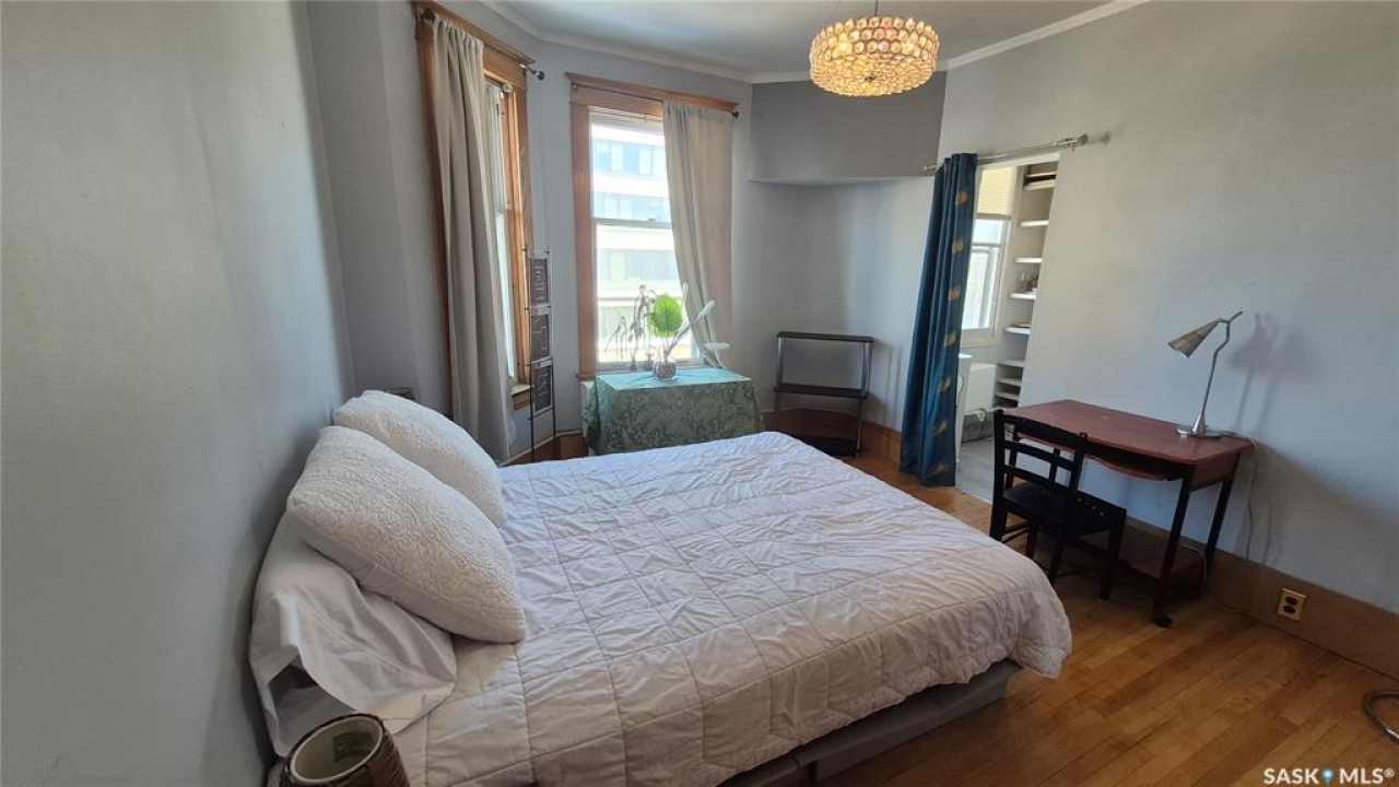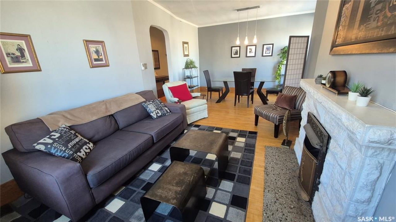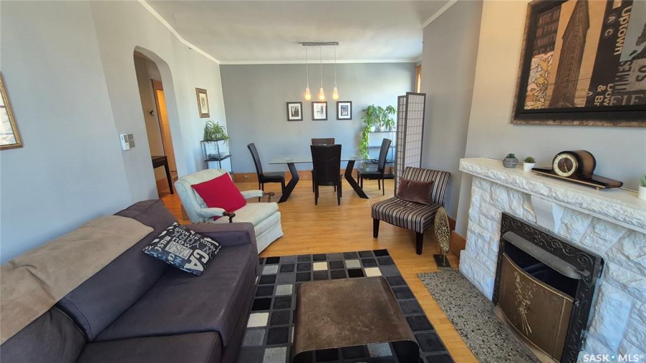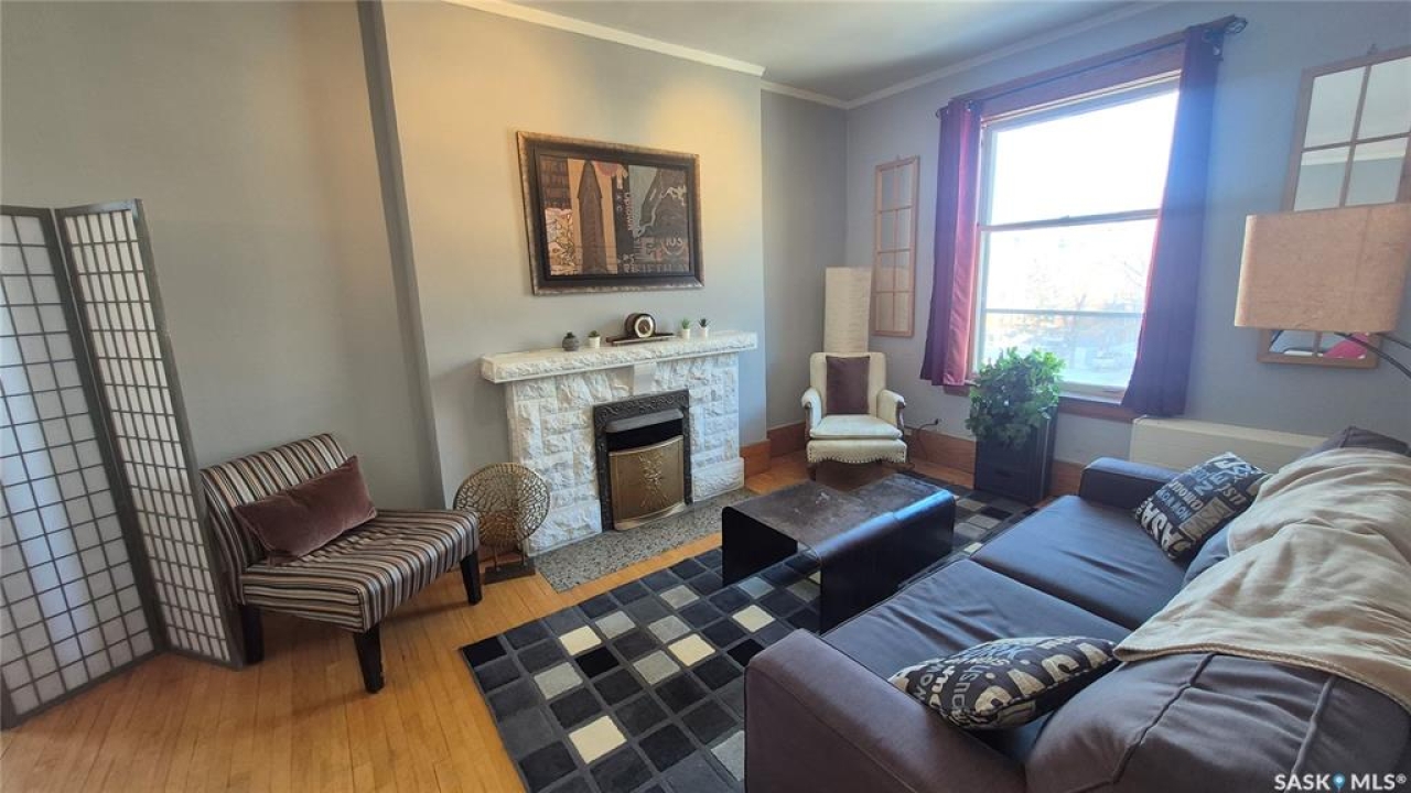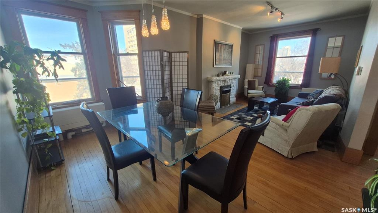 Welcome to this charming top-floor corner-unit condo in the historic Bartleman Building, ideally located in the heart of downtown Regina, just two blocks from beautiful Wascana Park. Offering 889 sq. ft. of living space, this home blends character, comfort, and convenience in a truly walkable location. Step inside to a bright, open-concept living and dining area where extra windows of the corner unit flood the space with natural light, highlighting the home's high ceilings and timeless architectural details, including original trim, tall baseboards, and classic doors. Hardwood flooring and a decorative fireplace add warmth and charm, creating an inviting space to relax or entertain. An elegant archway leads to the kitchen. The bright white kitchen provides ample counter space and comes complete with a fridge, stove, built-in dishwasher, and durable vinyl flooring. A garden door extends your living space outdoors to a private patio, the perfect place to enjoy morning coffee or unwind after a long day. The spacious primary bedroom easily accommodates a king-sized bed and is located next to the 4-piece bathroom, which features vinyl flooring, a tiled tub/shower combination, and additional storage. The large second bedroom includes hardwood flooring and a walk-in closet, making it ideal for guests, a home office, or additional living space. Additional highlights include one dedicated parking stall, ample street parking for visitors, and extra storage in the basement. What truly sets this condo apart is the lifestyle it offers. Downtown professionals will appreciate being able to walk to work, enjoy nearby cafés and restaurants, or spend time outdoors at Wascana Park. Local favourites such as Tangerine, Fireside Bistro, Niche Yoga & Therapy, Leo's OG, the Royal Saskatchewan Museum, and the shops along 13th Avenue are all just minutes away on foot. This is a rare opportunity to own a character-filled condo that's looking for the next perfect owner to call it home!