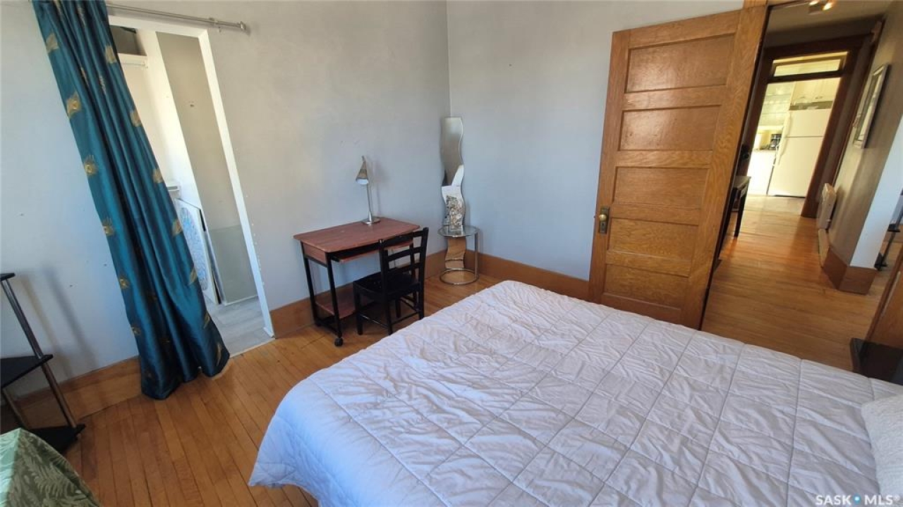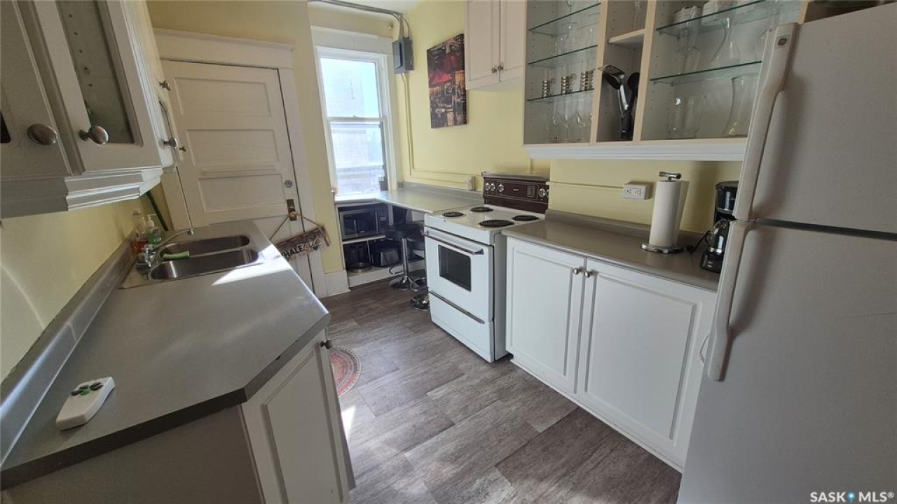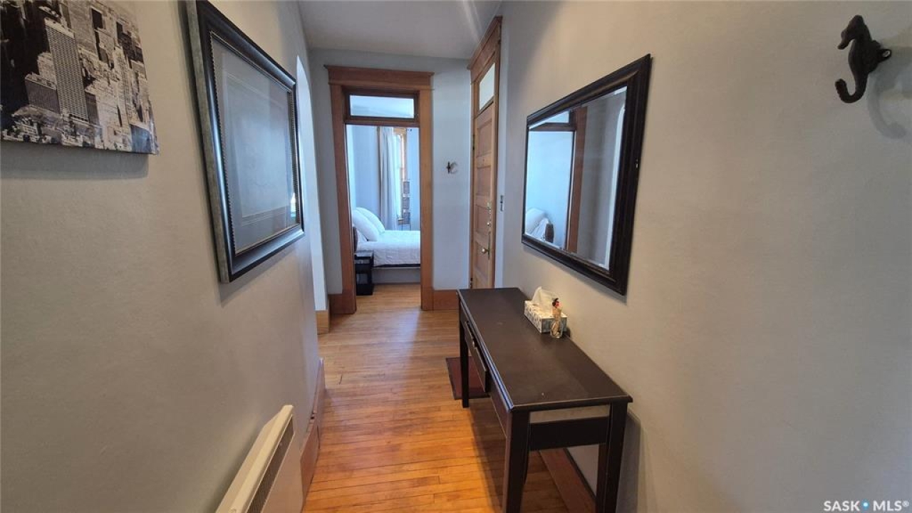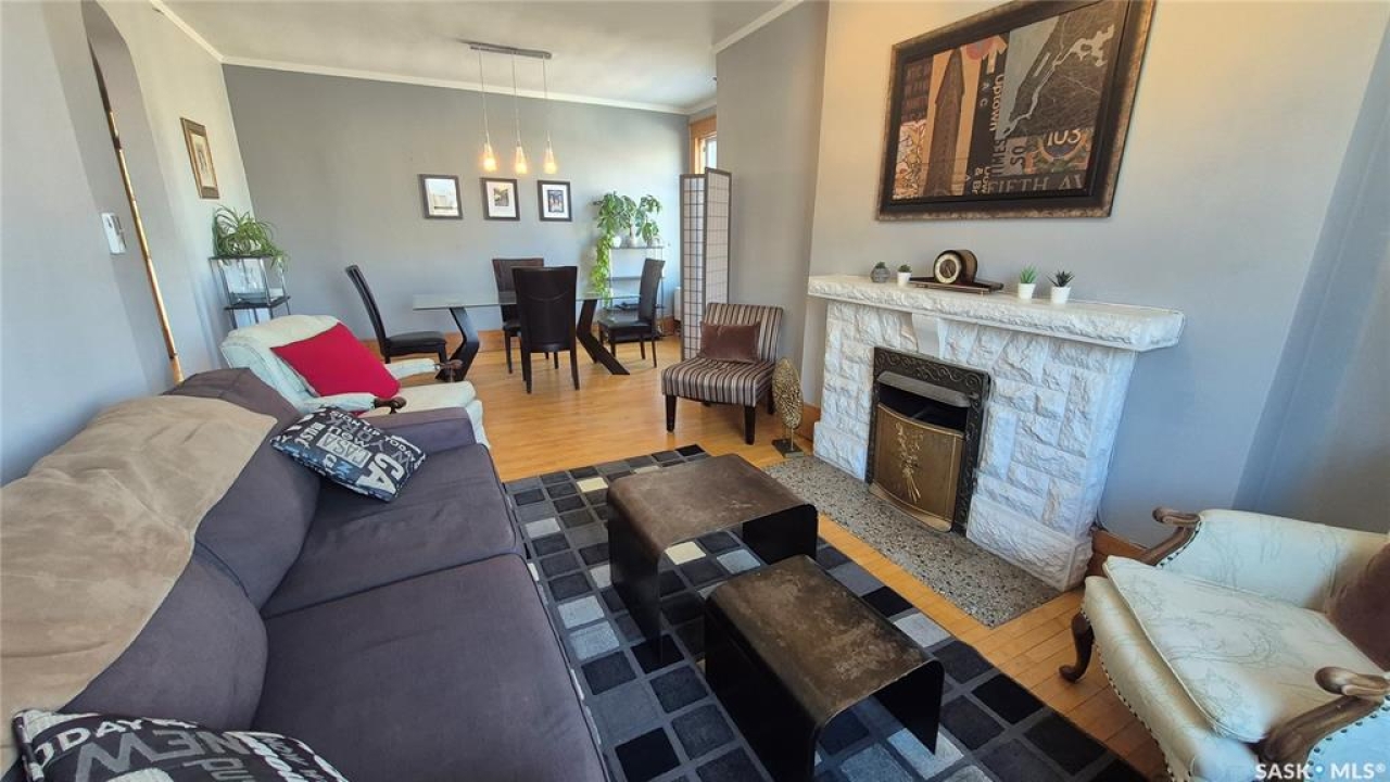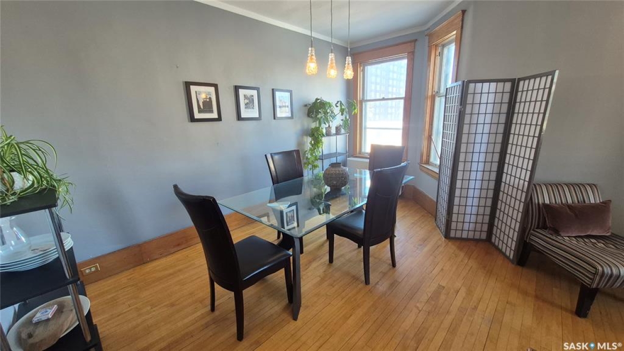 Welcome to this charming top-floor corner-unit condo in the historic Bartleman Building, ideally located in the heart of downtown Regina, just two blocks from beautiful Wascana Park. Offering 889 sq. ft. of living space, this home blends character, comfort, and convenience in a truly walkable location. Step inside to a bright, open-concept living and dining area where extra windows of the corner unit flood the space with natural light, highlighting the home's high ceilings and timeless architectural details, including original trim, tall baseboards, and classic doors. Hardwood flooring and a decorative fireplace add warmth and charm, creating an inviting space to relax or entertain. An elegant archway leads to the kitchen. The bright white kitchen provides ample counter space and comes complete with a fridge, stove, built-in dishwasher, and durable vinyl flooring. A garden door extends your living space outdoors to a private patio, the perfect place to enjoy morning coffee or unwind after a long day. The spacious primary bedroom easily accommodates a king-sized bed and is located next to the 4-piece bathroom, which features vinyl flooring, a tiled tub/shower combination, and additional storage. The large second bedroom includes hardwood flooring and a walk-in closet, making it ideal for guests, a home office, or additional living space. Additional highlights include one dedicated parking stall, ample street parking for visitors, and extra storage in the basement. What truly sets this condo apart is the lifestyle it offers. Downtown professionals will appreciate being able to walk to work, enjoy nearby cafés and restaurants, or spend time outdoors at Wascana Park. Local favourites such as Tangerine, Fireside Bistro, Niche Yoga & Therapy, Leo's OG, the Royal Saskatchewan Museum, and the shops along 13th Avenue are all just minutes away on foot. This is a rare opportunity to own a character-filled condo that's looking for the next perfect owner to call it home!