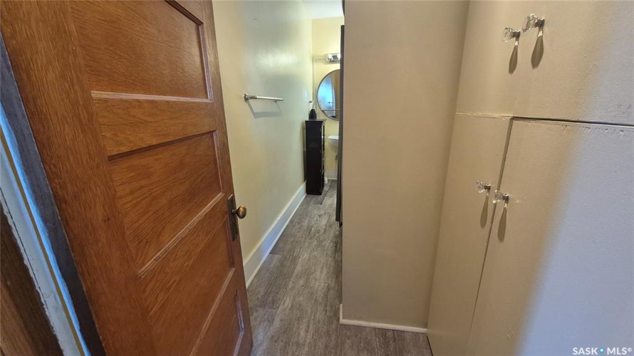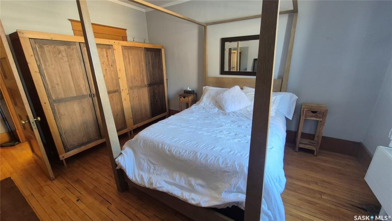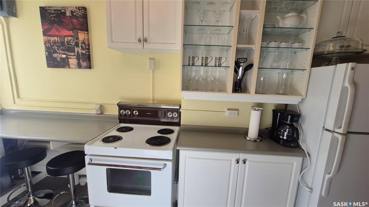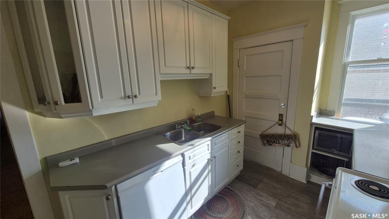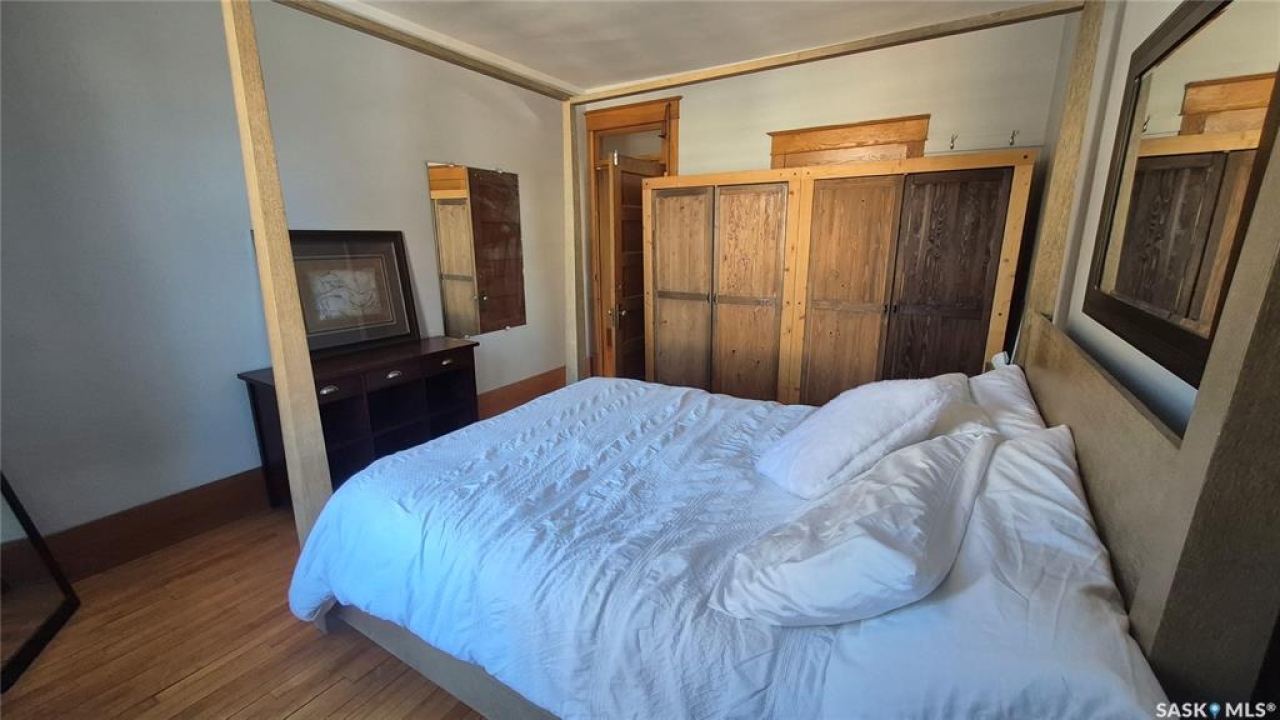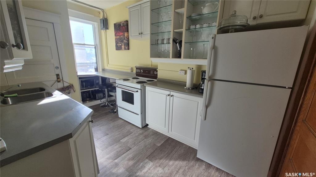 Welcome to this charming top-floor corner-unit condo in the historic Bartleman Building, ideally located in the heart of downtown Regina, just two blocks from beautiful Wascana Park. Offering 889 sq. ft. of living space, this home blends character, comfort, and convenience in a truly walkable location. Step inside to a bright, open-concept living and dining area where extra windows of the corner unit flood the space with natural light, highlighting the home's high ceilings and timeless architectural details, including original trim, tall baseboards, and classic doors. Hardwood flooring and a decorative fireplace add warmth and charm, creating an inviting space to relax or entertain. An elegant archway leads to the kitchen. The bright white kitchen provides ample counter space and comes complete with a fridge, stove, built-in dishwasher, and durable vinyl flooring. A garden door extends your living space outdoors to a private patio, the perfect place to enjoy morning coffee or unwind after a long day. The spacious primary bedroom easily accommodates a king-sized bed and is located next to the 4-piece bathroom, which features vinyl flooring, a tiled tub/shower combination, and additional storage. The large second bedroom includes hardwood flooring and a walk-in closet, making it ideal for guests, a home office, or additional living space. Additional highlights include one dedicated parking stall, ample street parking for visitors, and extra storage in the basement. What truly sets this condo apart is the lifestyle it offers. Downtown professionals will appreciate being able to walk to work, enjoy nearby cafés and restaurants, or spend time outdoors at Wascana Park. Local favourites such as Tangerine, Fireside Bistro, Niche Yoga & Therapy, Leo's OG, the Royal Saskatchewan Museum, and the shops along 13th Avenue are all just minutes away on foot. This is a rare opportunity to own a character-filled condo that's looking for the next perfect owner to call it home!