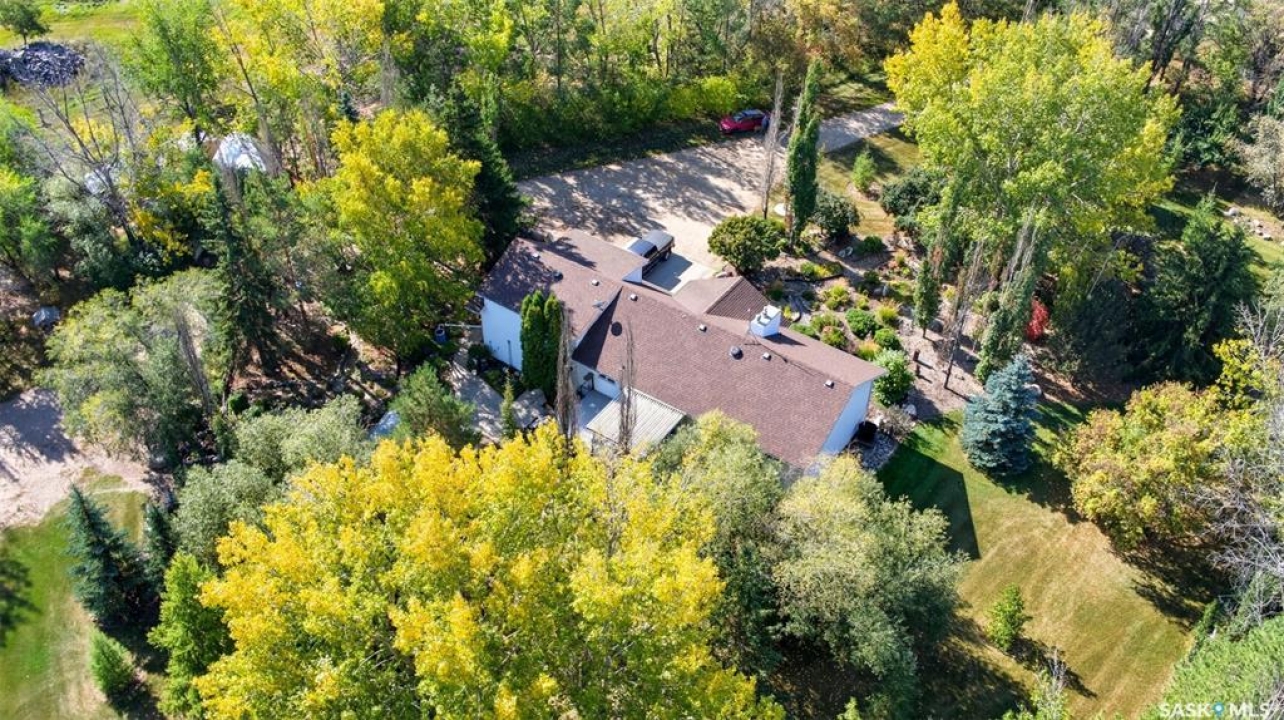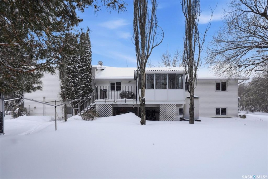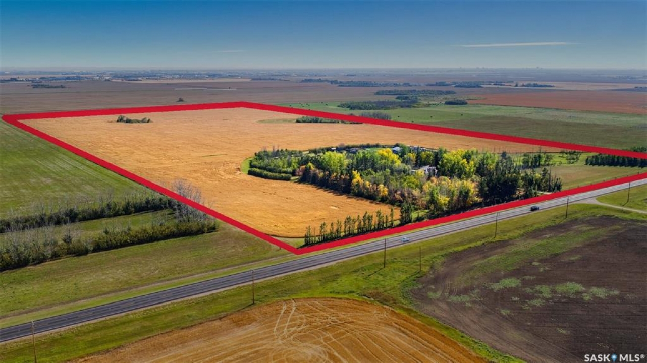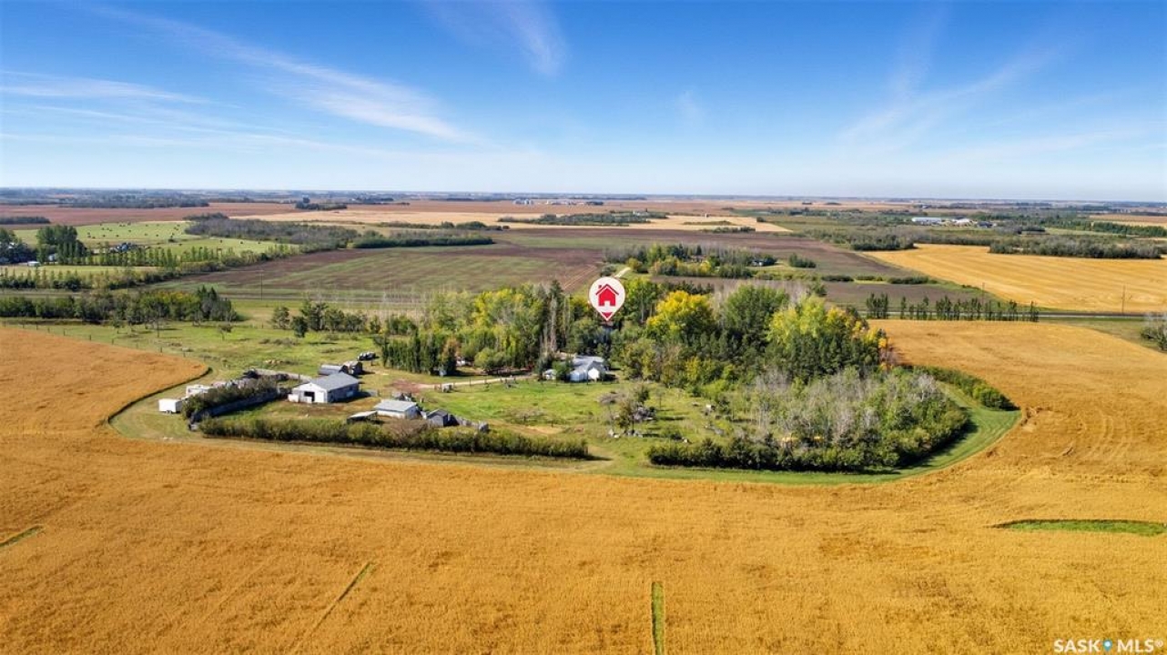 What a great 80 acre acreage!. This stunning bi-level boasts tons of light, 4 large bedrooms including a 472 sq ft Primary bedroom! Vaulted ceilings in living room with a massive stone fireplace. Basement has a steel beam allowing for a stunning new build-out with oversized windows. City water and natural gas to the home. Oversized 26x22 garage with easy addition to 4 or 6 car garage possiblility. Nicely situated on pavement West of Saskatoon approximately 6 minutes. Many outbuildings (barn). Prime grain land is leased by a local farmer.