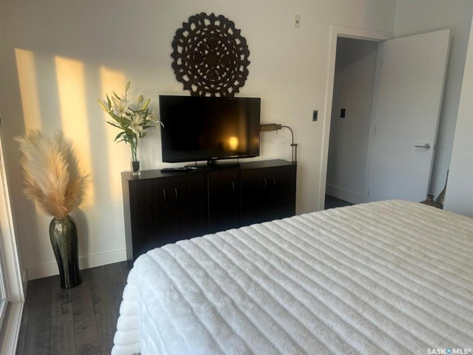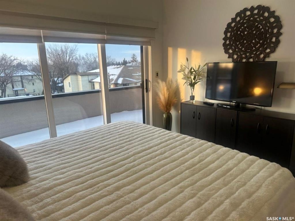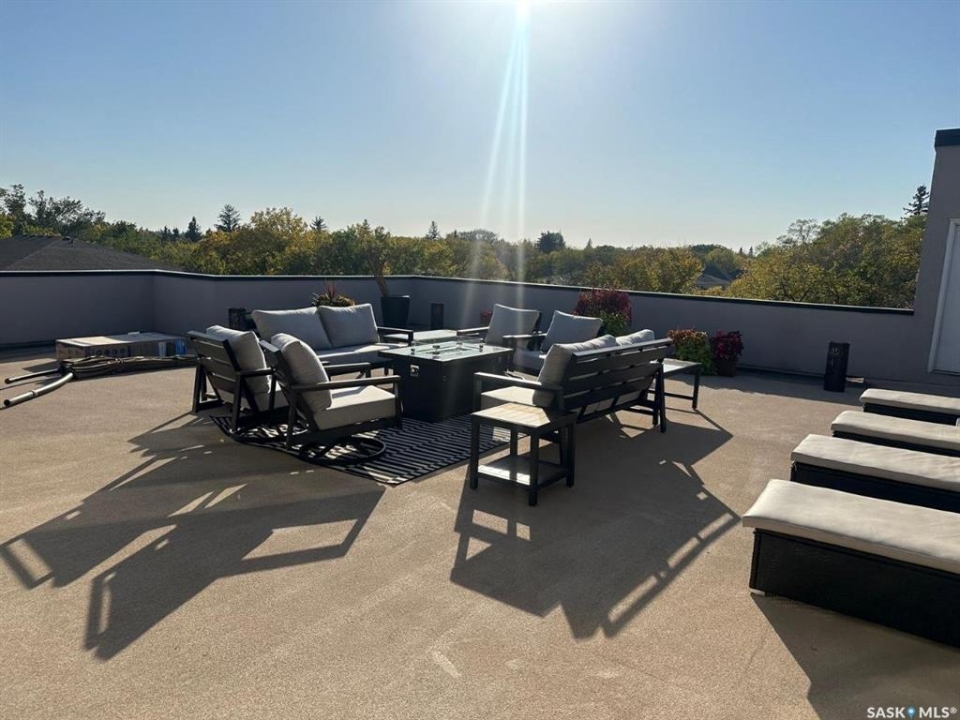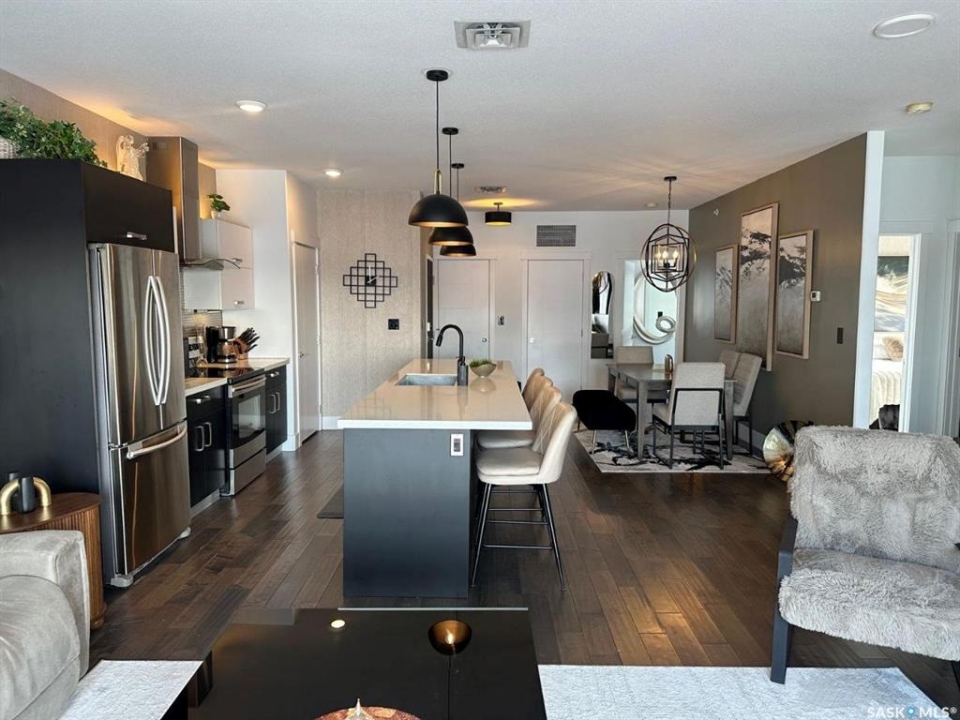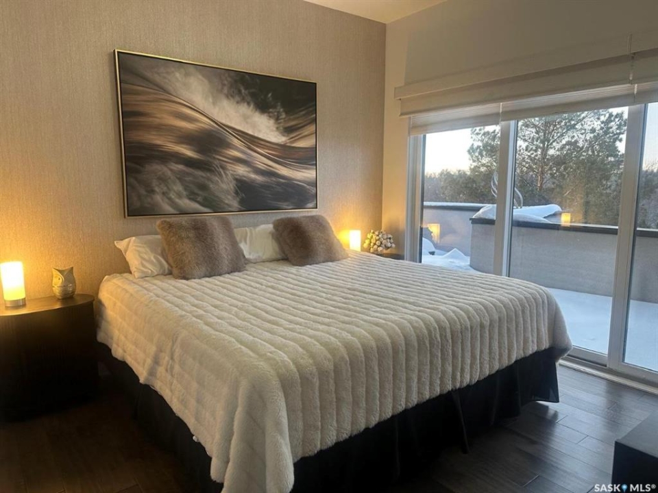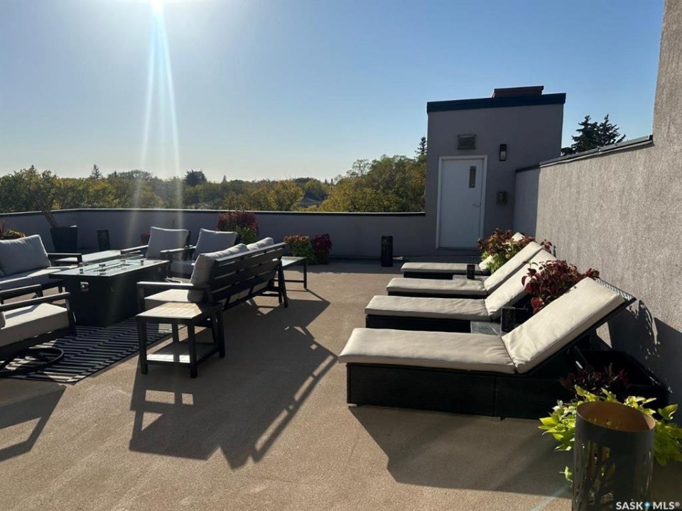 Penthouse condo with amazing outdoor space, 3 bedrooms, 2 bathrooms, and a huge 1,800 sq.ft. private patio! The unit features engineered hardwood flooring in the living, dining, and kitchen areas. Quartz countertops throughout, with the kitchen showcasing two-tone cabinets. All new light fixtures. New window coverings. The living room and master bedroom both have remote-controlled Hunter Douglas blinds. The laundry area includes double cabinets for extra storage. There are 5 patio doors. The unit comes with two parking stalls: one underground (tandem) stall #23 and one surface stall #404. The large 1,800 sq. ft. balcony is perfect for entertaining. Additional features include an individual furnace, central air, and a spacious storage/laundry room. Two small pets are allowed. The West Coast style combined with East Coast energy gives TriBeCa its unique vibe, making it one of Saskatoon's most desirable and vibrant areas. This striking building truly captures attention. It is ideally located with great proximity to the University of Saskatchewan, Broadway, and Downtown.