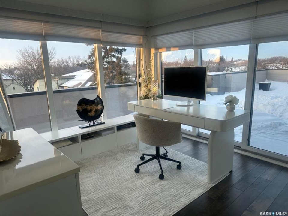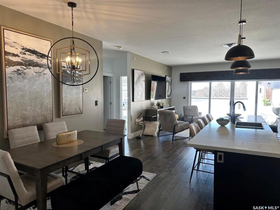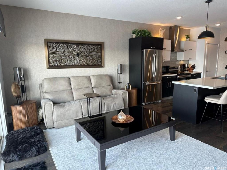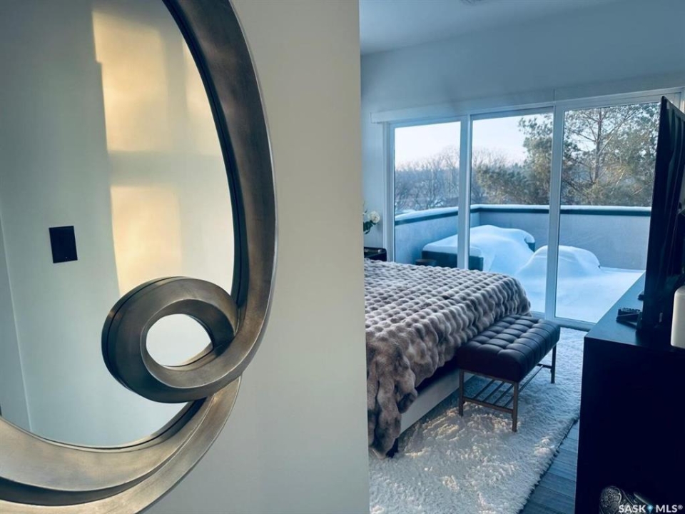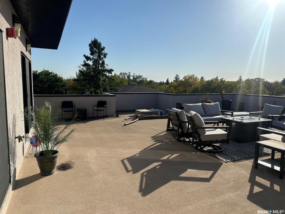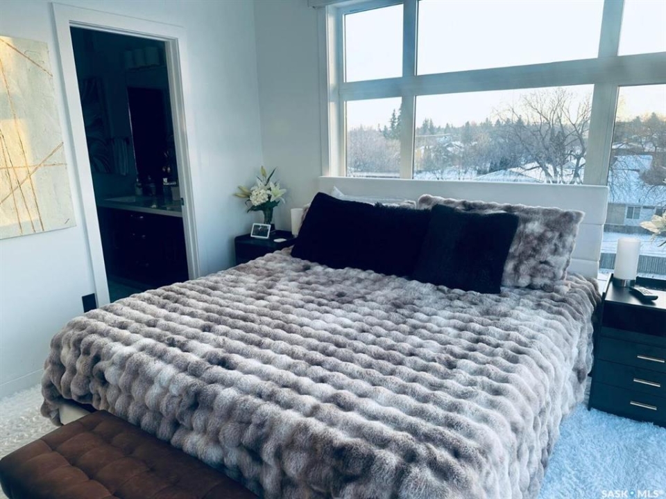 Penthouse condo with amazing outdoor space, 3 bedrooms, 2 bathrooms, and a huge 1,800 sq.ft. private patio! The unit features engineered hardwood flooring in the living, dining, and kitchen areas. Quartz countertops throughout, with the kitchen showcasing two-tone cabinets. All new light fixtures. New window coverings. The living room and master bedroom both have remote-controlled Hunter Douglas blinds. The laundry area includes double cabinets for extra storage. There are 5 patio doors. The unit comes with two parking stalls: one underground (tandem) stall #23 and one surface stall #404. The large 1,800 sq. ft. balcony is perfect for entertaining. Additional features include an individual furnace, central air, and a spacious storage/laundry room. Two small pets are allowed. The West Coast style combined with East Coast energy gives TriBeCa its unique vibe, making it one of Saskatoon's most desirable and vibrant areas. This striking building truly captures attention. It is ideally located with great proximity to the University of Saskatchewan, Broadway, and Downtown.