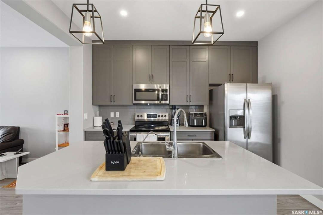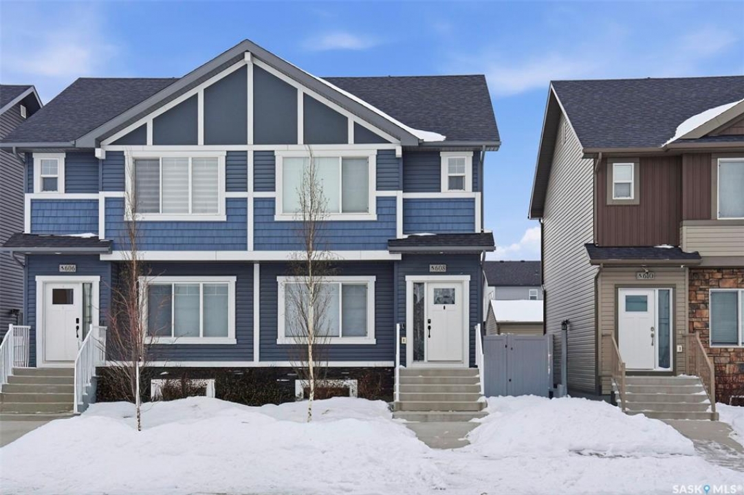 Step into elevated everyday living at 608 Brighton Gate, a stunning two-storey semi-detached home in the vibrant and highly sought-after Brighton neighbourhood of Saskatoon. Offering 3 bedrooms, 3 bathrooms, and 1,363 sq. ft. of beautifully maintained living space, this home blends modern design with exceptional functionality. The main floor showcases a stylish kitchen featuring quartz countertops, custom cabinetry, stainless steel appliances, and a spacious island,perfect for cooking, gathering, and entertaining. The open-concept layout flows effortlessly into the bright dining and living areas, creating a warm and welcoming atmosphere. Upstairs, retreat to a spacious primary suite complete with a walk-in closet and spa-inspired ensuite. Two additional bedrooms, a well-appointed 3-piece bathroom, and convenient second-floor laundry complete the upper level. Enjoy unbeatable convenience with public transit within walking distance and a school bus stop just steps from the corner. You're also only a short stroll from Brighton Marketplace, Landmark Cinemas, and Motion Fitness—bringing shopping, dining, and entertainment right to your doorstep. The home also offers a legal basement suite option with potential eligibility for government construction grants an excellent opportunity for additional income. Step outside to a fully landscaped backyard featuring a generous deck, brick patio, lush lawn with underground sprinklers, and an insulated, drywalled double detached garage. Move-in ready and impeccably cared for, book your private showing today and experience all that this Brighton gem has to offer.