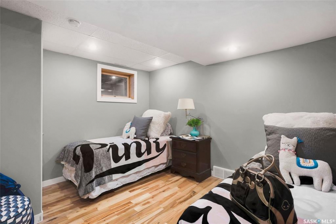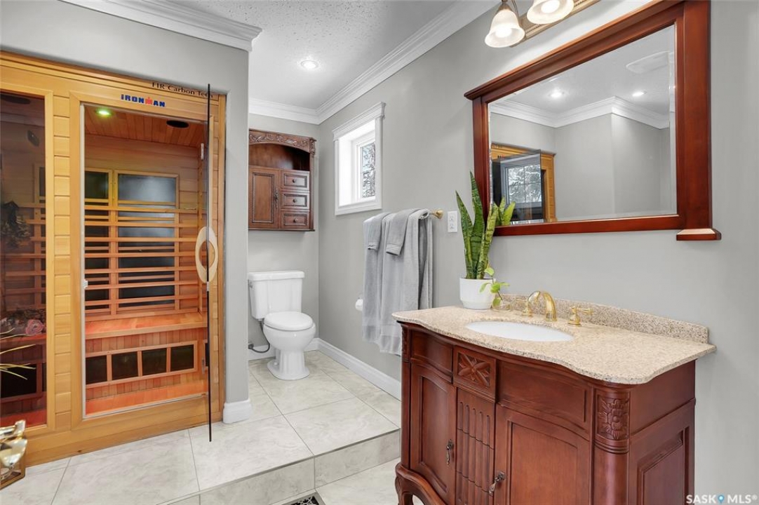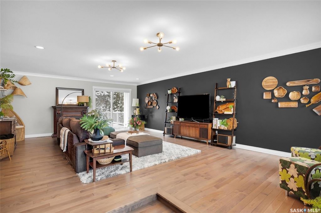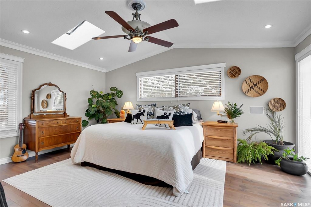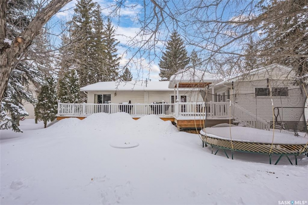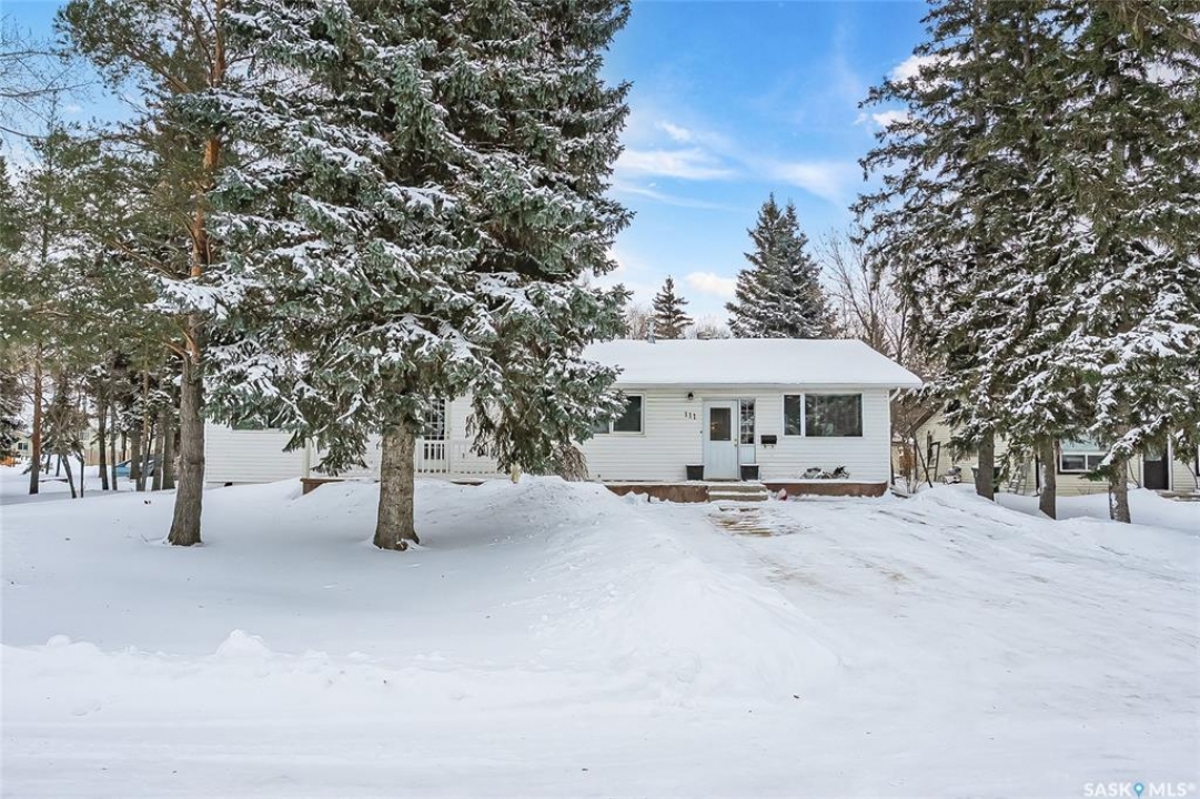 Welcome to 111 Norman Avenue in Aberdeen, where you get full on acreage energy without leaving town! Sitting on four lots wrapped in mature trees and privacy, this property feels like you're living at the lake, yet you're just minutes to Highway 11 for an easy commute to Warman, Saskatoon, or a quick escape north to Lakeland. This thoroughly updated bungalow brings the vibe with hardwood throughout the main floor, a bright modern 4-piece bath with updated plumbing (2025), and a primary bedroom that honestly feels like a boutique retreat — vaulted ceilings, skylight, built-in speakers, patio doors (replaced 2015) leading to the deck, plus a dreamy ensuite with soaker tub and your own dry sauna. The oversized living room (converted from the original attached garage) gives you that open, flexible space perfect for hosting, creating, or just spreading out, while the basement is wired for a projector so movie nights hit different. Major upgrades bring peace of mind: shingles redone in 2024, sewer line replaced from the town to the house (cost shared between seller and town), attic insulation topped up in 2022, plumbing updated in the kitchen in 2025, furnace tuned up with parts replaced in 2025, and appliances replaced in 2014 (fridge updated in 2016). With central air and thoughtful improvements throughout, this home is truly move-in ready….but the real flex? Two detached garages (single and double), with 220 power in the single garage, two driveways, nine off-street parking spots, RV parking, and endless room for hobbies, side hustles, car builds, boats, trailers, and all the toys. The massive back deck and private yard make everyday life feel like a weekend getaway. If you've been craving space, freedom, and a slower pace without sacrificing connection, this is that rare small-town lifestyle upgrade that just makes sense.