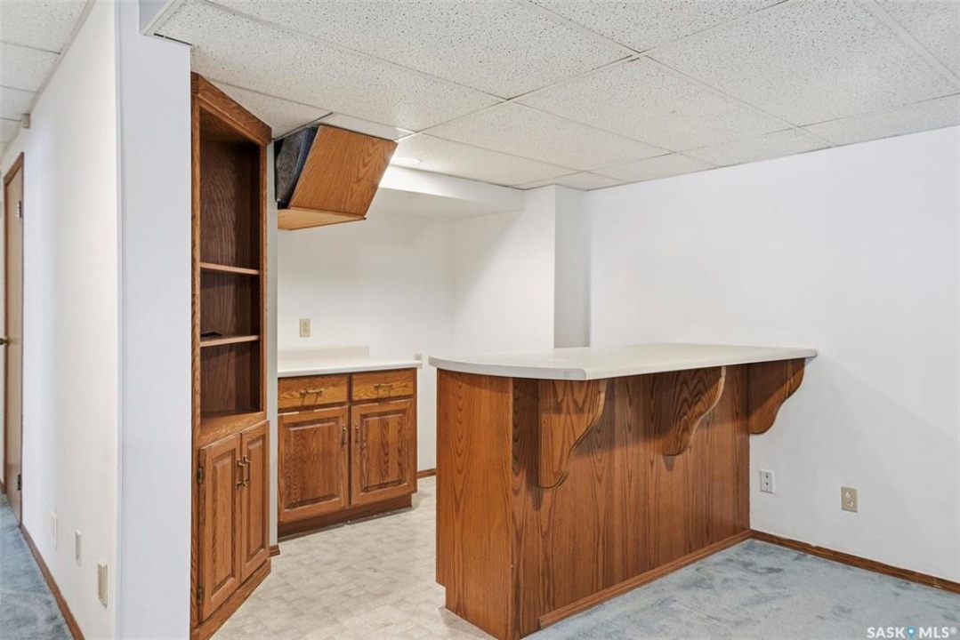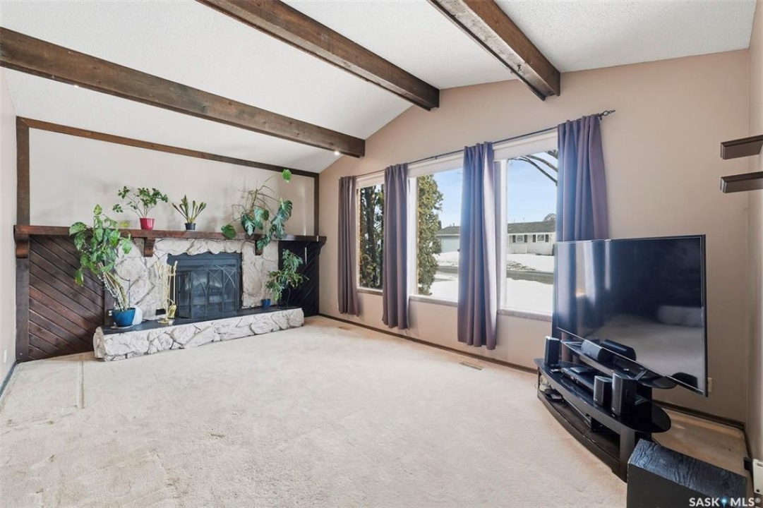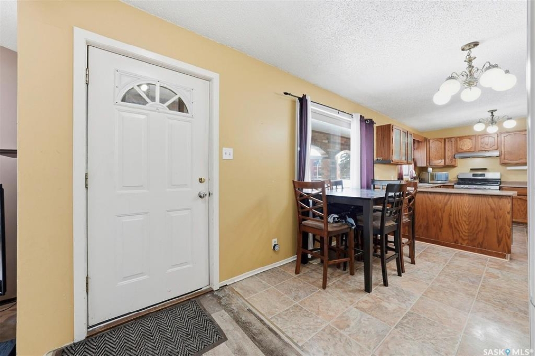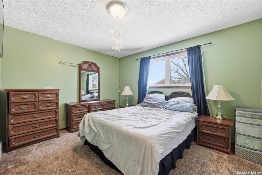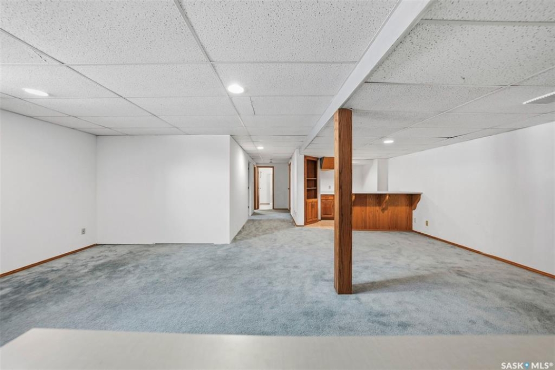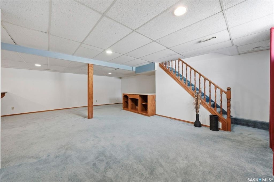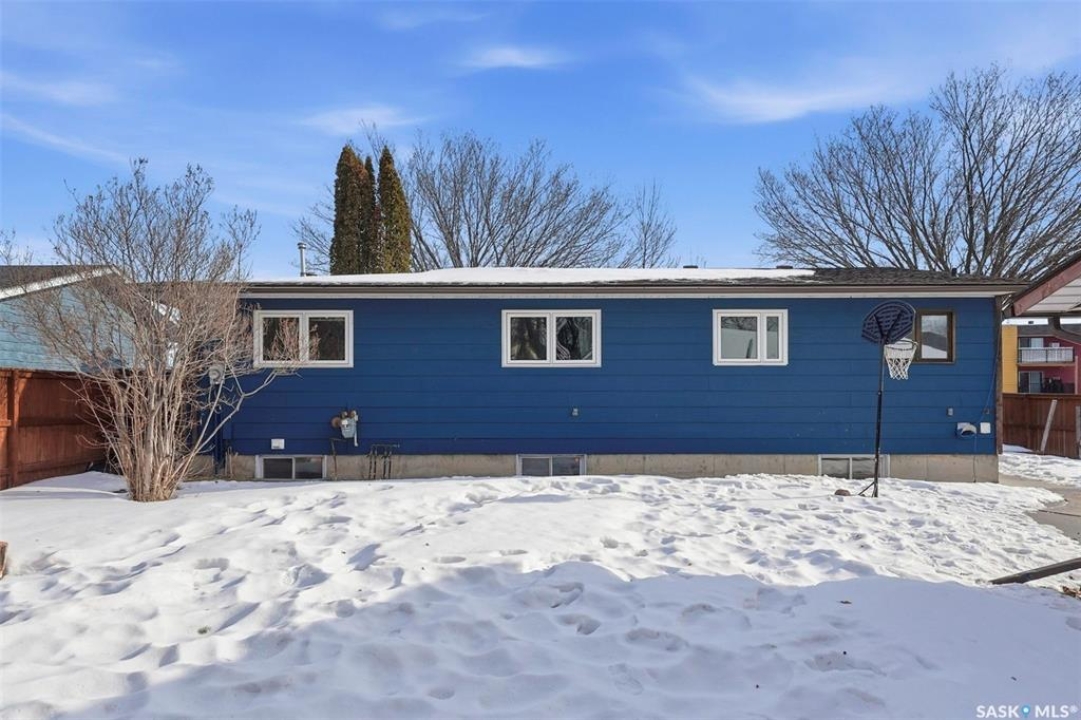Located in Meadowgreen, Saskatoon, this 1,316 sq. ft. family home sits on a large corner lot and offers a functional layout with plenty of space throughout. The main floor features a sunken living room with vaulted ceilings, large windows for natural light, and a fireplace. There are three bedrooms on this level along with a four-piece bathroom. The kitchen offers good workspace, and the main floor also includes a separate laundry room and coat/storage area. There is ample storage throughout the home with multiple closets and well-planned spaces. The basement is spacious and includes a built-in bar area, additional built-in shelving, two bedrooms, and a large utility/storage room. A covered patio-style front porch provides a nice sitting area overlooking the lawn. The backyard offers additional space with fruit trees, lawn area, and an insulated two car detached garage. Situated in an established Saskatoon neighbourhood, this property offers solid space and layout with room to make it your own.