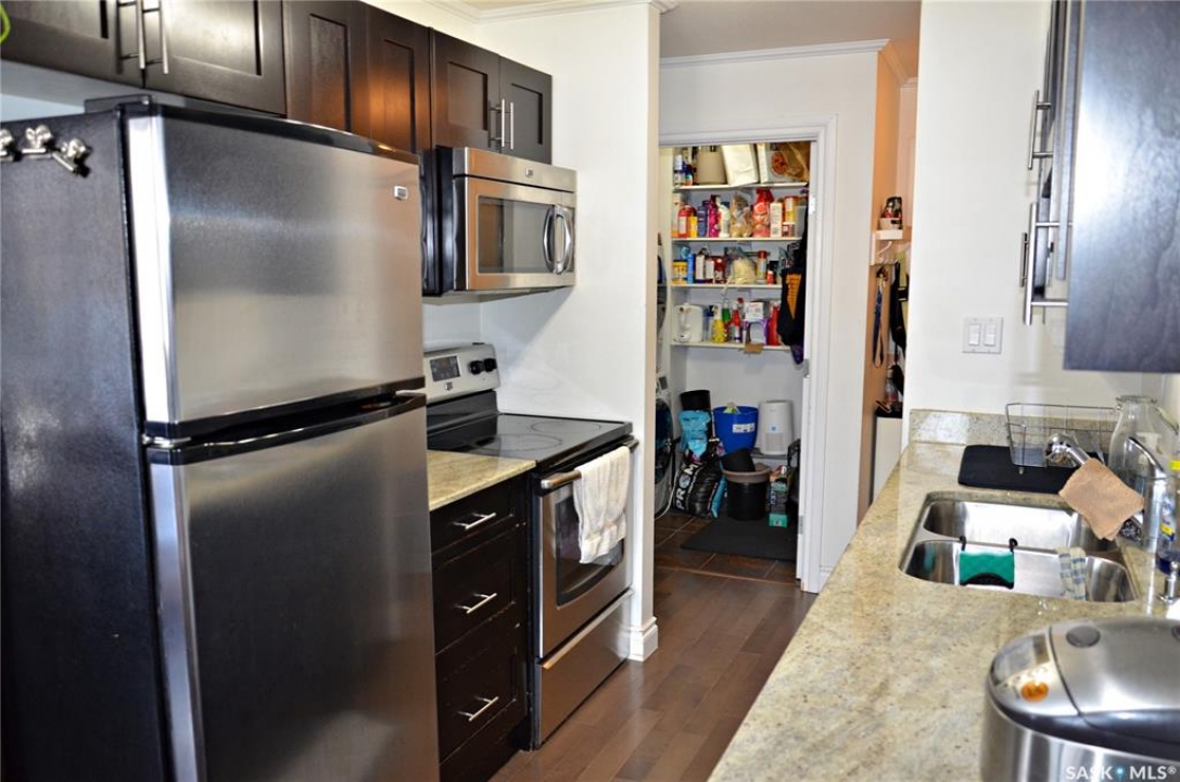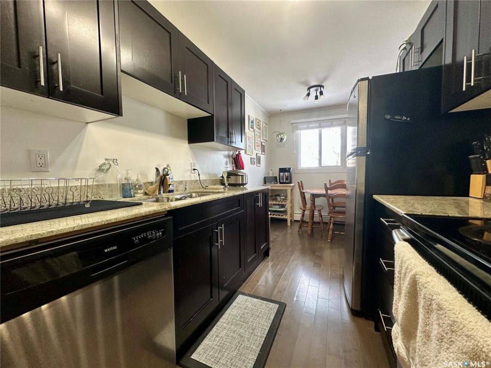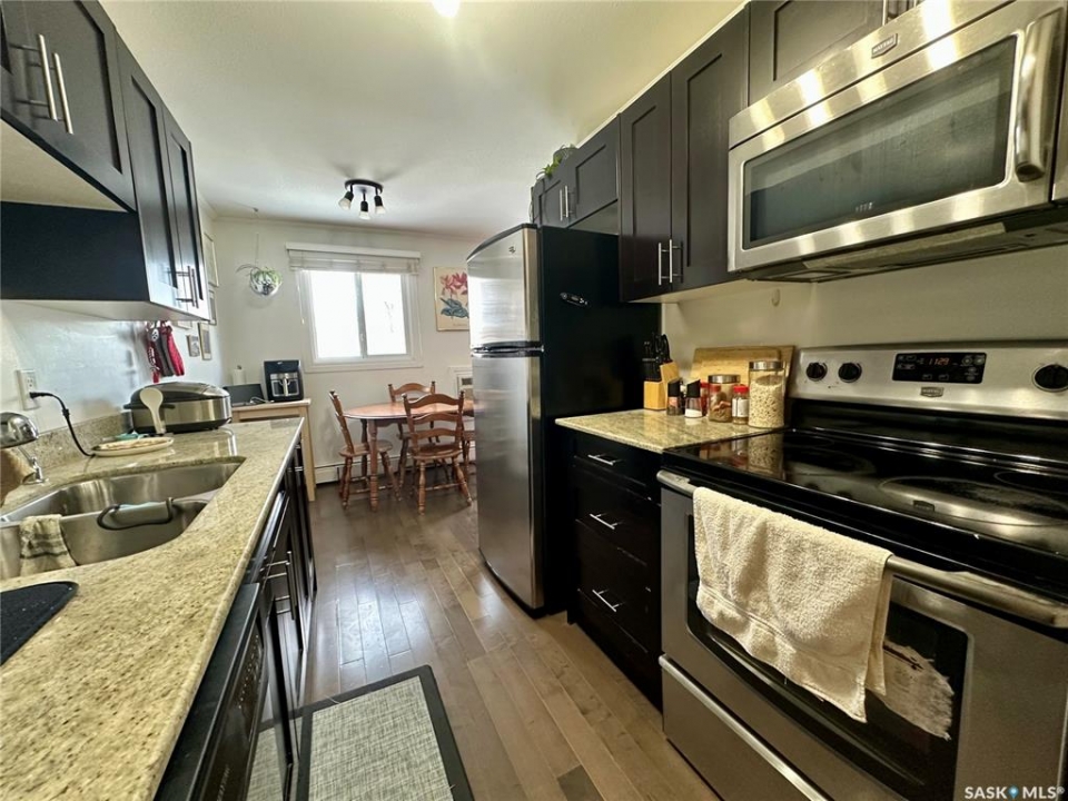 Welcome to 301 920 9th Street East! This fantastic condo is nestled in the highly sought-after Nutana neighborhood, it is a bright and beautifully updated top-floor corner condo that offers 774 square feet of living space, featuring two spacious bedrooms, a full bathroom, and in-suite laundry. The large entryway, crown moulding and abundant storage add to the appeal, while newer windows and a patio door fill the space with natural light. There is a large living room, dining space, a generous primary bedroom, and one dedicated parking stall. Don't miss out on this fantastic opportunity, call today for your private viewing!