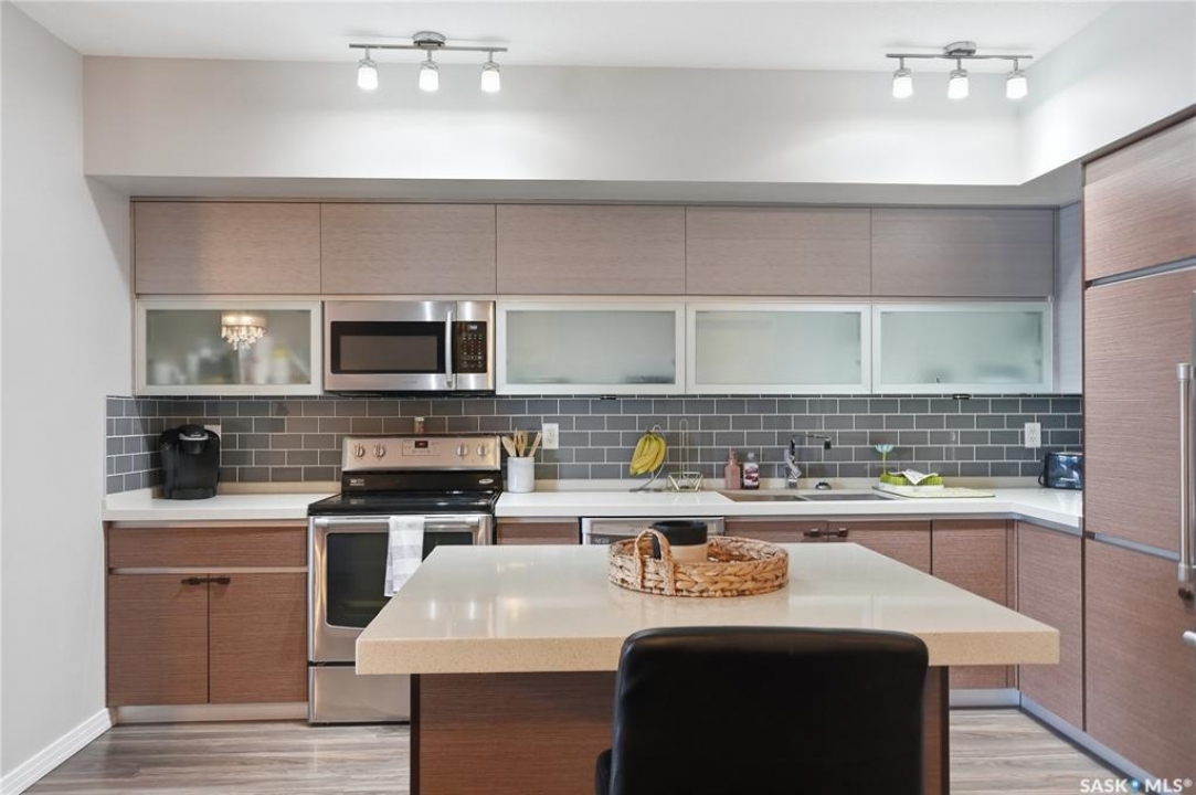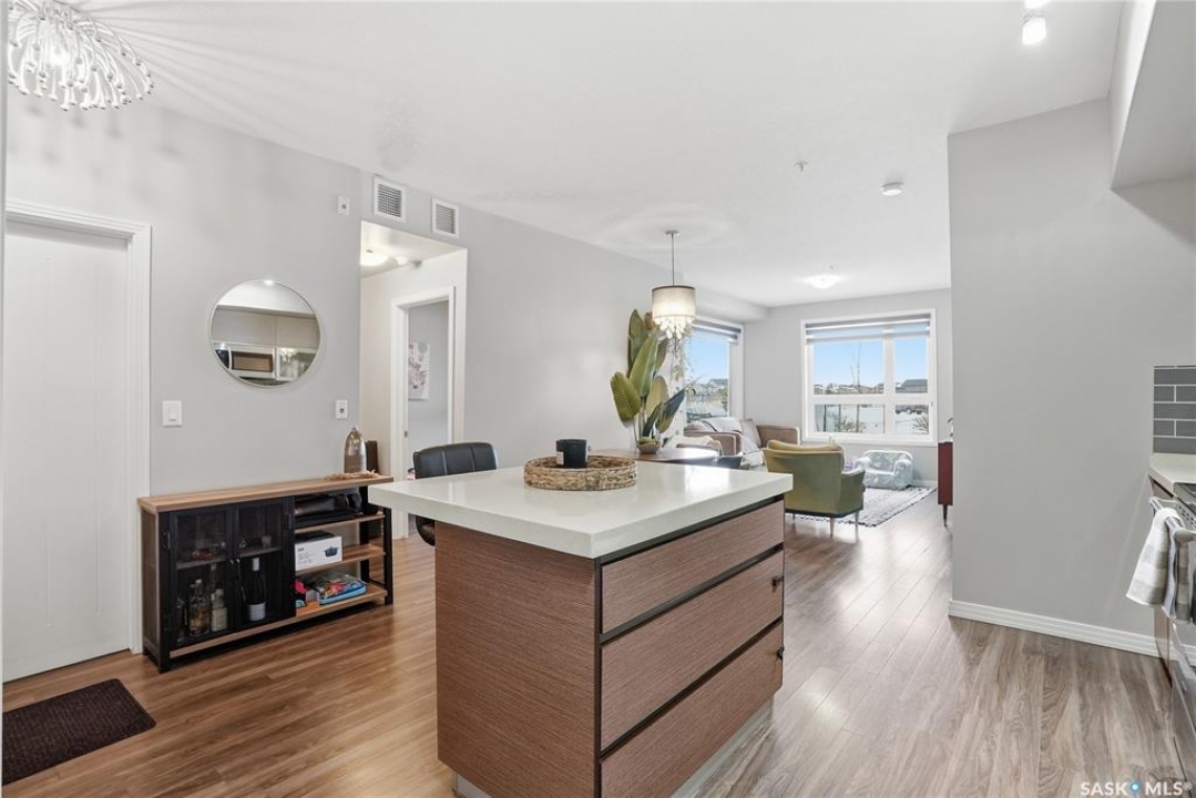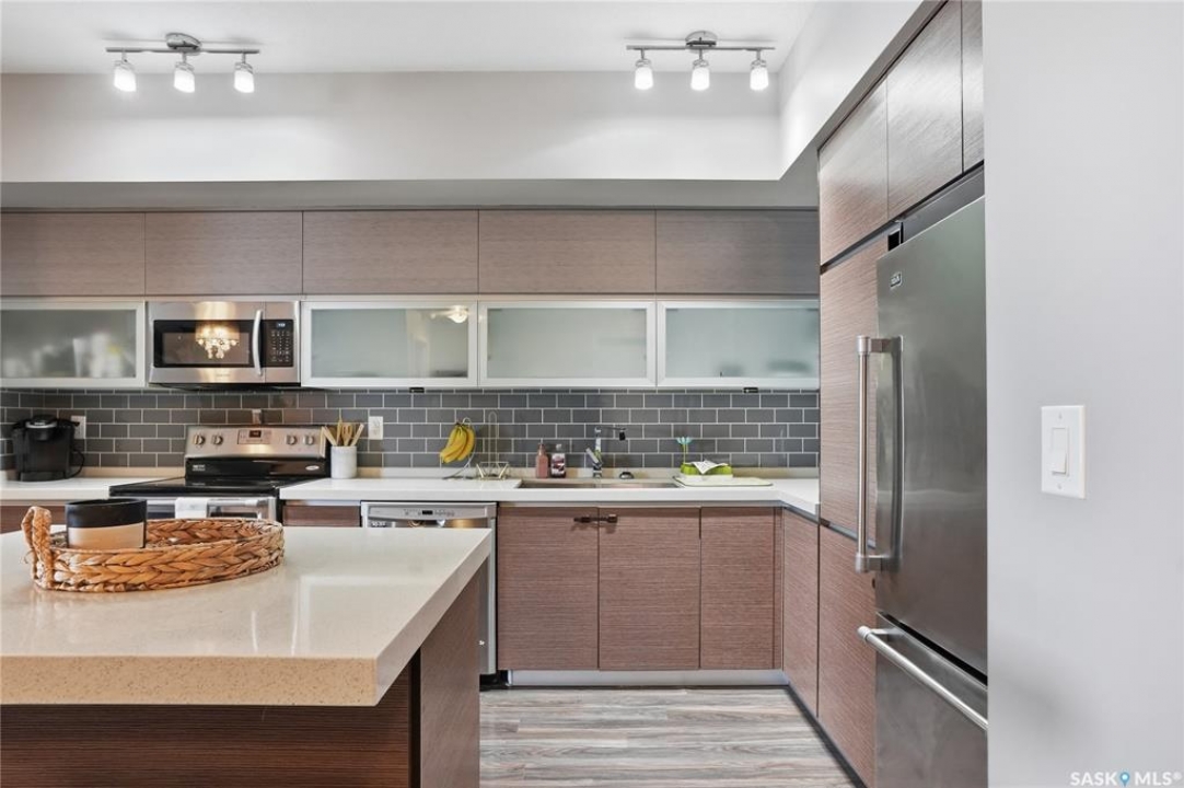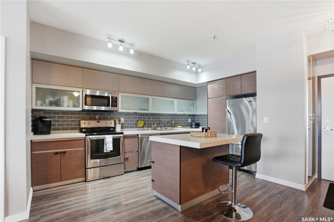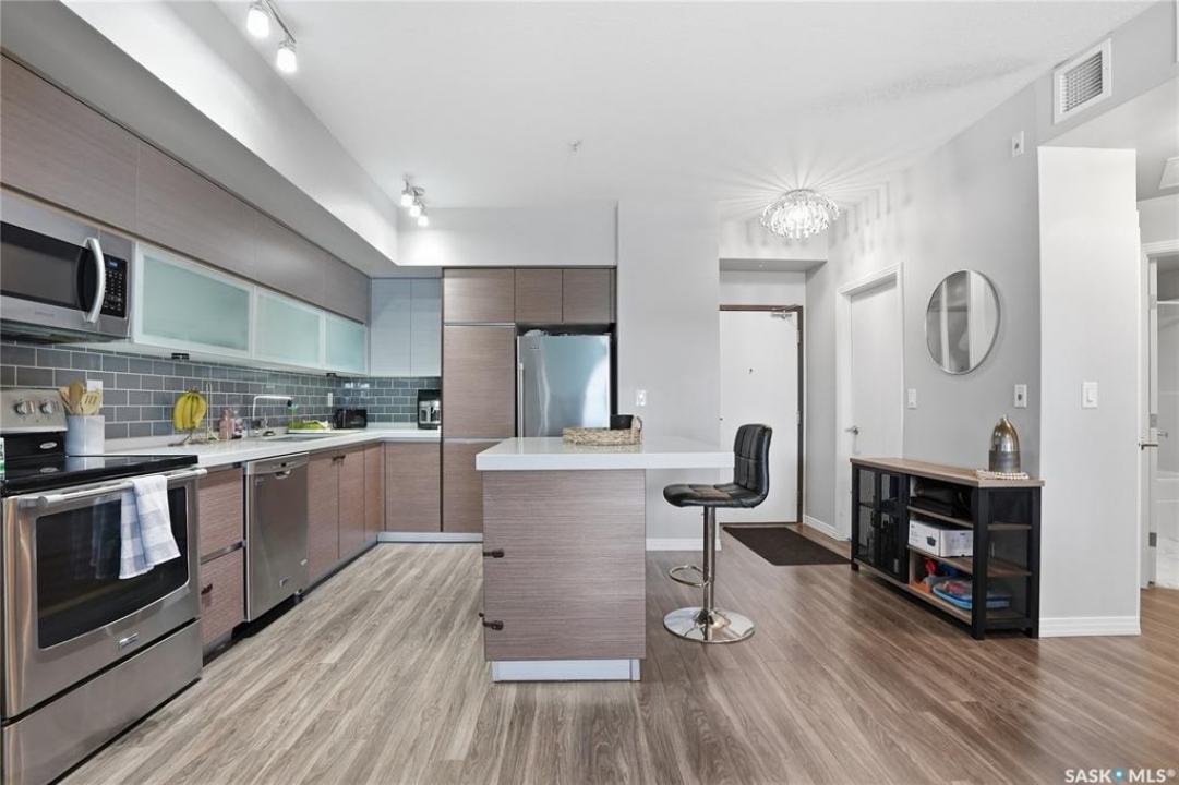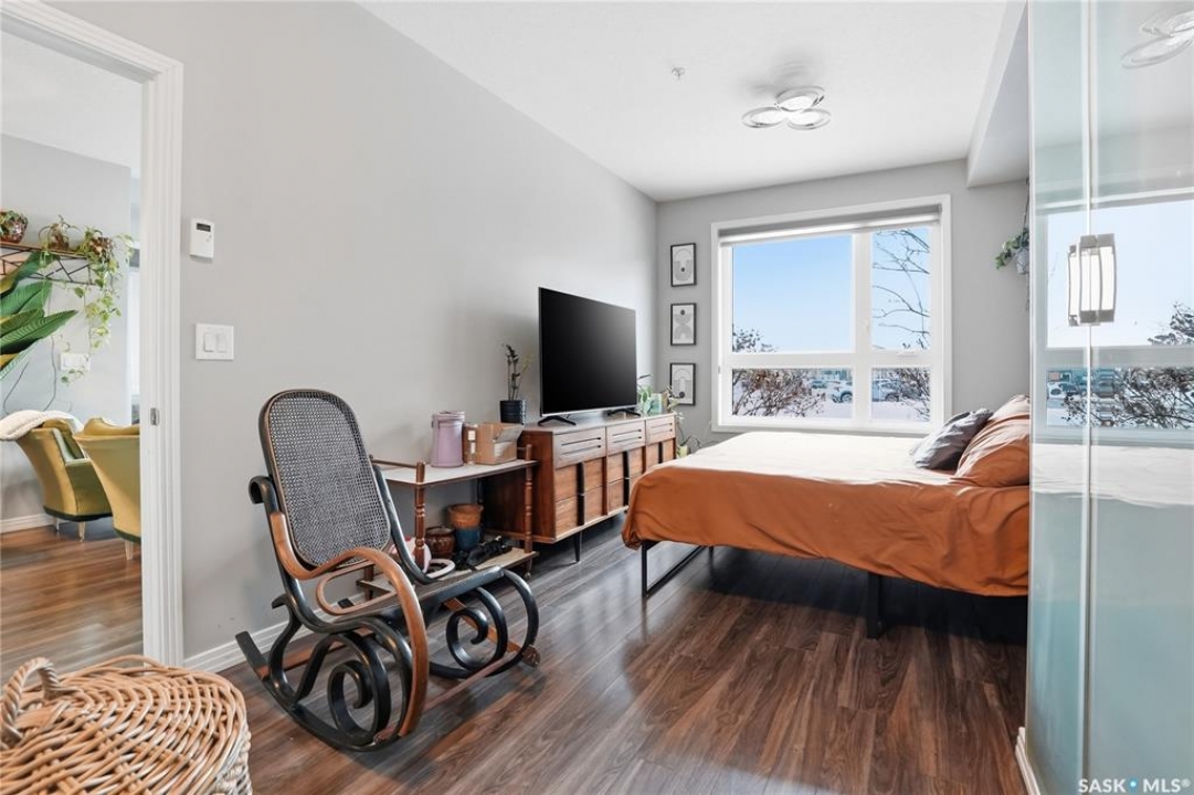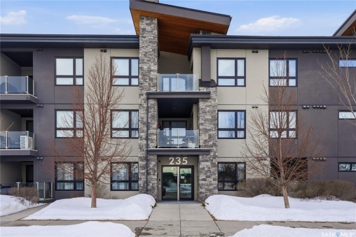 Welcome to Sequoia Square, where comfort meets convenience in this exceptionally maintained main-floor condo. This beautiful 2-bedroom, 2-bathroom home offers stylish living with the added bonus of direct exterior access — providing extra privacy and easy entry. Step inside to discover a bright, open-concept layout enhanced by soaring 9-foot ceilings and expansive windows that fill the space with natural light. The thoughtfully designed floor plan features forced air heating for consistent, year-round comfort. The contemporary kitchen is both functional and elegant, showcasing quartz countertops, stainless steel appliances, soft-close cabinetry, and a standalone island that offers additional prep space, storage, and casual seating. Seamlessly connected to the dining and living areas, it's perfectly suited for entertaining or relaxed everyday living. The spacious primary suite serves as a private retreat, complete with large windows, a refined dressing/closet area, and a modern ensuite featuring double sinks and a walk-in shower. A second well-sized bedroom, a full four-piece bathroom, and a convenient in-suite laundry and storage room complete the interior. Enjoy your morning coffee or unwind in the evening on the generous covered balcony — a perfect extension of your living space. Additional features include central air conditioning, one underground parking stall, and one electrified surface stall. Residents also enjoy access to a welcoming main lobby and recreation rooms on each floor. Ideally situated with quick access to the University of Saskatchewan and nearby amenities, this outstanding main-floor unit offers the perfect blend of style, function, and location.
