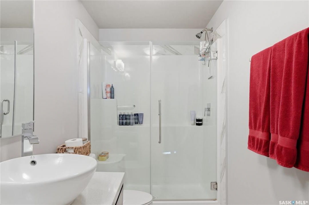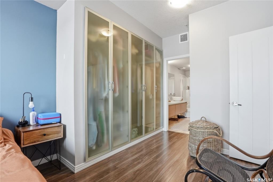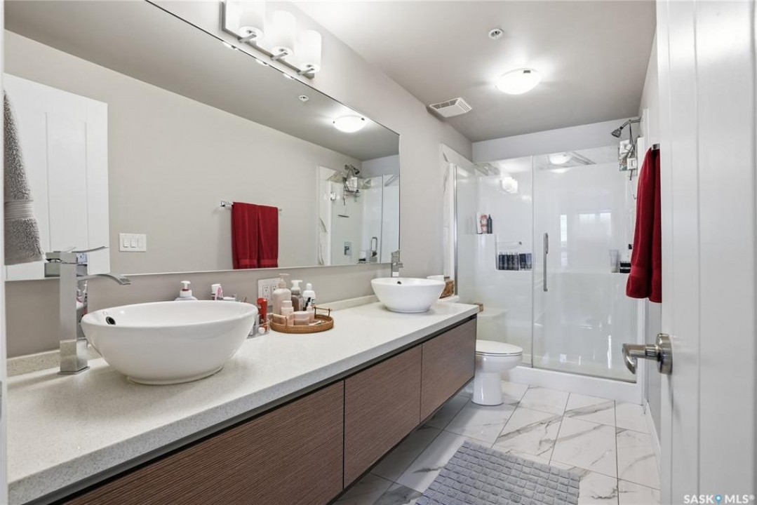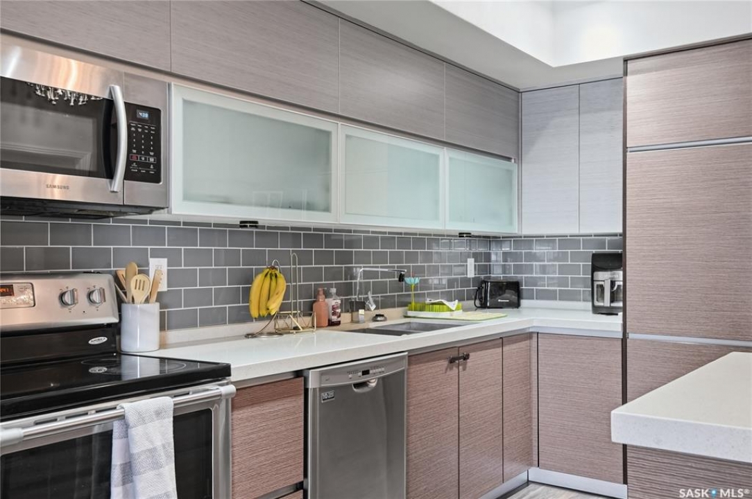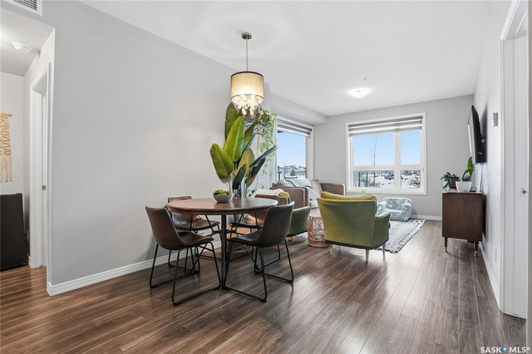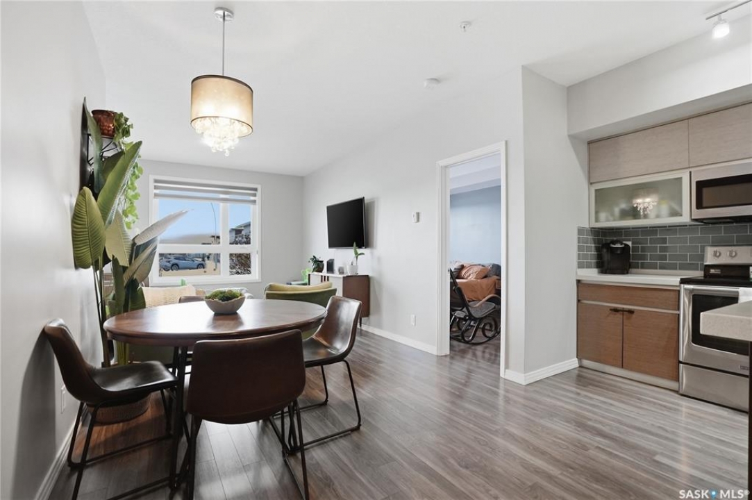 Welcome to Sequoia Square, where comfort meets convenience in this exceptionally maintained main-floor condo. This beautiful 2-bedroom, 2-bathroom home offers stylish living with the added bonus of direct exterior access — providing extra privacy and easy entry. Step inside to discover a bright, open-concept layout enhanced by soaring 9-foot ceilings and expansive windows that fill the space with natural light. The thoughtfully designed floor plan features forced air heating for consistent, year-round comfort. The contemporary kitchen is both functional and elegant, showcasing quartz countertops, stainless steel appliances, soft-close cabinetry, and a standalone island that offers additional prep space, storage, and casual seating. Seamlessly connected to the dining and living areas, it's perfectly suited for entertaining or relaxed everyday living. The spacious primary suite serves as a private retreat, complete with large windows, a refined dressing/closet area, and a modern ensuite featuring double sinks and a walk-in shower. A second well-sized bedroom, a full four-piece bathroom, and a convenient in-suite laundry and storage room complete the interior. Enjoy your morning coffee or unwind in the evening on the generous covered balcony — a perfect extension of your living space. Additional features include central air conditioning, one underground parking stall, and one electrified surface stall. Residents also enjoy access to a welcoming main lobby and recreation rooms on each floor. Ideally situated with quick access to the University of Saskatchewan and nearby amenities, this outstanding main-floor unit offers the perfect blend of style, function, and location.