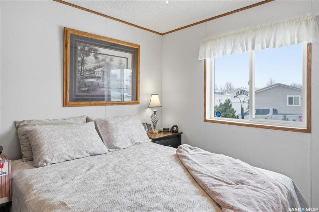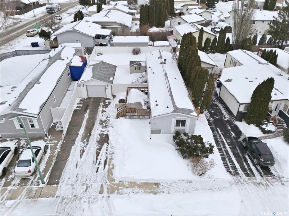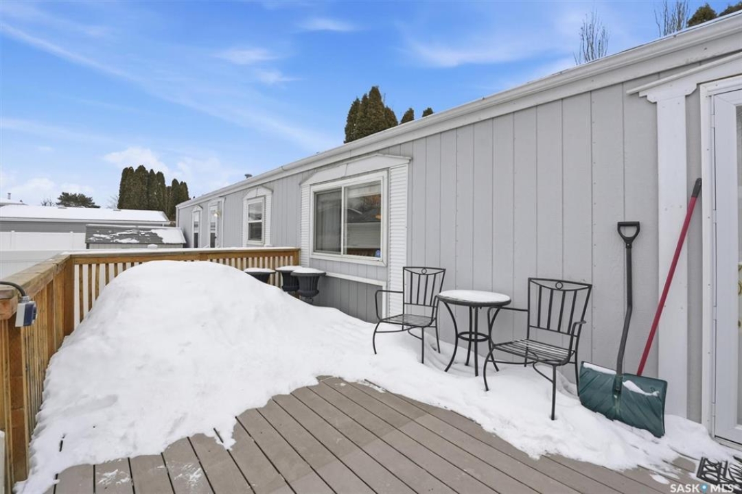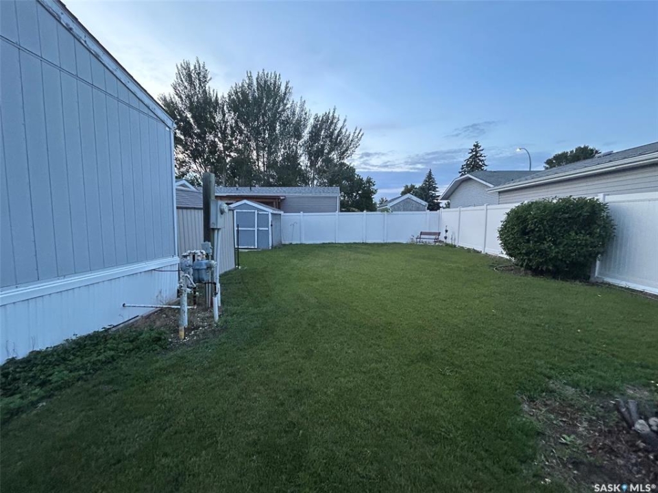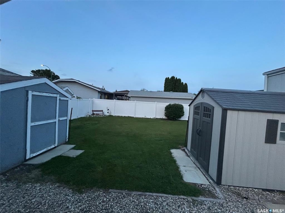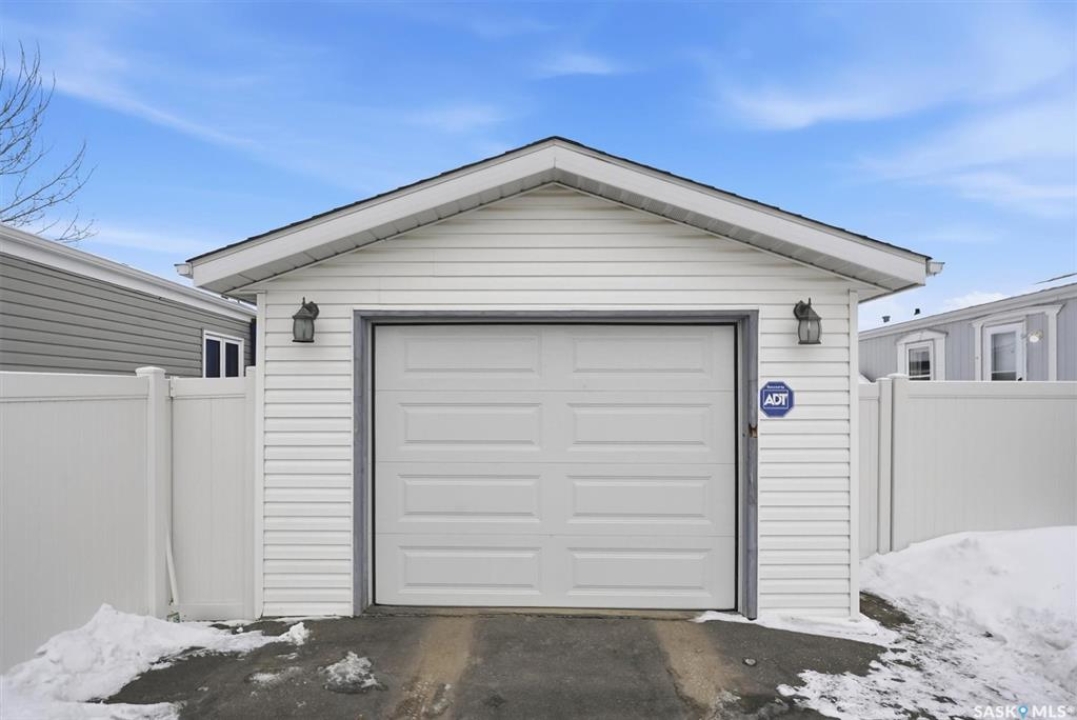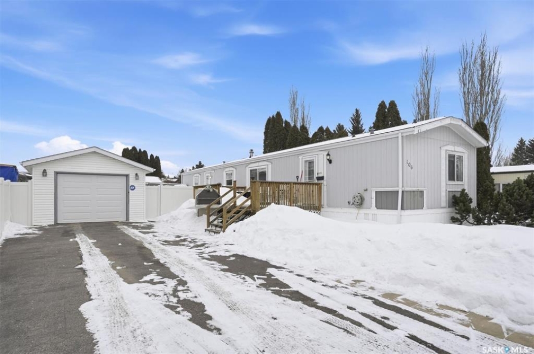 Welcome to this beautifully maintained 1,120 sq. ft. bungalow-style mobile home, built in 1997 and ideally located on a quiet, mature crescent in Fairhaven. Offering 3 bedrooms and 2 bathrooms, this home delivers comfort, functionality, and thoughtful updates throughout.The spacious primary bedroom features a walk-in closet and a private 3-piece ensuite with updated walk-in shower (2025). Two additional bedrooms, a 4-piece main bathroom, and a dedicated laundry room with front-load washer and dryer. Enjoy open-concept living with a generous family room flowing seamlessly into the kitchen and dining area. The kitchen is highlighted by granite countertops, stainless steel appliances, and tiled backsplash. Meticulously cared for over the years, this home has seen numerous valuable updates, including: Shingles (2020), Split A/C unit (2018), Granite countertops in kitchen, stainless steel kitchen appliances, laminate flooring. Outside features include a single heated detached garage (14' x 22'), a large asphalt driveway plus additional crushed rock parking ideal for RV parking, trailers, utility vehicles, or extra off-street parking. Two storage sheds provide added functionality. Accessibility is thoughtfully incorporated with a wheelchair lift built into the front deck. The large, private yard is surrounded by updated vinyl fencing along majority of the perimeter, offering a secure and welcoming space perfect for families and pet lovers alike. Contact your Realtor today to book your private viewing.