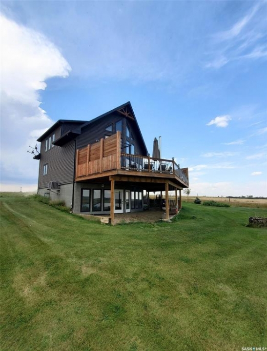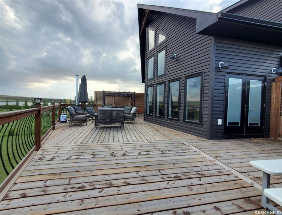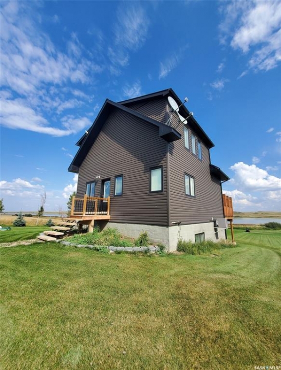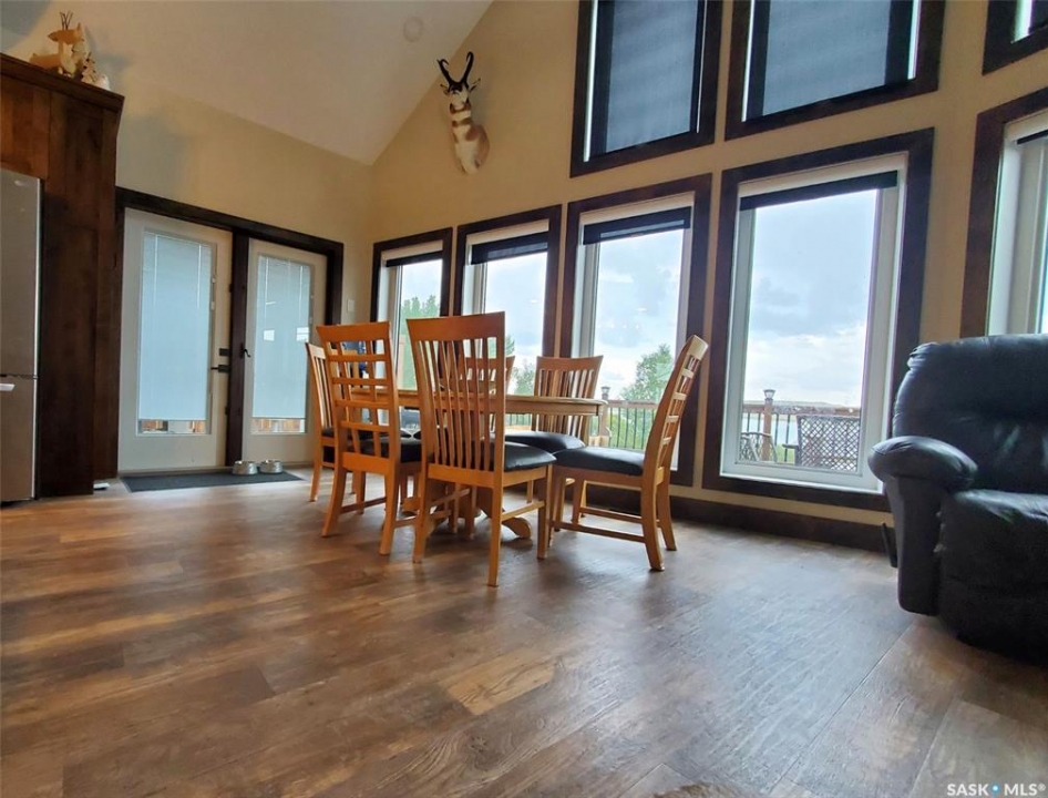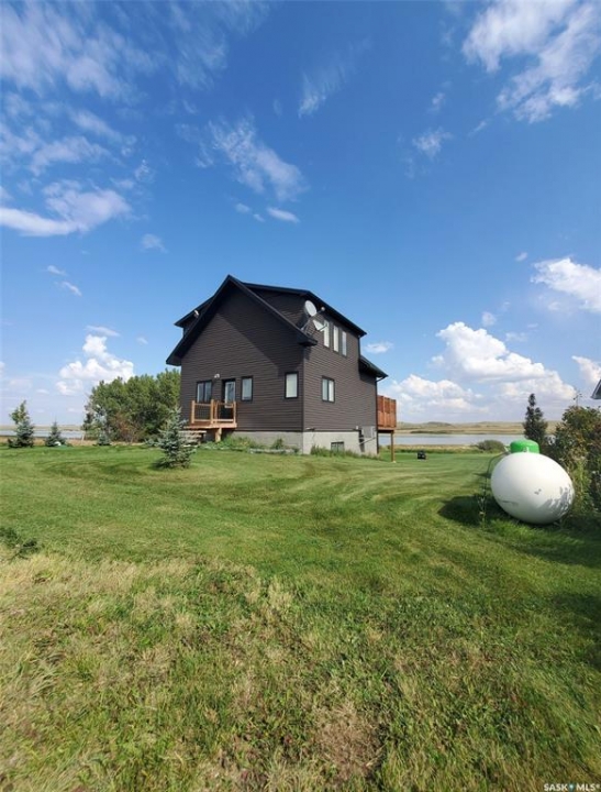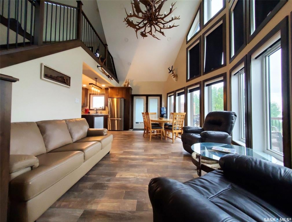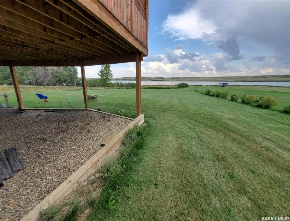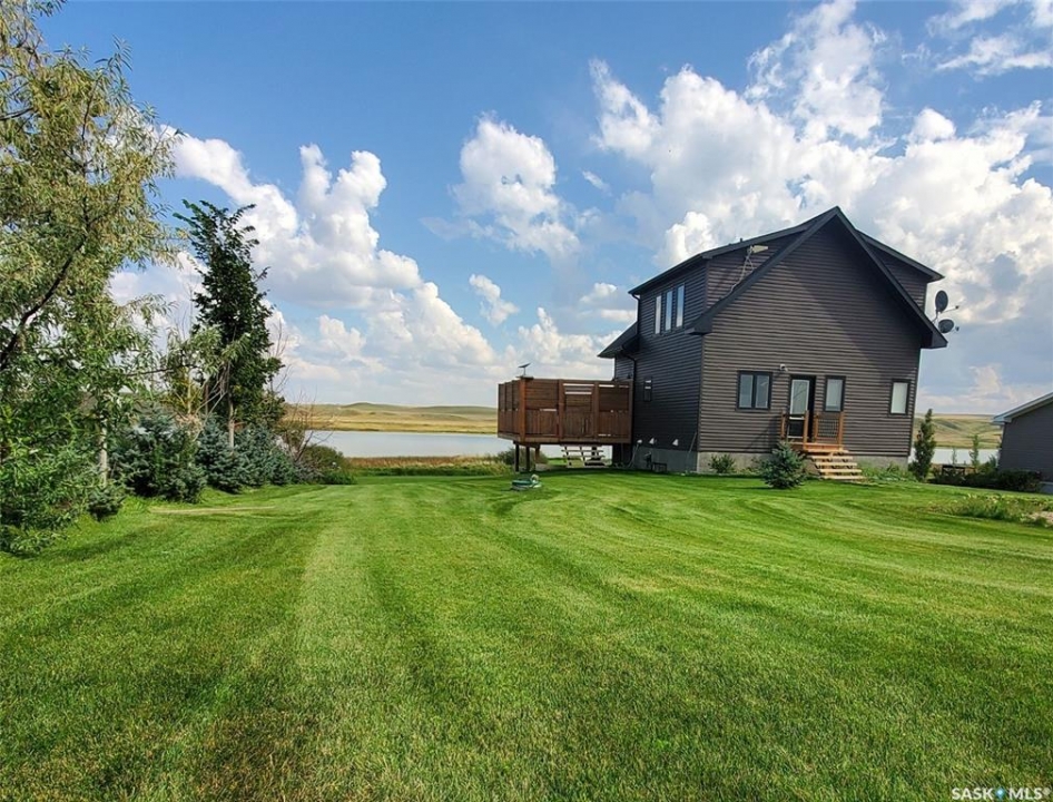 This deeded, 4-season lake property is located on a large, beautiful waterfront lot just under an hour's drive from Swift Current and was built in 2018. The home features luxury finishes and a functional layout designed for year-round enjoyment. Coming in through the back entrance where there is ample parking behind, this entry features a large storage closet and a galvanized tin feature wall with multiple coat hooks for easy organization options. The short hallway ahead leads into an open concept kitchen, dining and living area with gorgeous vaulted ceilings that showcase vertical windows spread all the way up the east side, providing abundant natural light and water views for enjoyment. The kitchen features ample warm, alder wood cabinetry, modern industrial accents and finishes and a large, stunning copper sink. Vinyl plank flooring runs throughout the entirety of the main space, and a grand antler chandelier makes a great statement. This area comes fully-furnished with both living and dining room furniture. Patio doors off the dining area open out to the expansive deck with both north and south privacy/windbreaker walls. The main floor also hosts the large primary bedroom with a spacious closet, as well as a 4-piece bath which displays an elegant copper sink. The comfortable loft serves as a great family room or kid's zone and looks down to the main area of the home. Downstairs, the walk-out basement hosts another large space with vinyl plank flooring, wood ceilings, pot lights, and garden doors leading out to the massive yard space. Nearby you will find under-the-stairs storage, the utility room, the laundry closet with a dual washer/dryer with a nook beside it, and there are 2 comfortable bedrooms across from one another with a 3-piece bathroom resting at the end of the hall. This bathroom features a shiplap feature wall & ceiling, a tiled shower, and a closet. Don't hesitate to call or text for more info or to book a showing for this stunning property.