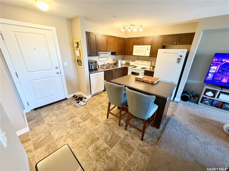 Welcome to this stylish 657 sq ft condo in the modern Fifth & 5th building. This thoughtfully designed one-bedroom plus office suite offers an open-concept layout that maximizes space and functionality. The kitchen seamlessly connects to the dining and living areas, creating an inviting space for everyday living or entertaining. The contemporary kitchen features updated white appliances, ample cabinet and counter space, and a functional island that adds both prep space and seating. The spacious primary bedroom is bright and comfortable, while the dedicated office provides the perfect work-from-home space or compact second bedroom to suit your needs. A well-appointed 4-piece bathroom, convenient in-suite laundry, and a private north-facing balcony add to the comfort and practicality of this home. This unit also includes one reserved outdoor parking stall. This is an excellent opportunity for first-time buyers, professionals, or investors. Book your private viewing today.