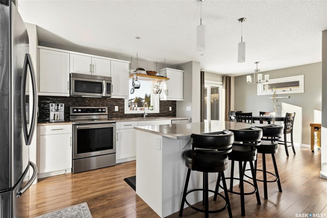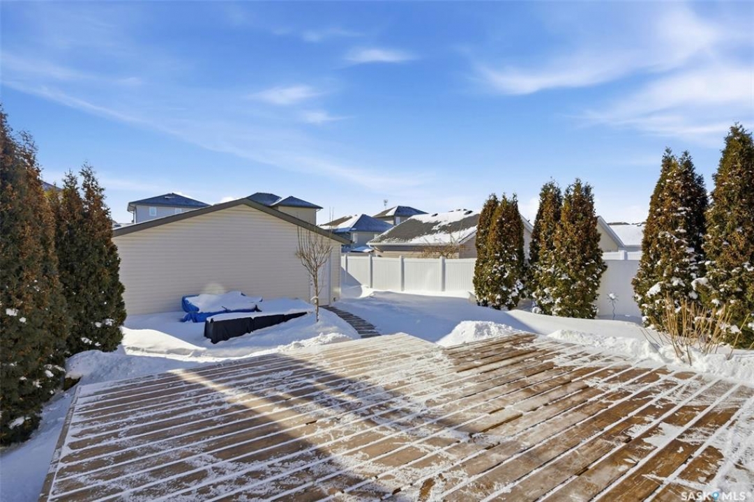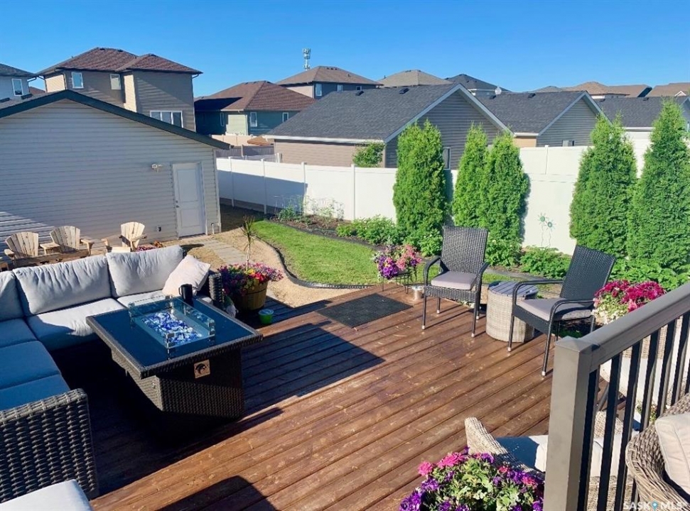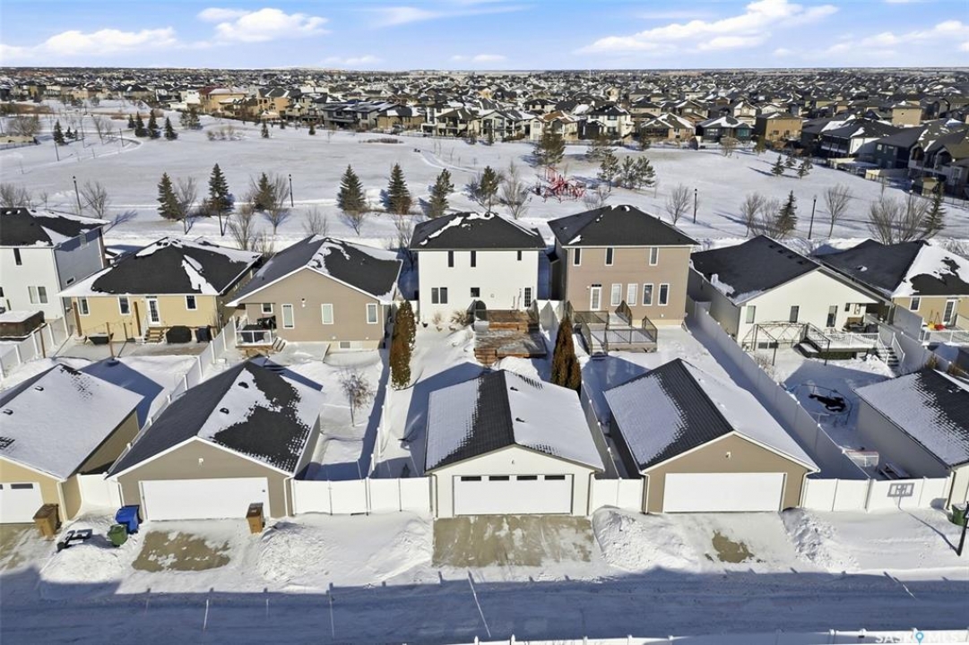 Welcome to 4333 Green Apple Drive. This extremely well cared for two storey home with a double detached garage is located across the street from a park, and located close to the elementary school. Great street appeal with a covered front porch. Step inside to a welcoming entryway complete with a spacious closet. The main floor offers an open-concept layout featuring an island style kitchen, living room, and dining area — perfect for entertaining. You'll also find a handy desk/workspace area and a convenient two-piece bathroom. Upstairs boasts three generously sized bedrooms, a full bathroom, and a separate laundry room for added convenience. The basement is ready for your personal touch, with roughed-in plumbing for a future bathroom. Exterior walls are already framed, insulated, and polyed, giving you a head start on development. Step outside to a wonderful backyard featuring a large deck — ideal for summer gatherings and relaxing evenings. Beautiful landscaping with mature trees, shrubs, and another deck by the garage with a cozy fire pit! Value-added features include: Fridge, Stove, Dishwasher, Central Air Conditioning and gas line for a BBQ. This home offers comfort, functionality, and future potential — all in a great location!