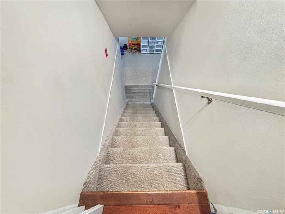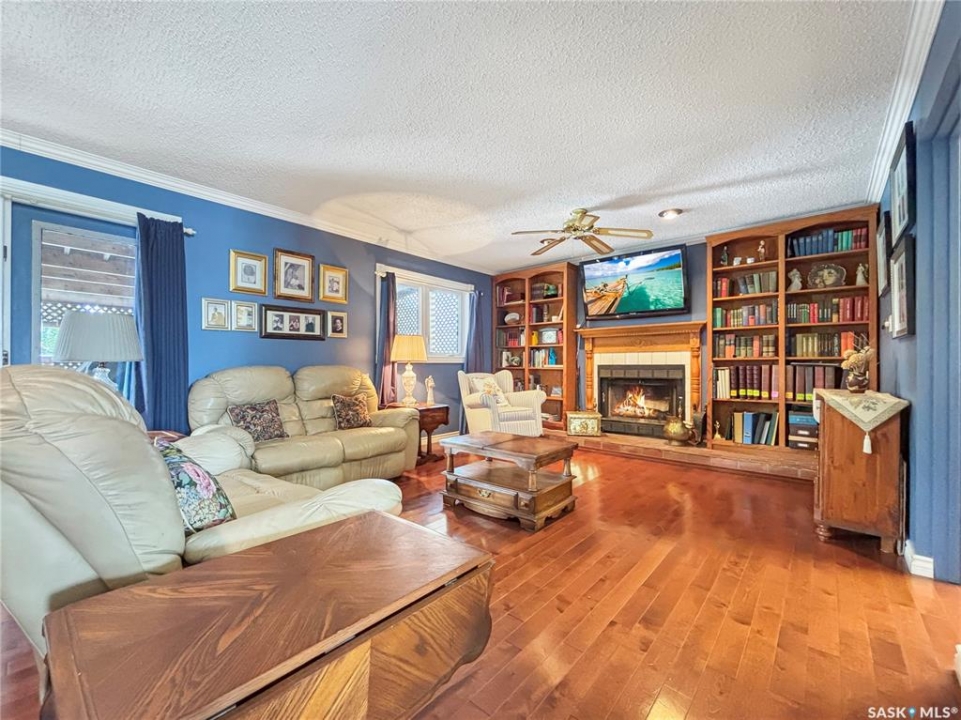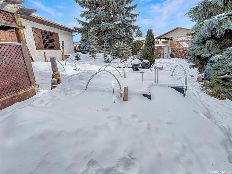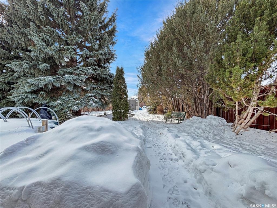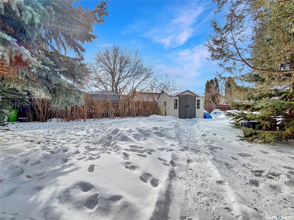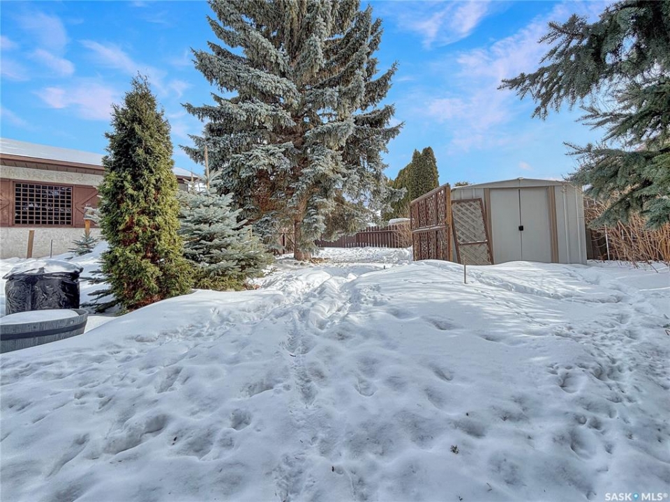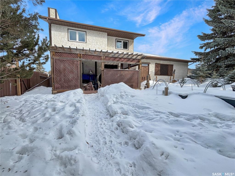 Great family home at the back of Stacey Crescent. Two storey split on a park-like, wedge-shaped lot, just over 9500 sq ft. Wood flooring on the main, upgraded kitchen with large dining area. 2 steps down to the living room with wood burning fireplace, half bath/laundry combo and a large mud room with plenty of room for jackets and shoes. Access to covered patio. Upstairs you'll find 3 bedrooms with wood flooring and a large main bathroom with separate jet tub and walk-in shower. Fully developed basement with large family room, 2 dens used as bedrooms (the sellers installed fire suppression sprinkler system for safety) and 4-piece bath. Upgraded furnace and water heater. Upgraded windows. Double attached garage with direct entry. Central air/central vac. RV parking. April 15th possession date. Square footage from City of Saskatoon