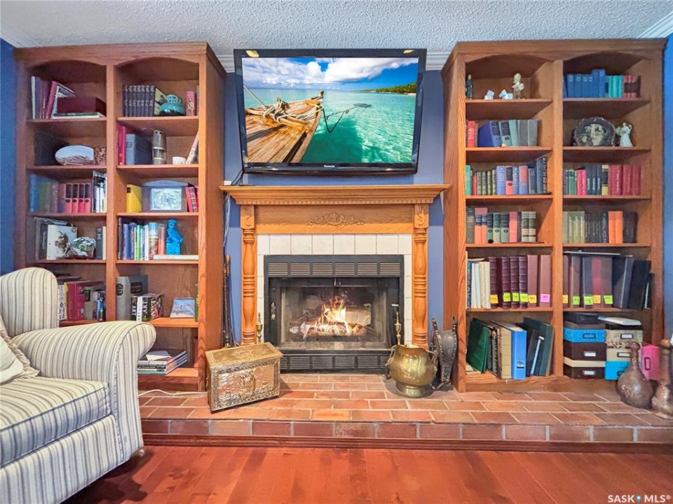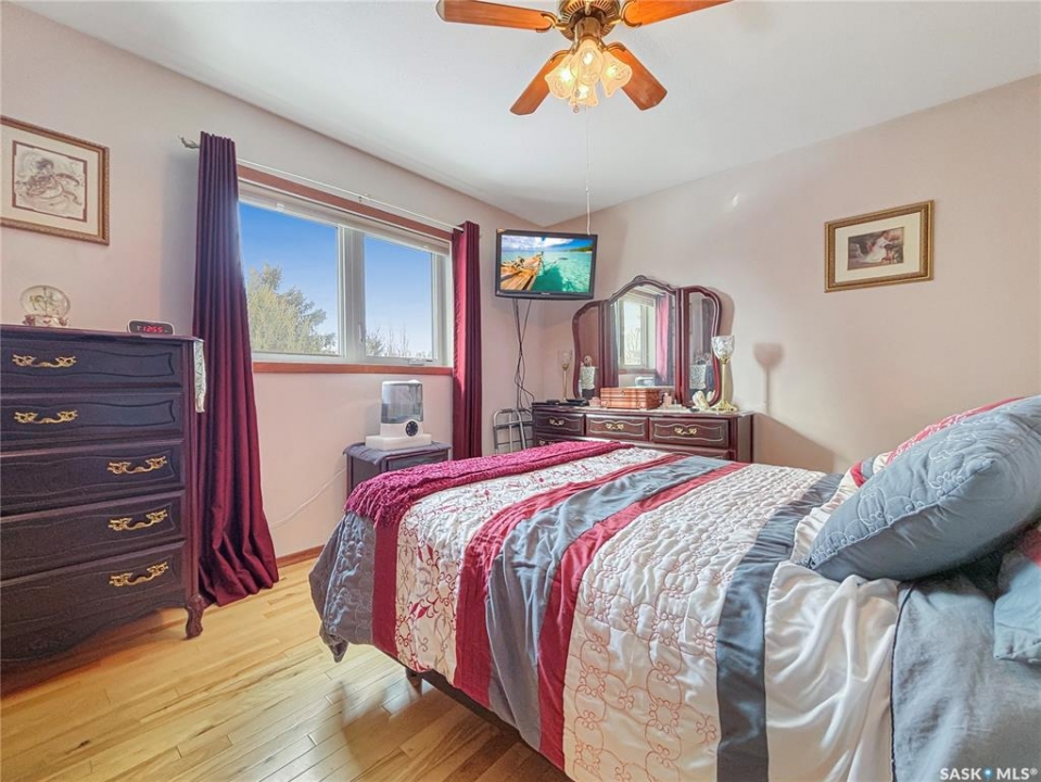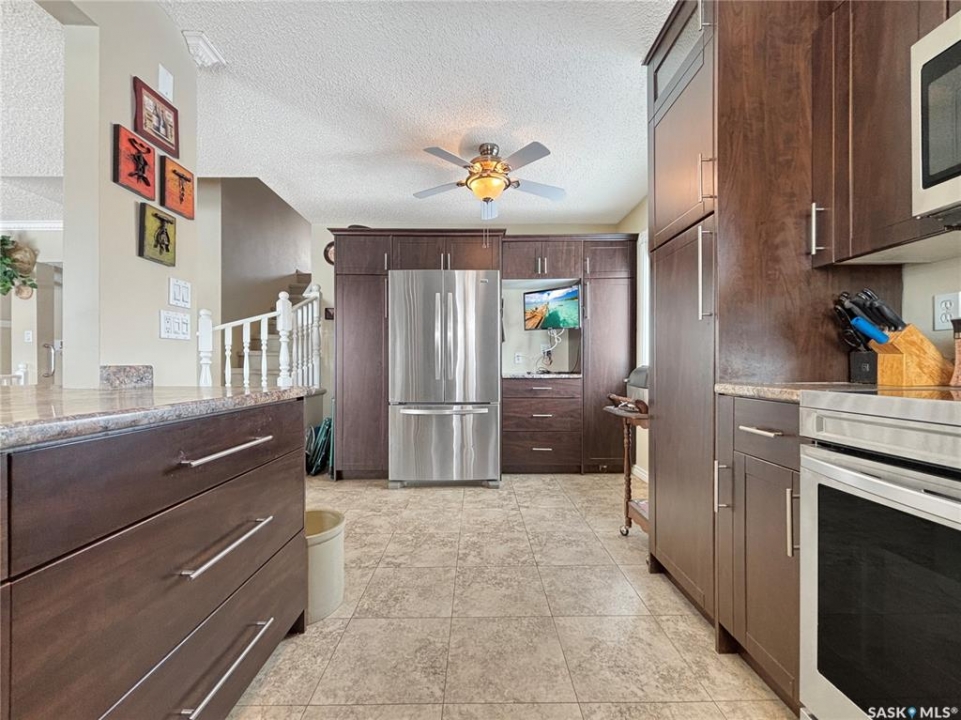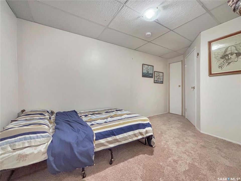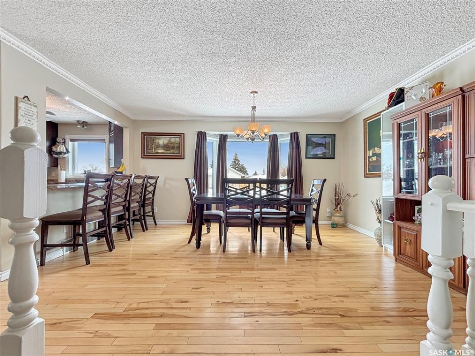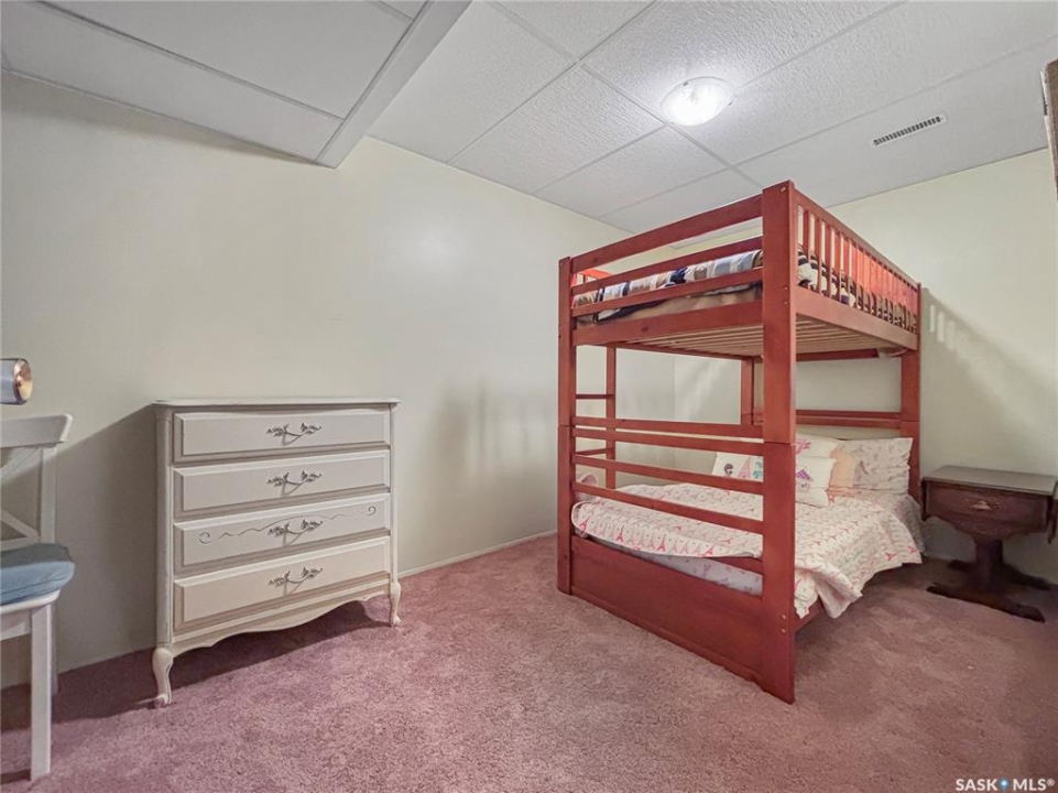 Great family home at the back of Stacey Crescent. Two storey split on a park-like, wedge-shaped lot, just over 9500 sq ft. Wood flooring on the main, upgraded kitchen with large dining area. 2 steps down to the living room with wood burning fireplace, half bath/laundry combo and a large mud room with plenty of room for jackets and shoes. Access to covered patio. Upstairs you'll find 3 bedrooms with wood flooring and a large main bathroom with separate jet tub and walk-in shower. Fully developed basement with large family room, 2 dens used as bedrooms (the sellers installed fire suppression sprinkler system for safety) and 4-piece bath. Upgraded furnace and water heater. Upgraded windows. Double attached garage with direct entry. Central air/central vac. RV parking. April 15th possession date. Square footage from City of Saskatoon