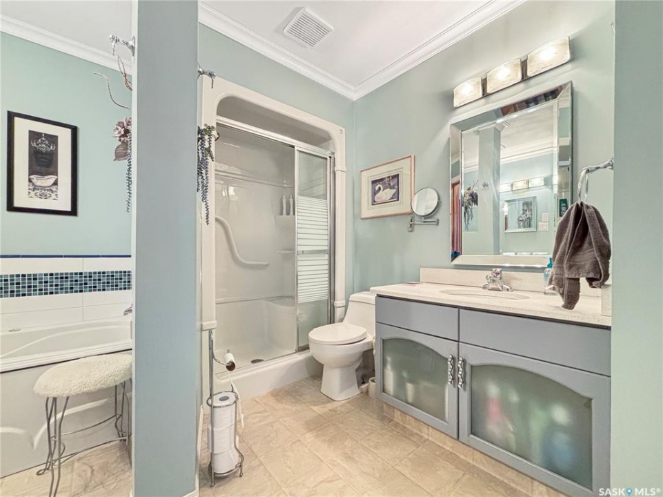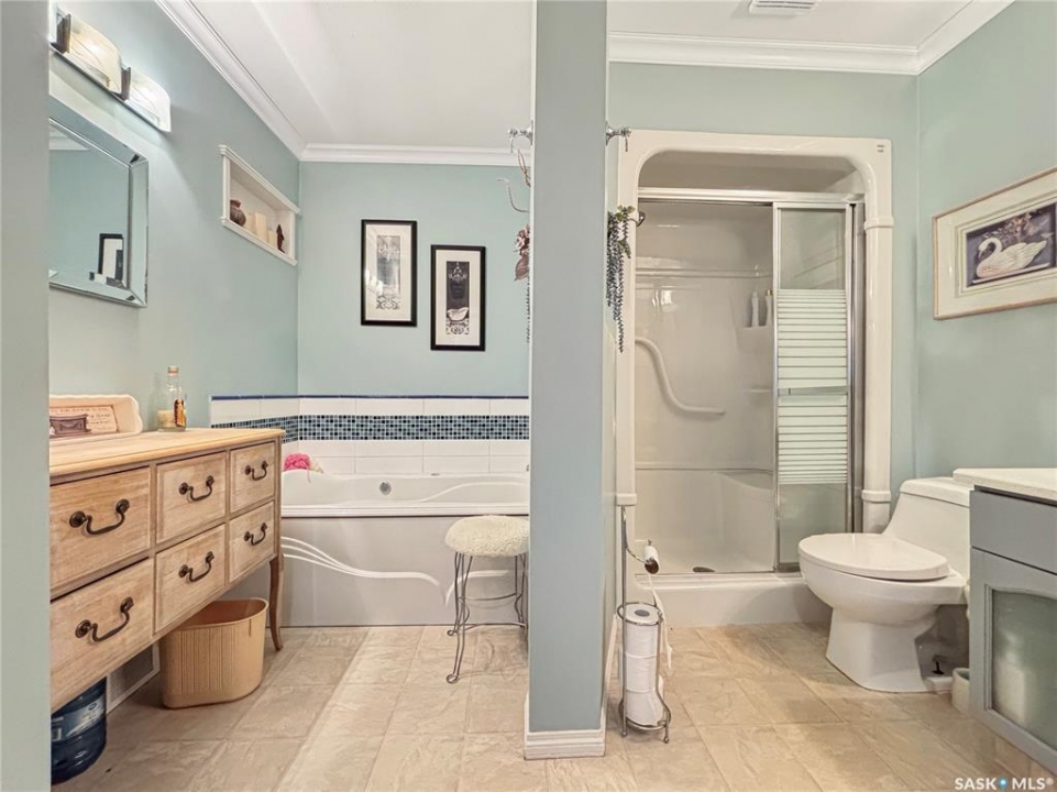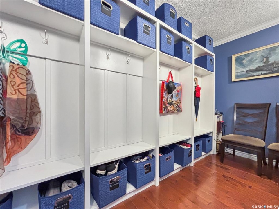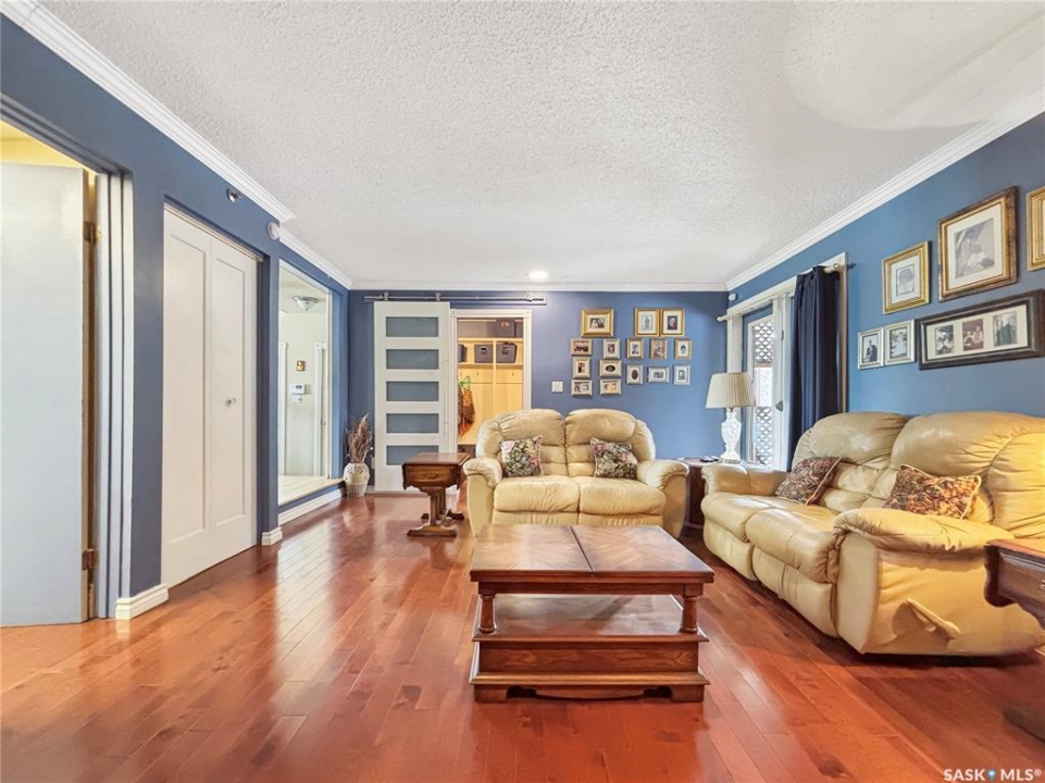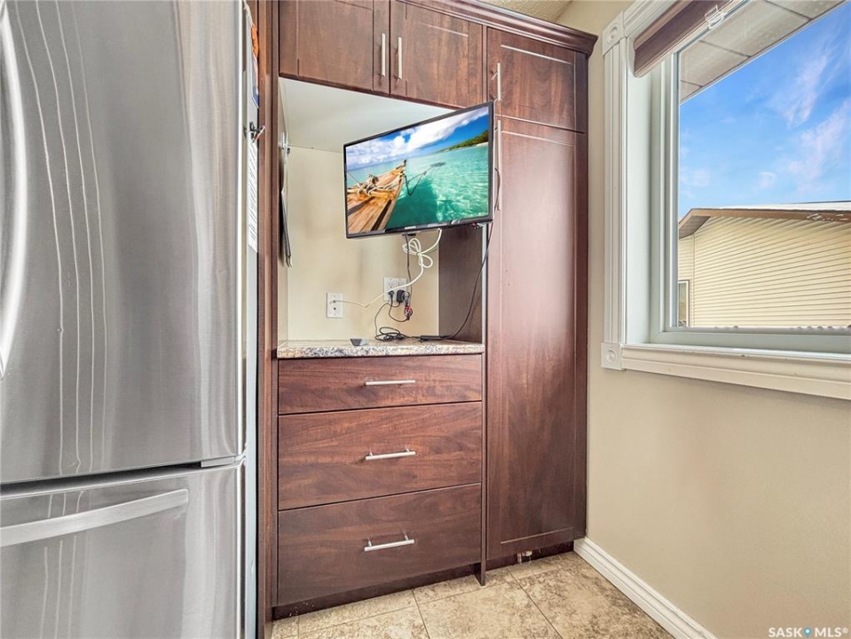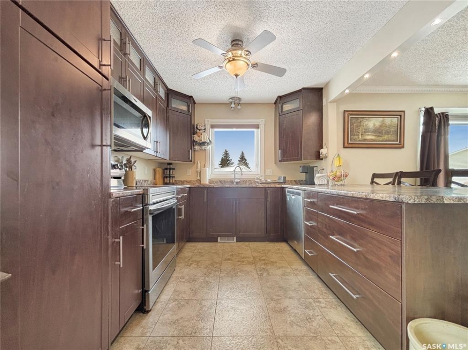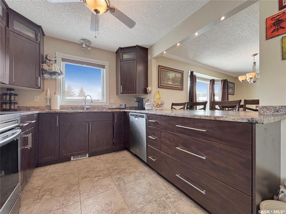Great family home at the back of Stacey Crescent. Two storey split on a park-like, wedge-shaped lot, just over 9500 sq ft. Wood flooring on the main, upgraded kitchen with large dining area. 2 steps down to the living room with wood burning fireplace, half bath/laundry combo and a large mud room with plenty of room for jackets and shoes. Access to covered patio. Upstairs you'll find 3 bedrooms with wood flooring and a large main bathroom with separate jet tub and walk-in shower. Fully developed basement with large family room, 2 dens used as bedrooms (the sellers installed fire suppression sprinkler system for safety) and 4-piece bath. Upgraded furnace and water heater. Upgraded windows. Double attached garage with direct entry. Central air/central vac. RV parking. April 15th possession date. Square footage from City of Saskatoon