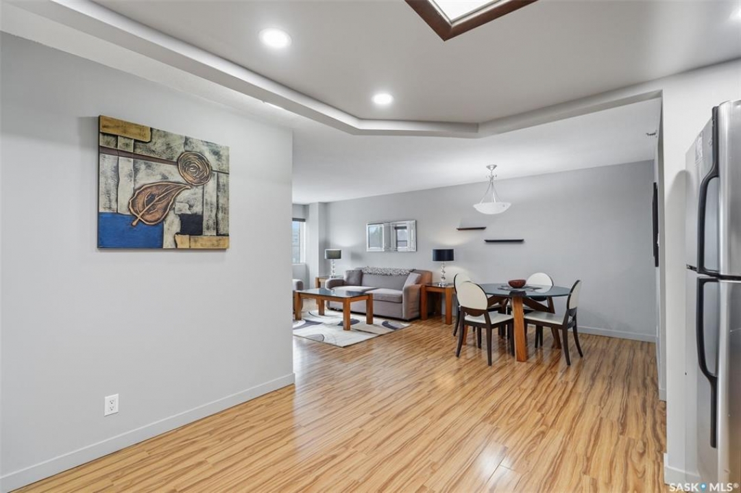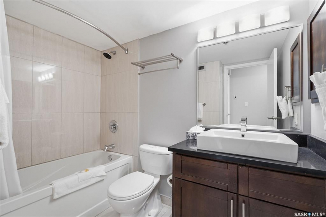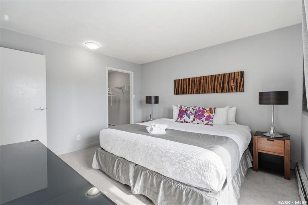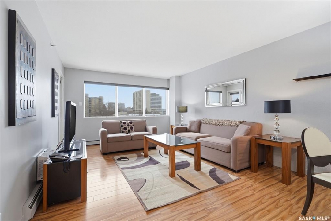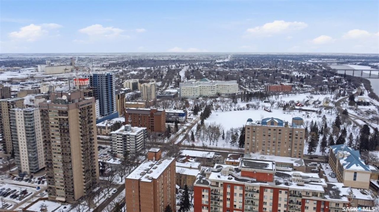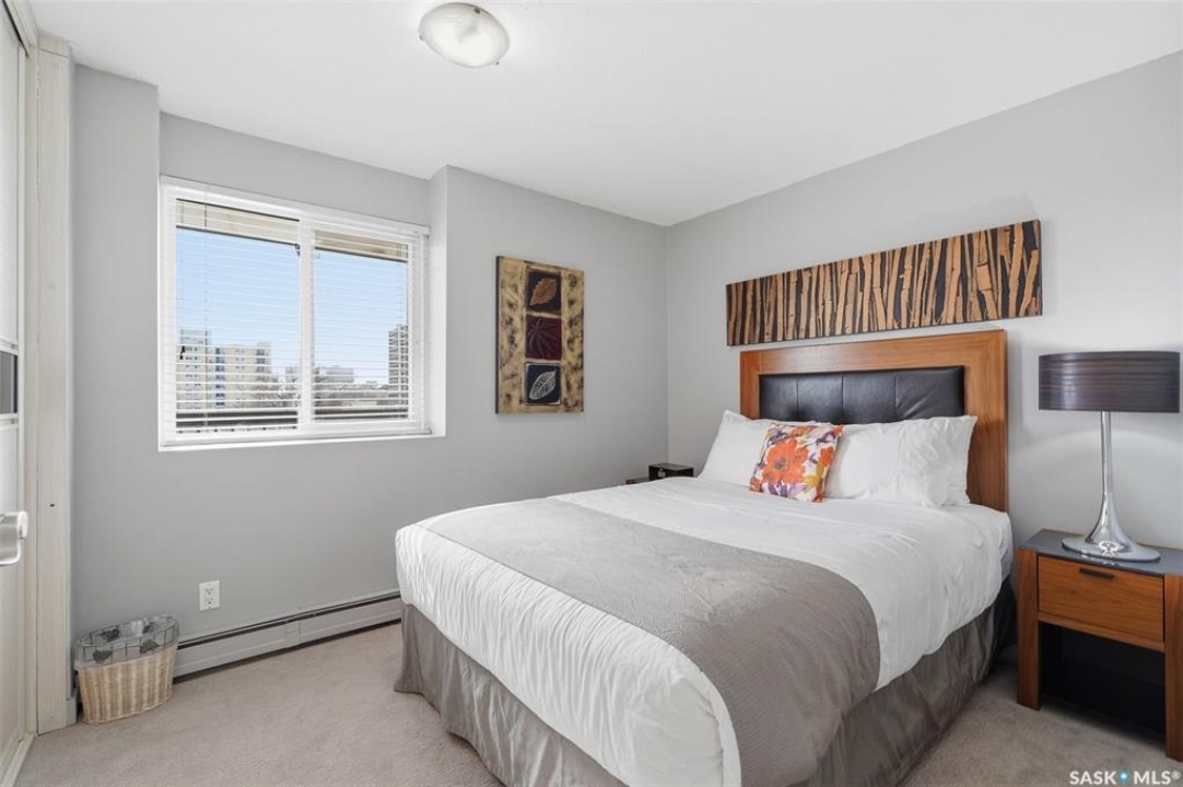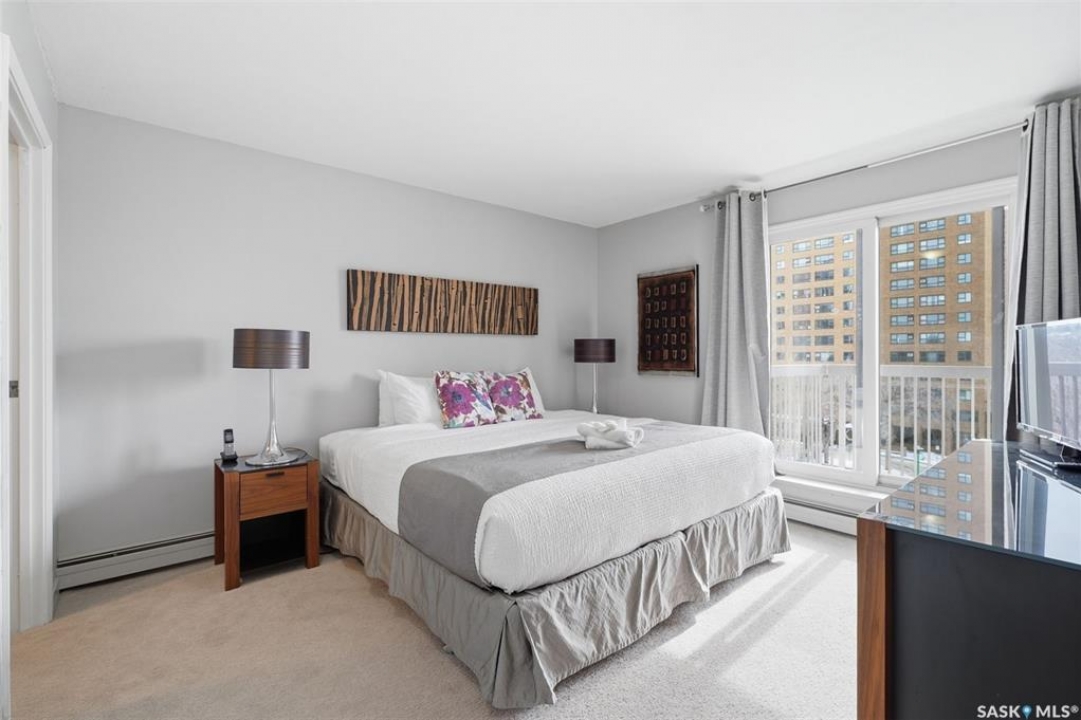 Exceptional city views with a peek of the river await from the 5th floor of Hallmark Place in the heart of Saskatoon! This well-maintained 970 sq. ft. condo offers 2 bedrooms and 1 full bathroom, all in excellent condition with a bright, open-concept layout. The kitchen overlooks the spacious living area and features a convenient breakfast bar—perfect for casual dining or entertaining. Both bedrooms are generously sized, with the spacious primary suite featuring a large walk-in closet. Freshly painted with new carpet, this move-in-ready unit also includes in-suite laundry and all appliances. Step out onto your private balcony to enjoy city skyline views along with a glimpse of the river—an ideal setting for morning coffee or relaxing evenings. Hallmark Place is a well-managed concrete building offering fantastic amenities, including an amenities room, exercise area, squash court, outdoor patio, and high-speed elevators. There's even a convenient store right at the entrance for added everyday convenience. While this unit does not include its own parking stall however the seller has secured underground rental parking if there is interest. Don't miss your opportunity to enjoy downtown living with views—call your REALTOR � today to book your private showing!