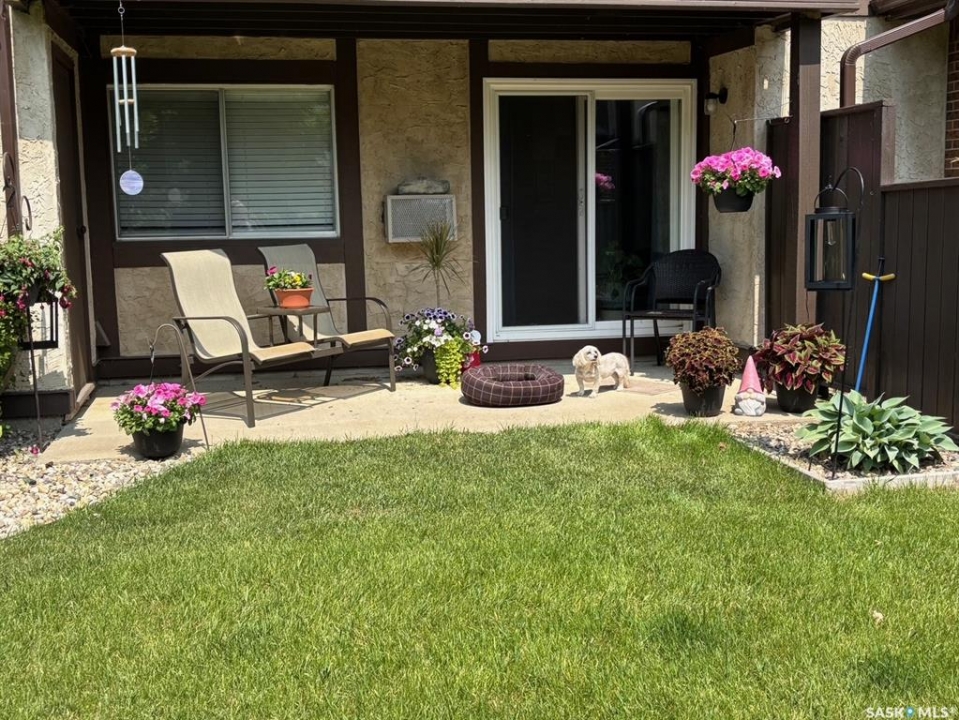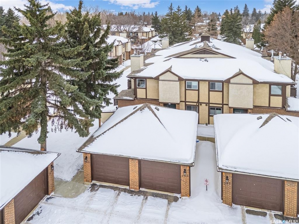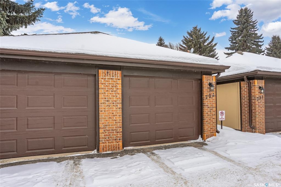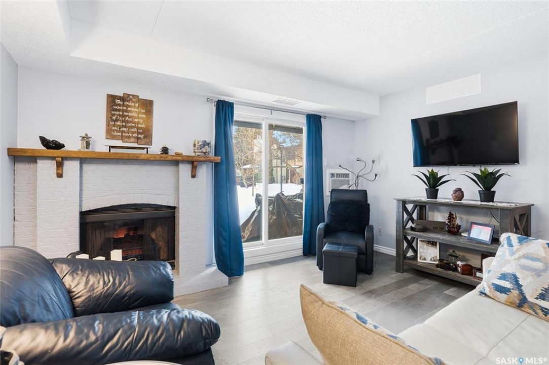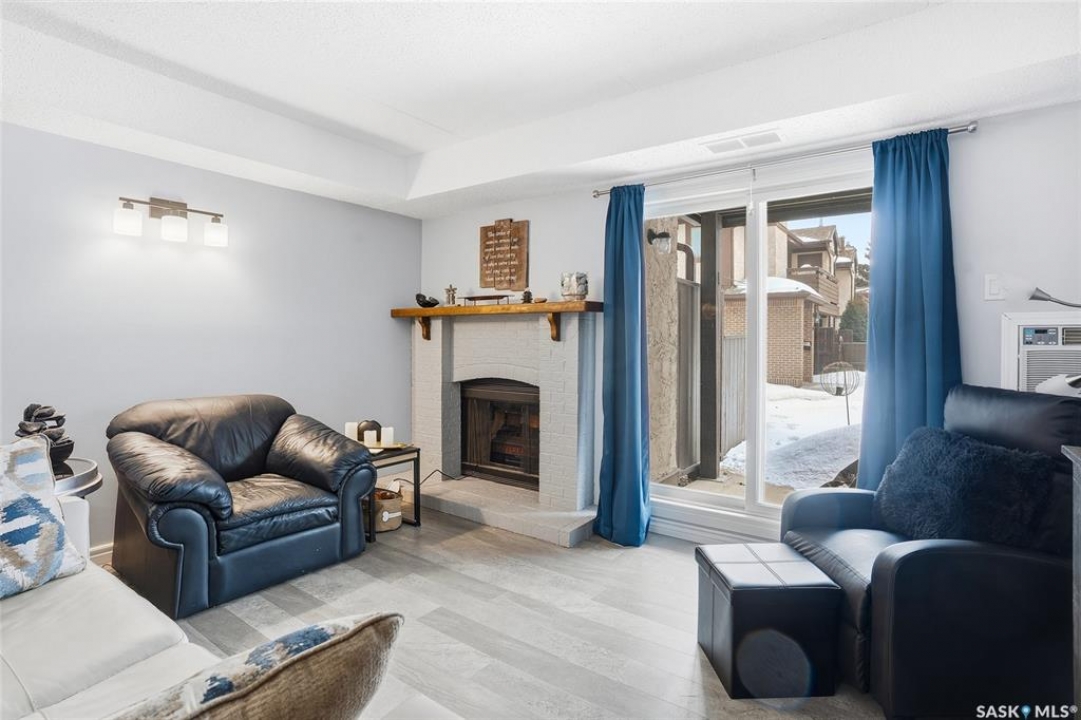 A rare opportunity awaits at River Ridge Estates — and the name truly says it all. Quietly tucked at the back of the complex, this beautifully updated main-floor condo offers the perfect blend of privacy, safety, and low-maintenance living. Even better? A detached garage sits just steps from your door — a hard-to-find feature that provides extra storage and year-round convenience. Located in a well-established community in desirable Lawson Heights, this complex is ideally positioned near schools, parks, the Meewasin Trail, shopping, the civic centre, and more. It's a setting that perfectly balances tranquility with everyday accessibility. Step outside to your private southwest-facing patio overlooking the peaceful courtyard, complete with mature trees and lush garden spaces. Inside, the modern updates shine. Upgraded flooring and fresh paint create a clean, contemporary feel throughout the open-concept layout. The kitchen is fully equipped with appliances, generous cabinetry, ample counter space, and a functional eat-up island. The dining area flows seamlessly into the bright living room, where newer patio doors and a stunning fireplace with a wood-accent mantle create a warm and welcoming focal point. An electric insert adds both comfort and ambiance. The spacious primary bedroom offers impressive square footage, a walk-in closet, and convenient access to the four-piece bathroom — a true retreat at the end of the day. An additional bedroom provides flexibility for guests, an office, or hobbies. And finally, a large storage room houses your laundry, water heater, and plenty of extra storage space. Whether you're a first-time buyer looking to step into homeownership or ready to downsize without compromise, this home checks all the boxes. The complex is pet-friendly, features a strong and established reserve fund, and offers additional parking for rent. Your search ends here — call today for more information and start packing!