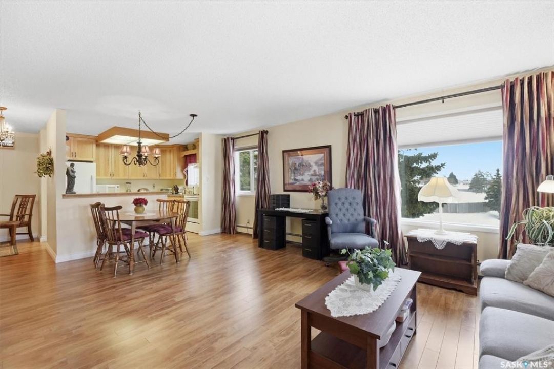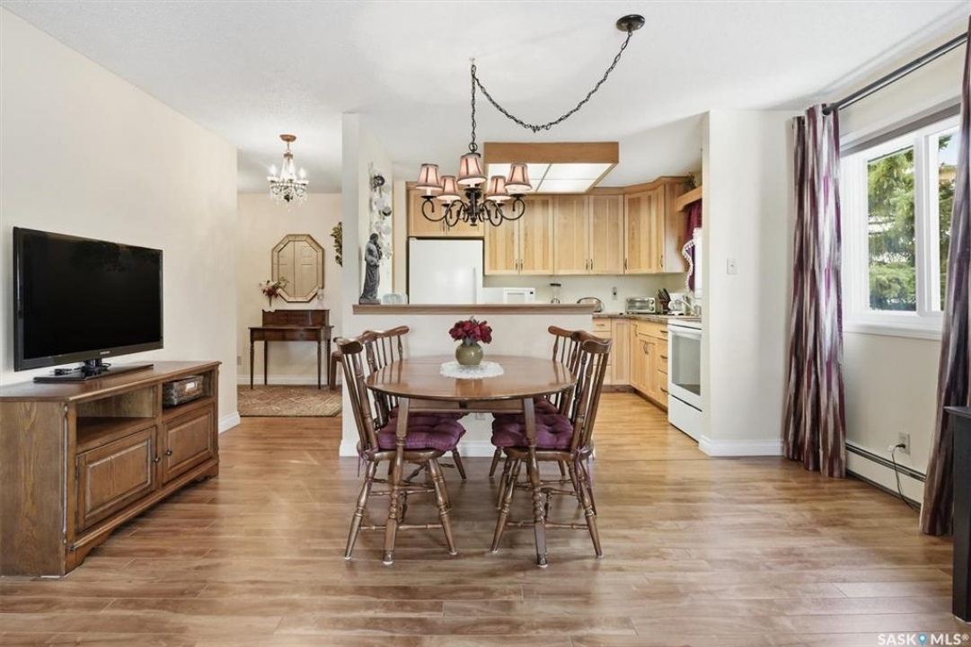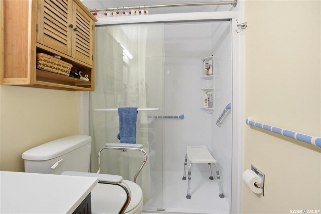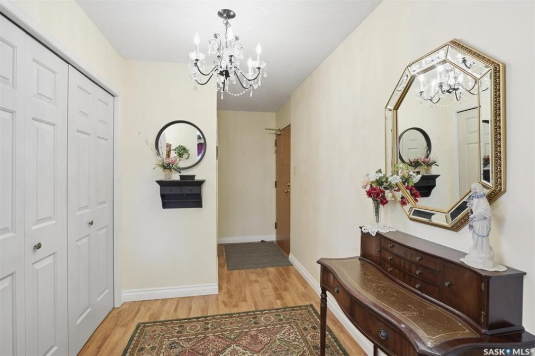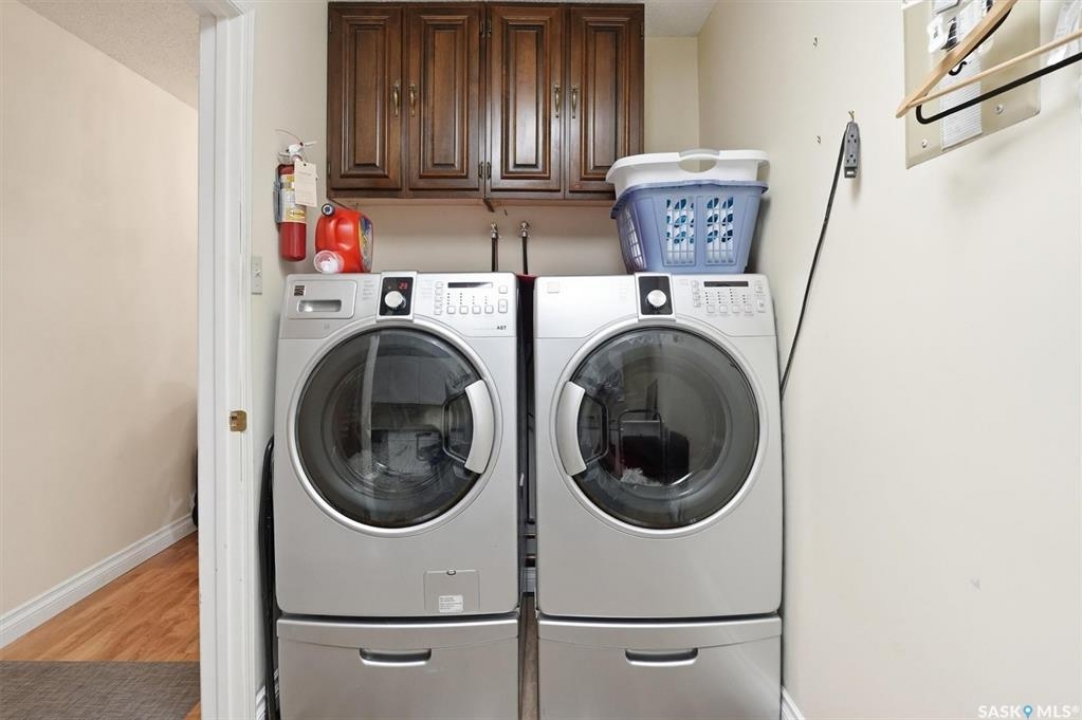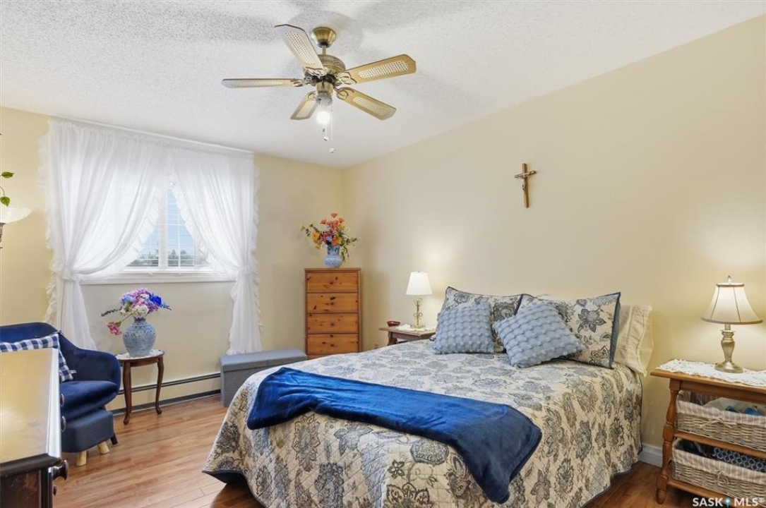 Immaculate corner unit offering 2 bedrooms and 2 bathrooms, numerous upgrades throughout. This bright spacious condo features lots of natural light, a spacious foyer and functional open-concept layout. The kitchen is highlighted by beautiful hickory cupboards. Additional features include newer laminate flooring, large laundry/utility room with plenty of storage, access to a large deck with storage room. This well maintained building has an elevator, amenities and exercise rooms. This unit shows 10/10 and is truly move-in ready.