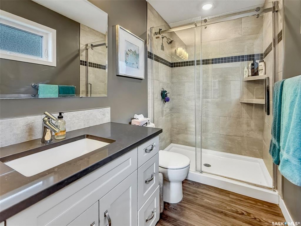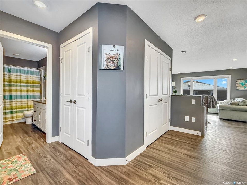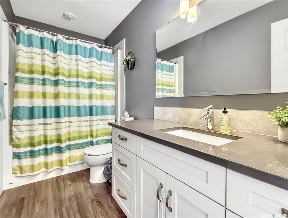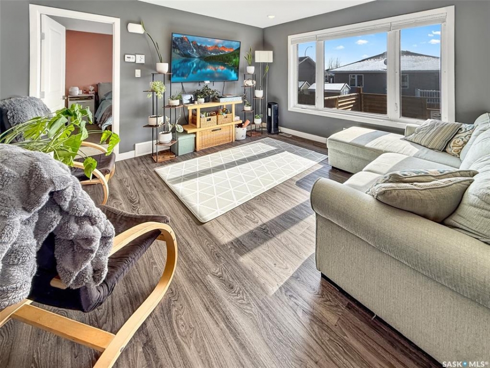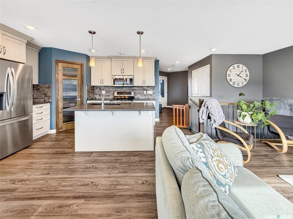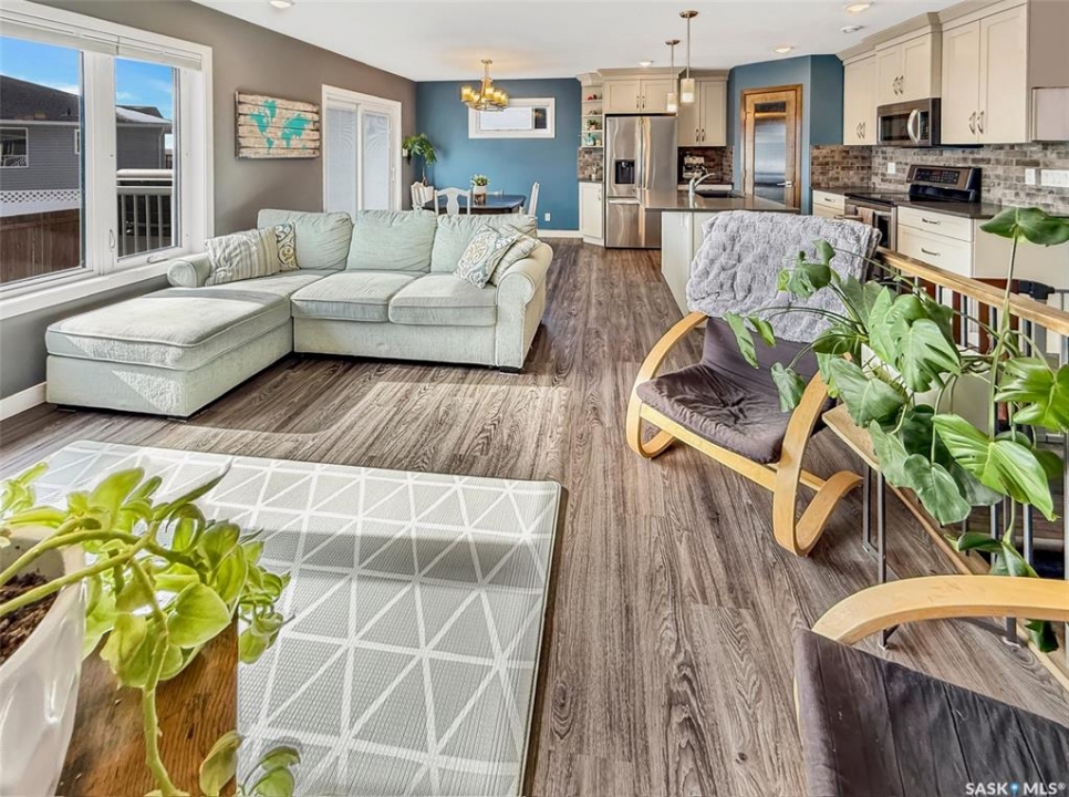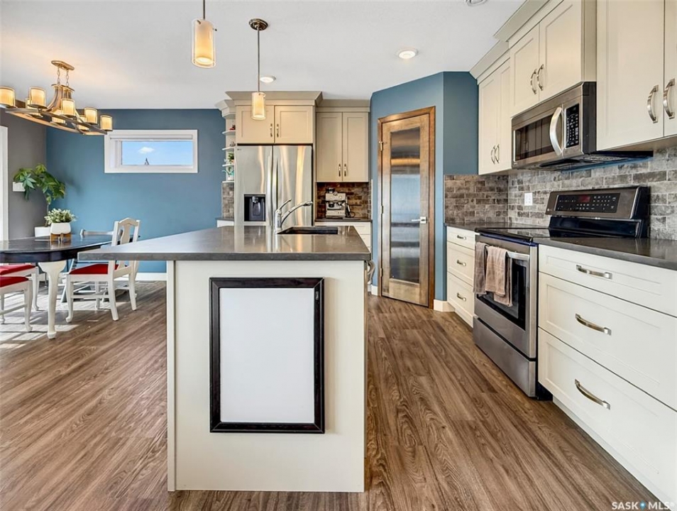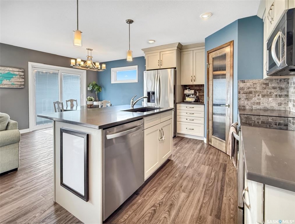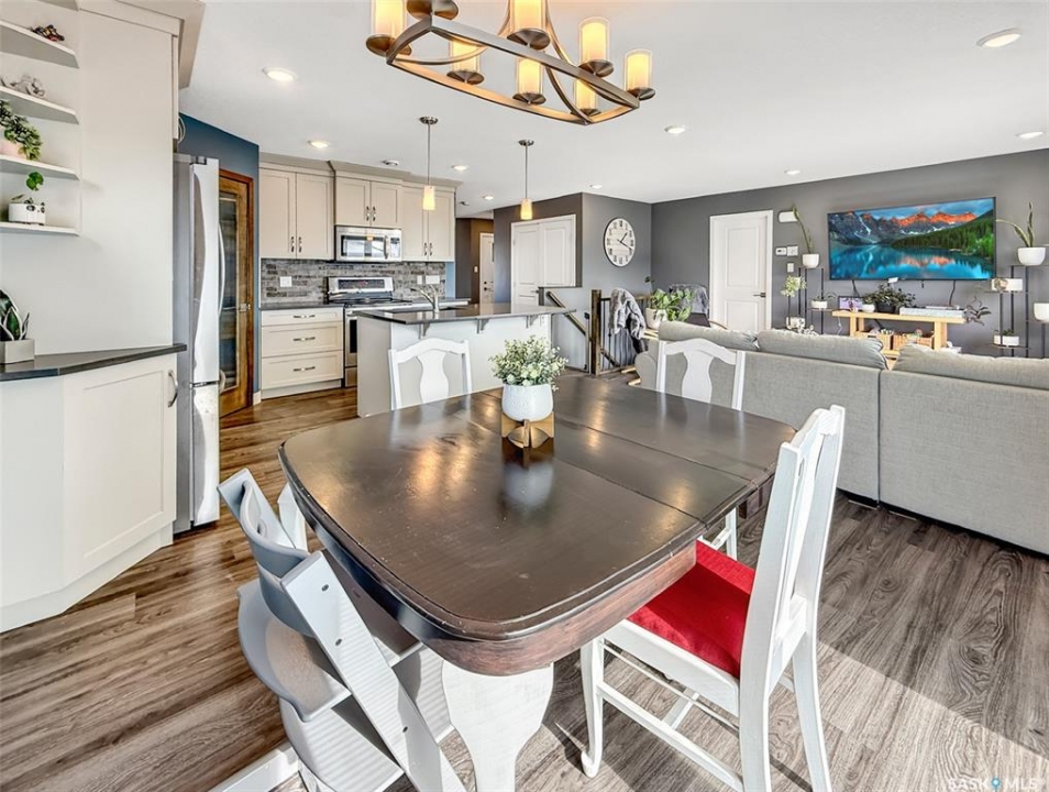 Welcome to 820 Battleford Trail — a 2016-built bungalow that blends country tranquility with convenient city amenities. Situated on the edge of highland, the home offers reduced traffic and expansive prairie views while remaining within the Centennial, École, and All Saints school bus catchments and close to city amenities. Constructed by a reputable local builder, the residence features a contemporary color palette and numerous high-end finishes. The private front entry provides easy access to an insulated double garage, plumbed for gas heat, and equipped with versatile storage solutions including ceiling-mounted racks that lower. At the front of the home you will find a bedroom or home office, a four-piece bathroom, and main-floor laundry for added convenience. The rear of the home presents an open-concept great room flooded with natural light from windows that span the back wall. The space is organized into a generous living area, a dining zone with patio doors to the deck, and a modern kitchen with white cabinetry, stone countertops, SS appliances, a walk-in pantry, and a large island ideal for entertaining. The oversized primary suite includes a substantial walk-in closet and a three-piece ensuite with a glass-tiled walk-in shower. The finished lower level offers an expansive family room with large windows, two additional bedrooms (one with a walk-in closet), a third full bathroom, a versatile den suitable for an office or playroom, and a modern utility room. Built with durable and efficient systems, the home includes an ICF block foundation, energy-efficient furnace, air exchange system, an on-demand hot water heater(3 years old). The fully fenced yard features a concrete patio with an adjustable privacy screen (new), under-deck storage, and established perennials and fruit bushes. If you are seeking modern construction in a desirable location that is move-in ready, this property warrants consideration. For more information please contact today.