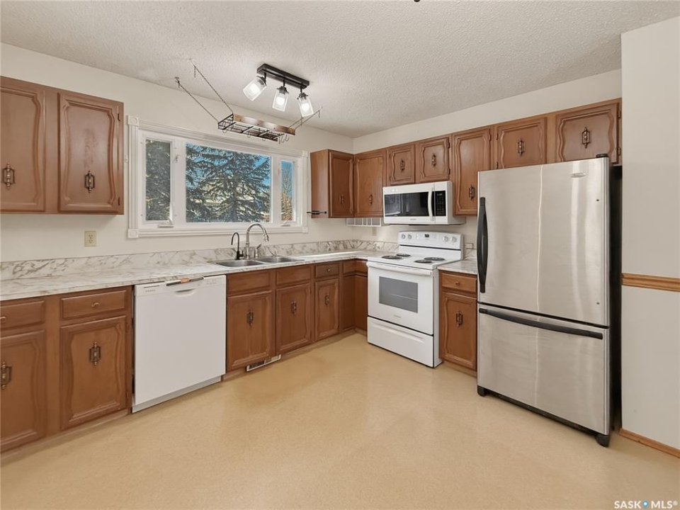 Enjoy beautiful city views from the front window of this well-maintained reverse walkout home, ideally located on a quiet cul-de-sac just steps from a K-8 school, the S3 Arenas, parks, and the outdoor pool. Set on an oversized pie-shaped lot with mature trees, the fully fenced yard offers space for additional parking, RV storage, or garden areas. The east fence has been recently replaced, and plum trees in both the front and back add charm to the yard. A deck off the dining room as well as a lower ground-level deck provide great outdoor spaces for relaxing or entertaining. The ground level welcomes you through the front foyer with access to the attached garage. The impressive 13 × 29 garage runs the full length of the home, offering built-in storage and ample room to protect your vehicle from the elements. This level also features a spacious family room, 2-pc bathroom with room to add a tub or shower, and an office area that could easily convert to a bedroom with doors added from the adjacent storage room. A large storage/utility room completes this level and includes the energy-efficient furnace with electric air cleaner. The upper level offers a generous living room filled with natural light and lovely city views. The dining area sits adjacent and features garden doors leading to the backyard and upper deck. The kitchen includes updated white/stainless steel appliances and some newer lighting. Down the hall are 3 bedrooms, including the spacious primary bedroom with an oversized window and its own 2-pc ensuite, along with a 4-pc main bathroom. Additional features include central A/C, underground sprinklers, 2 wood-burning fireplaces, mostly PVC windows, shingles approx. 8-10 yrs old, upper deck redone approx. 6 yrs ago, hot water heater approx. 6 yrs old, and reverse osmosis installed within the past couple of years. Contact your REALTOR � today for more information or to schedule a viewing.