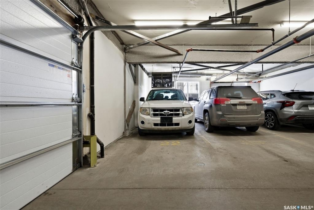 Welcome to The Strathmore located in Regina's desirable Cathedral neighbourhood, perfectly situated in the heart of the city. This 977 sq. ft. unit is located on the northeast side of the building and offers 2 bedrooms and 2 bathrooms. Ideally located close to downtown amenities, it's perfect for downtown professionals or investors. The open-concept kitchen features modern Weckworth cabinetry with soft-close doors and drawers, white quartz countertops, stainless steel appliances and mosaic tile backsplash. The kitchen opens to the living room with engineered hardwood flooring and patio doors leading to a balcony with gas BBQ hookup. The primary bedroom includes a 5-piece ensuite with double sinks. A second bedroom, full main bathroom, and in-suite laundry complete the unit. Parking stall #22 in the indoor and heated parkade is included as well as storage unit #6. The building is wheelchair accessible with elevator access and secure intercom entry. There is also visitor parking available.