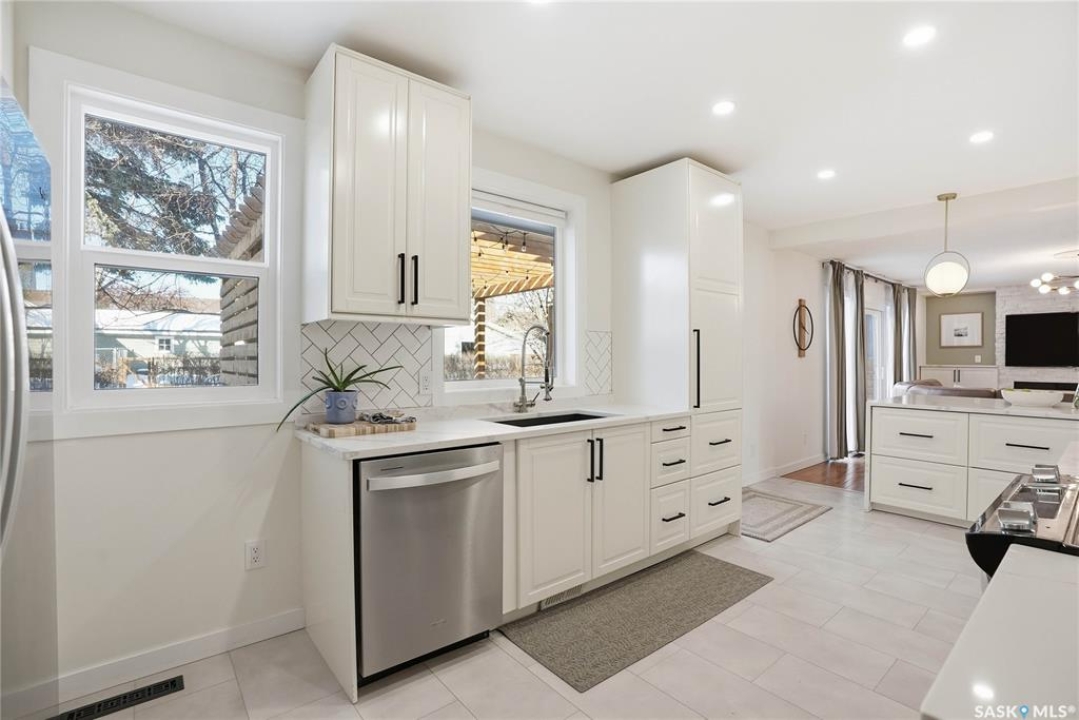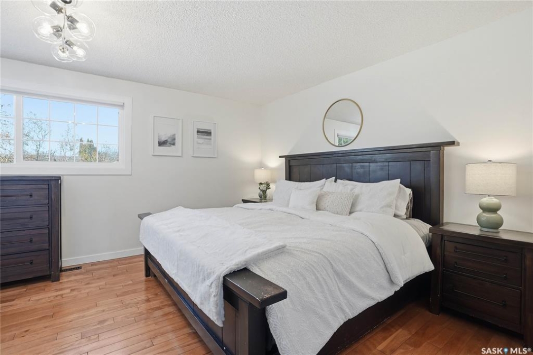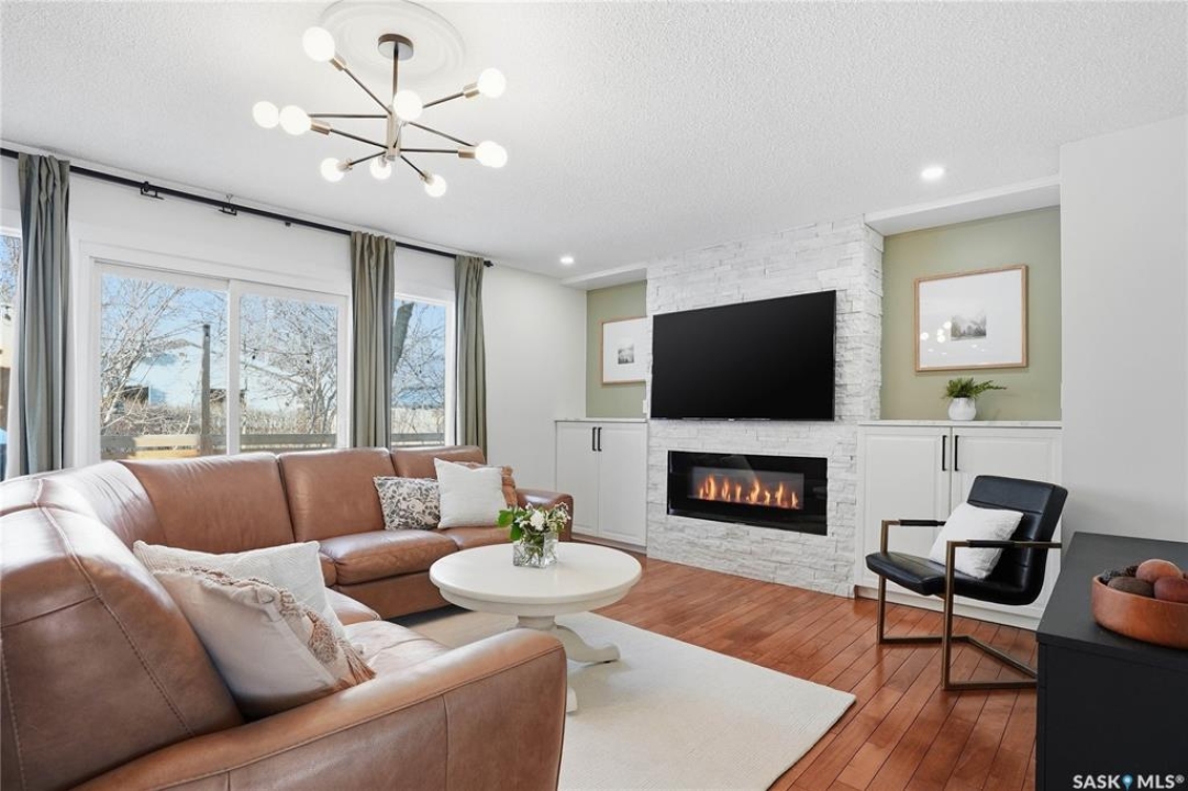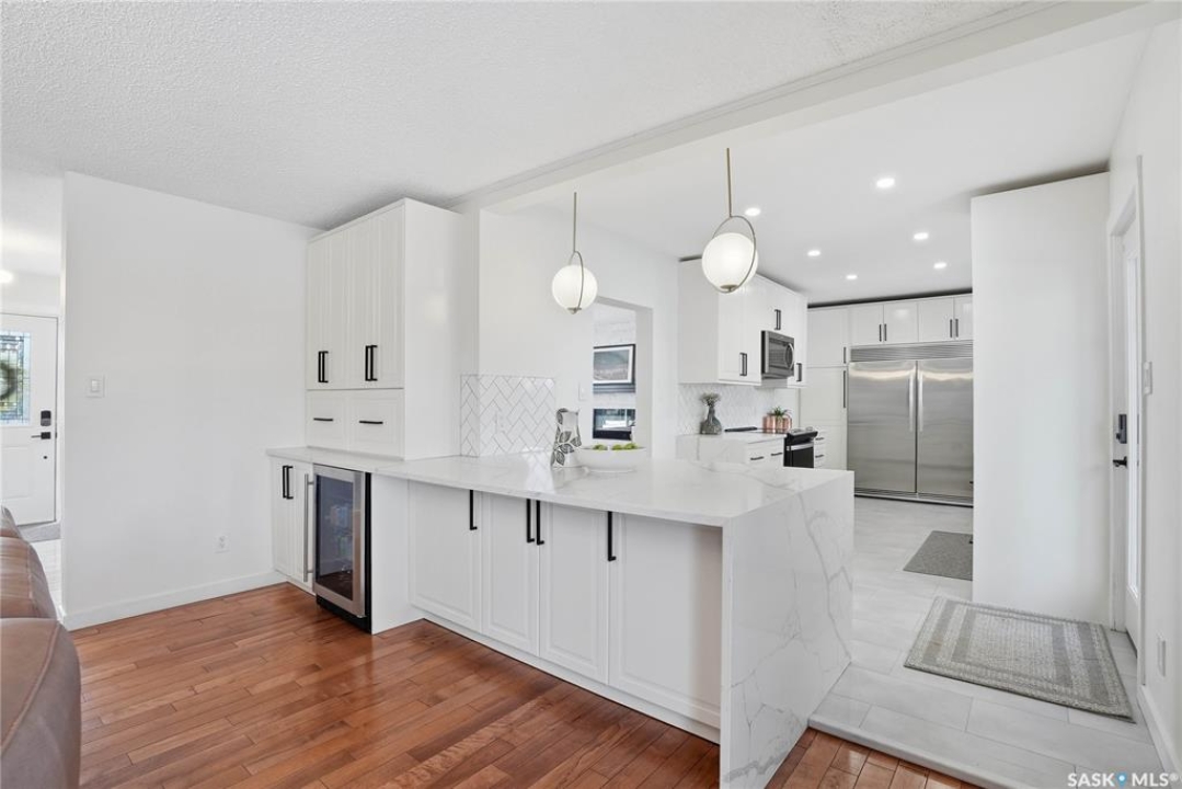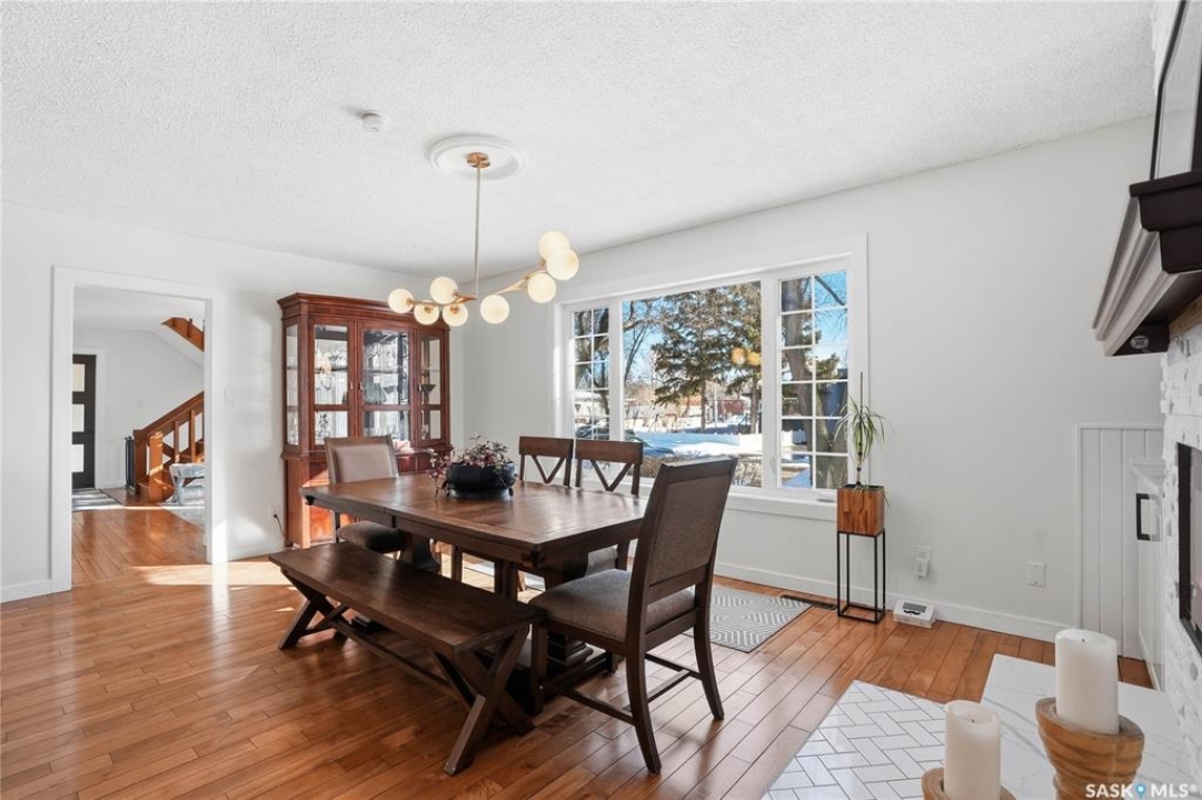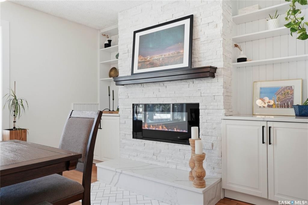 You will not want to miss this exceptional luxury home. Situated on a rare 67' x 140' lot, this fully upgraded 5 bedroom, 4 bathroom property in Varsity View truly has it all. The main floor showcases gorgeous hardwood flooring, with luxury vinyl tile in the kitchen. Designed for entertaining, the kitchen features white quartz countertops, a striking waterfall peninsula with built-in bar fridge and cabinetry, tiled backsplash, and stainless appliances. A spacious dining room with a custom fireplace feature wall and built-in cabinetry comfortably accommodates even the largest gatherings. Upstairs, the primary suite offers a true retreat with a walk-in closet and custom electric fireplace feature wall, along with a sleek 3 piece ensuite finished with tile, while the additional bedrooms are served by a beautifully appointed 4 piece bathroom. The fully developed basement adds incredible flexibility with a custom bar featuring quartz countertops and a wine fridge, a fifth bedroom, and a 4 piece bathroom. The thoughtfully designed laundry area includes quartz counters, hanging racks, and a laundry sink. Outside, the property continues to impress with a massive deck and oversized pergola, creating an ideal outdoor entertaining space overlooking the expansive yard complete with fenced garden boxes and a large storage shed the size of a single detached garage. Parking and workspace are exceptional with an attached single garage featuring epoxy floors, electric heater, and prep kitchen, along with a double detached heated garage and a double-length driveway out front. With many new windows and doors, extensive upgrades throughout, and one of the largest lots in Varsity View, this home offers a rare combination of space, design, and lifestyle.