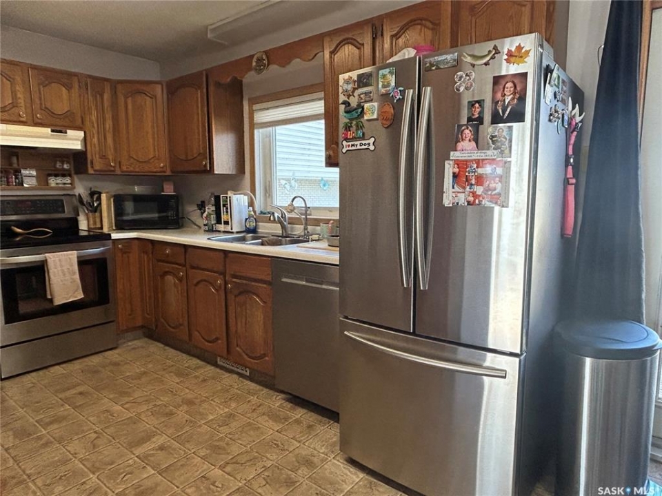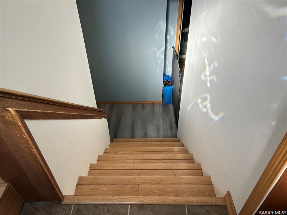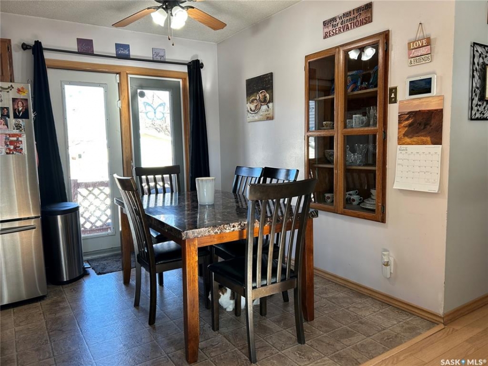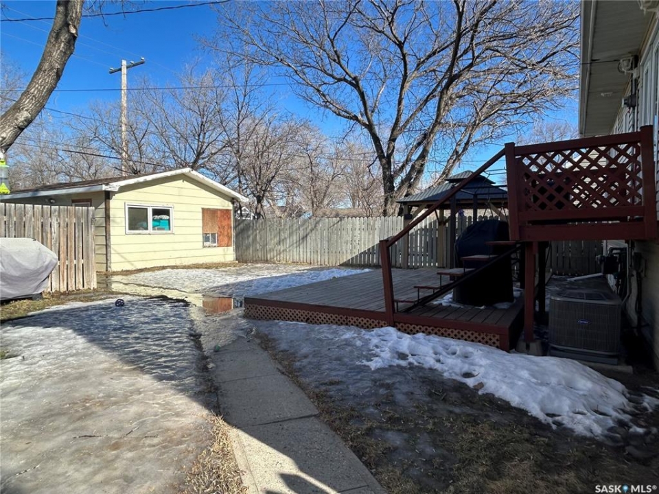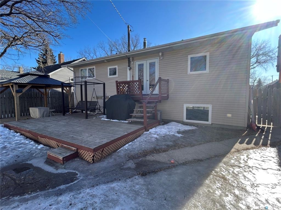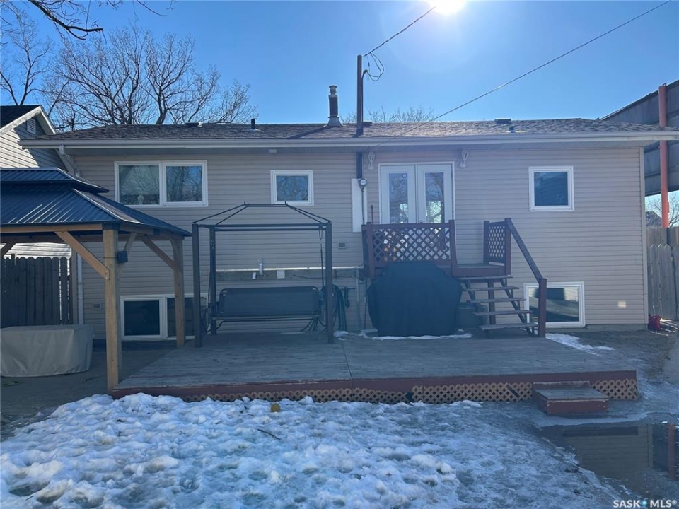 Welcome to this well-maintained bi-level home located in a quiet area of Estevan. The home welcomes you with a spacious entry foyer complete with a convenient closet for storage. The upper level features a bright and inviting living room at the front of the home, along with a kitchen offering ample cupboard and counter space. The dining area with double doors to the deck is set separately, providing a comfortable space for everyday meals. This level also includes two bedrooms and a full bathroom. The lower level offers excellent use of space with large windows that allow plenty of natural light. Here you will find a cozy family room, two additional bedrooms, and a beautifully finished three-piece bathroom. Many of the home's major updates have already been completed. Outside, the deck off the dining room extends down to a ground-level deck, and then onto a patio area with a permanent gazebo. The property also features a good-sized shed, a single garage, and parking for two vehicles from the back alley. In addition, there is a front driveway and street parking available. The furnace is approx. 4 years old, in 2025, a new central air conditioner unit was installed, as well as the water heater, and shingles on the house and garage. Windows and vinyl siding replaced in 2010 and the basement bathroom was recently updated. Newer gazebo stays.