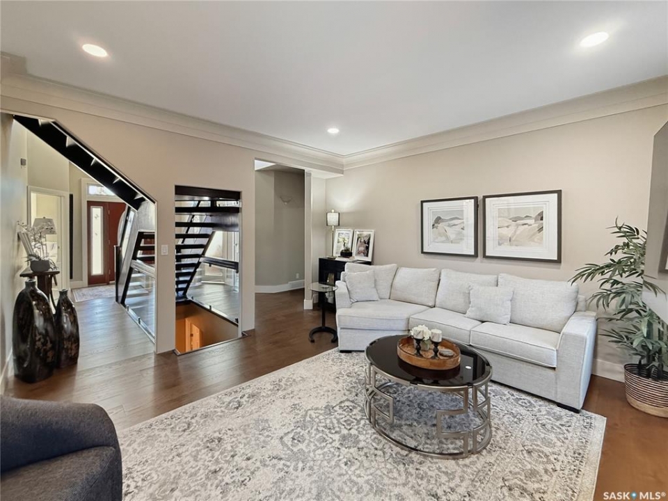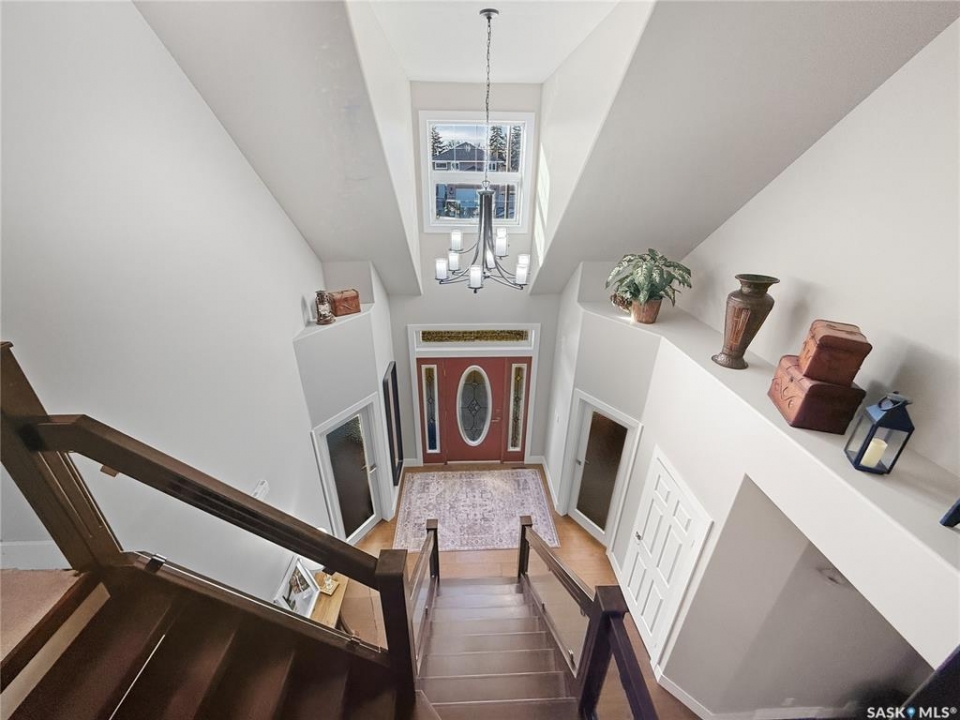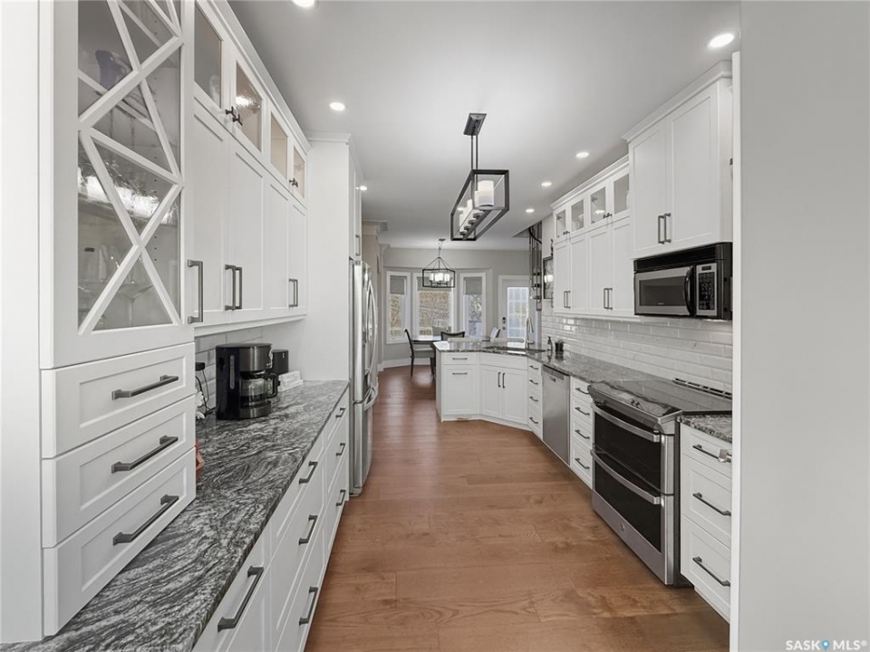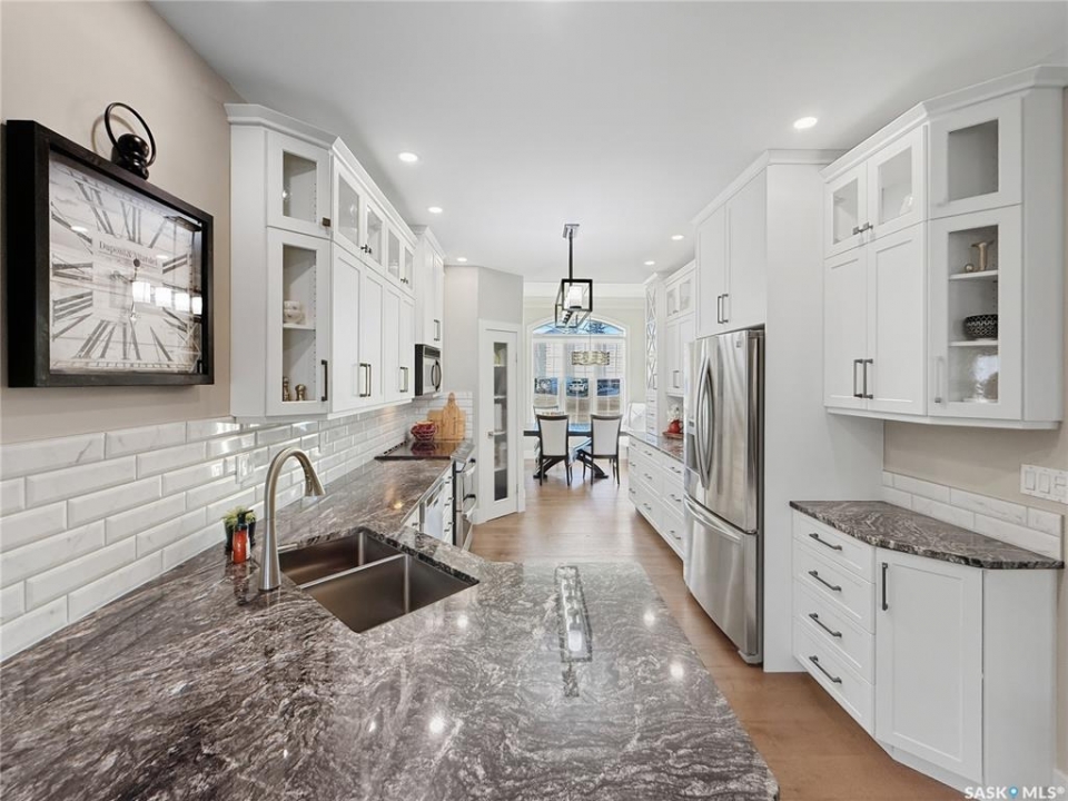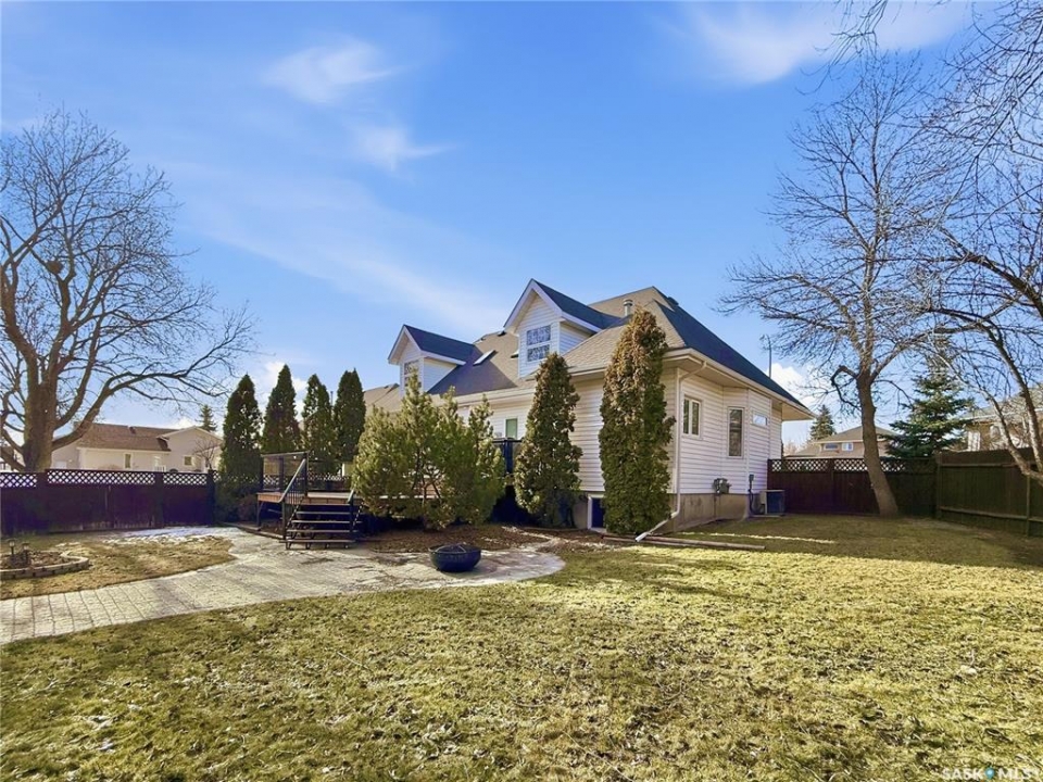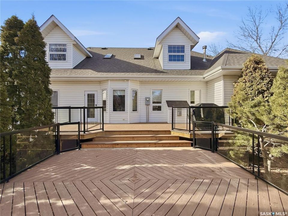 Executive two-storey home located on a quiet cul-de-sac in Swift Current's desirable North Hill neighbourhood. Situated on a mature, oversized pie-shaped lot, this beautifully maintained property offers over 2,400 sq ft above grade with a layout ideal for both everyday living and entertaining. A grand staircase welcomes you into the impressive foyer featuring 10' ceilings, crown moulding, and engineered hardwood flooring. The main floor includes a private office with French doors, a formal dining room filled with natural light, and a spacious living room with updated windows, quality blinds, silk curtains, and a cozy gas fireplace. The fully renovated kitchen (2019) showcases white cabinetry, granite countertops, tile backsplash, under-cabinet lighting, and stainless steel appliances including a double-oven slide-in range. A sit-up peninsula and bright east-facing dining nook provide access to the composite deck and backyard. Main floor laundry, a powder room, and direct entry to the attached garage add everyday convenience. The main floor primary suite offers privacy with a walk-in closet and renovated ensuite featuring granite counters, an oversized custom shower, and a corner jetted tub. Upstairs features a large family room with skylights overlooking the foyer, two spacious bedrooms with a generous Jack & Jill closet, and a full bathroom. The fully developed lower level includes a family room, two bedrooms, a three-piece bath, dance studio/flex space, storage rooms, and access to the lower-level garage. Parking and storage are exceptional with a front attached double garage plus a second garage with alley access—ideal for extra vehicles, hobbies, or workshop space. The private east-facing backyard offers mature landscaping, an oversized tiered composite deck, underground sprinklers on timers, and space to build an additional garage if desired. Close to Elmwood School, the Comprehensive High School, Elmwood Golf Course, and nearby amenities.