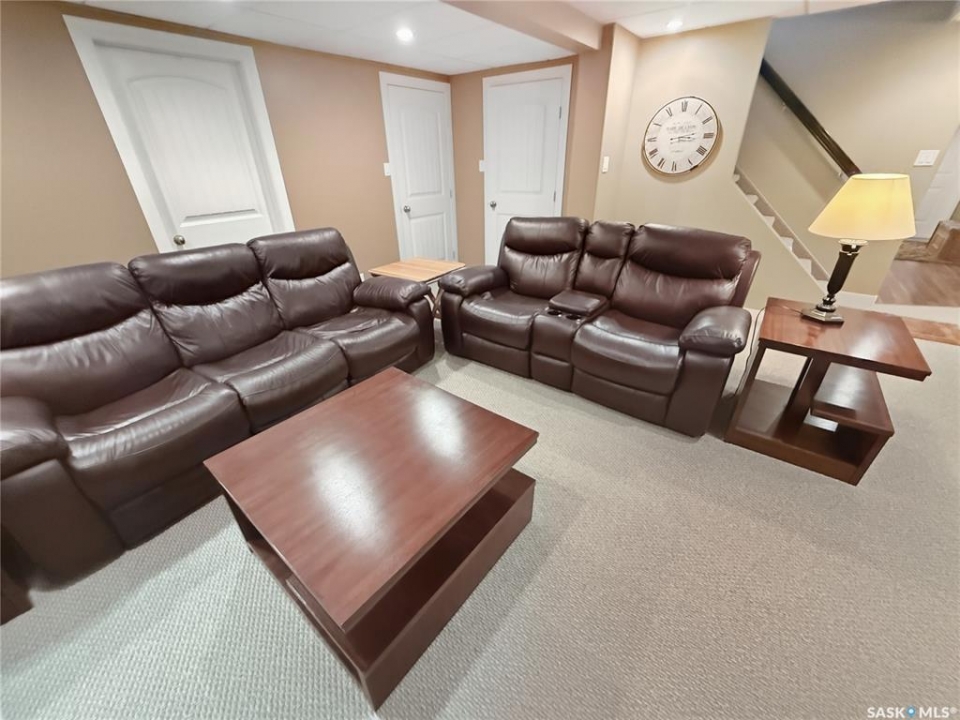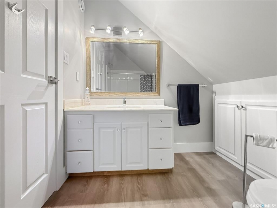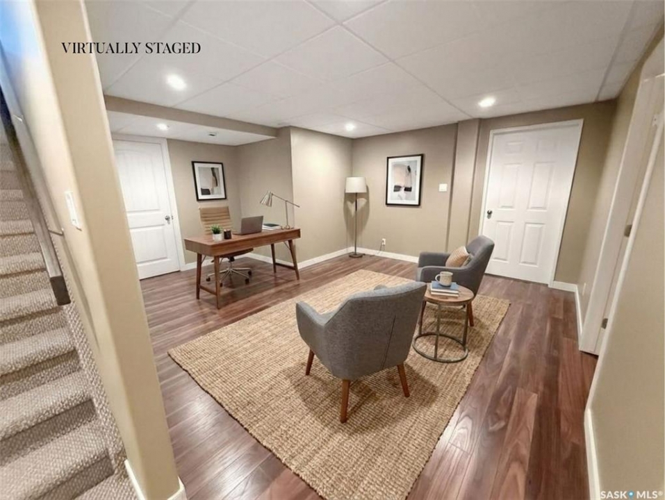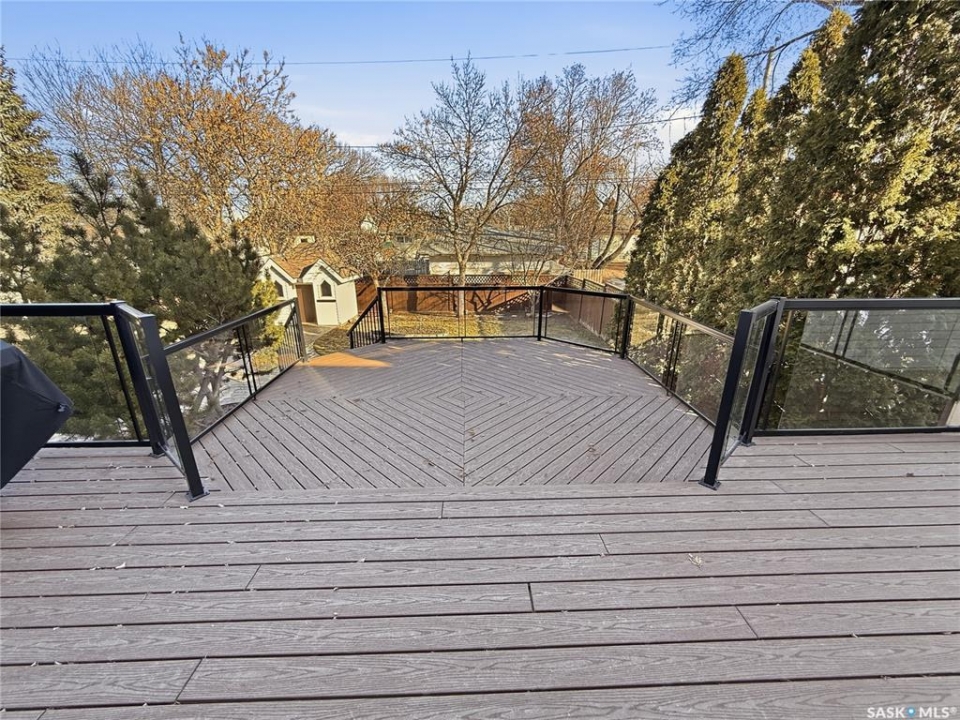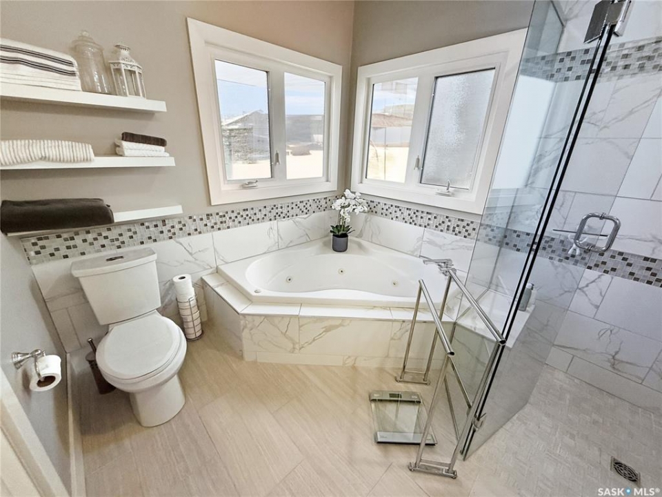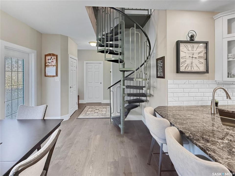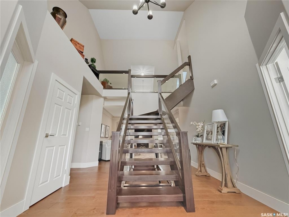 Executive two-storey home located on a quiet cul-de-sac in Swift Current's desirable North Hill neighbourhood. Situated on a mature, oversized pie-shaped lot, this beautifully maintained property offers over 2,400 sq ft above grade with a layout ideal for both everyday living and entertaining. A grand staircase welcomes you into the impressive foyer featuring 10' ceilings, crown moulding, and engineered hardwood flooring. The main floor includes a private office with French doors, a formal dining room filled with natural light, and a spacious living room with updated windows, quality blinds, silk curtains, and a cozy gas fireplace. The fully renovated kitchen (2019) showcases white cabinetry, granite countertops, tile backsplash, under-cabinet lighting, and stainless steel appliances including a double-oven slide-in range. A sit-up peninsula and bright east-facing dining nook provide access to the composite deck and backyard. Main floor laundry, a powder room, and direct entry to the attached garage add everyday convenience. The main floor primary suite offers privacy with a walk-in closet and renovated ensuite featuring granite counters, an oversized custom shower, and a corner jetted tub. Upstairs features a large family room with skylights overlooking the foyer, two spacious bedrooms with a generous Jack & Jill closet, and a full bathroom. The fully developed lower level includes a family room, two bedrooms, a three-piece bath, dance studio/flex space, storage rooms, and access to the lower-level garage. Parking and storage are exceptional with a front attached double garage plus a second garage with alley access—ideal for extra vehicles, hobbies, or workshop space. The private east-facing backyard offers mature landscaping, an oversized tiered composite deck, underground sprinklers on timers, and space to build an additional garage if desired. Close to Elmwood School, the Comprehensive High School, Elmwood Golf Course, and nearby amenities.