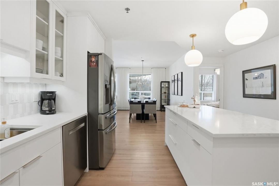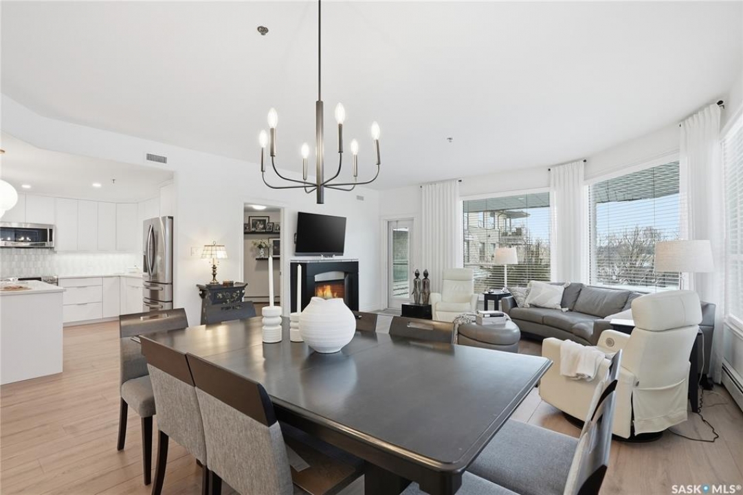 Wow!With so many upgrades, this unit shows almost like new! Truly a rare find on prestigious Sask Crescent. Stunning 1,418 sq ft, 3-bedroom main floor corner unit and a former show suite located in a quiet, well-managed complex. Enjoy beautiful river views in the fall and winter, impressive 9' ceilings, and large panoramic windows that fill the home with natural light. This home has undergone extensive renovations and rebuilding, creating a refreshed interior that feels almost brand new. Major Interior Renovations (2025): Approximately 90% of the drywall replaced New electrical wiring and upgraded panel Redone ceilings and updated insulation 9-inch luxury vinyl plank flooring throughout (no off-gassing) Stunning Kitchen Renovation (2025): The beautifully upgraded kitchen features quartz countertops, modern backsplash, high-end appliances, soft-close cabinetry, and a sleek contemporary design, creating a bright and highly functional cooking space. Bathroom Upgrades(2025): Both bathrooms have been refreshed, including a fully renovated ensuite with a brand-new shower, vanity, mirrors, and modern finishes. Additional Interior Improvements Include(2025): Updated doors, trim, and baseboards. New lighting fixtures and backsplash. Upgraded vanity countertop, Custom laundry cabinetry ($6,000 upgrade). Premium Miele washer & dryer Window Coverings & Finishing Touches(2025): Hunter Douglas blinds ($4,300) Custom drapery in the living room and bedroom With extensive structural and cosmetic upgrades, this beautifully refreshed home offers the feel of a newly rebuilt interior in one of Saskatoon's most desirable locations on Sask Crescent.