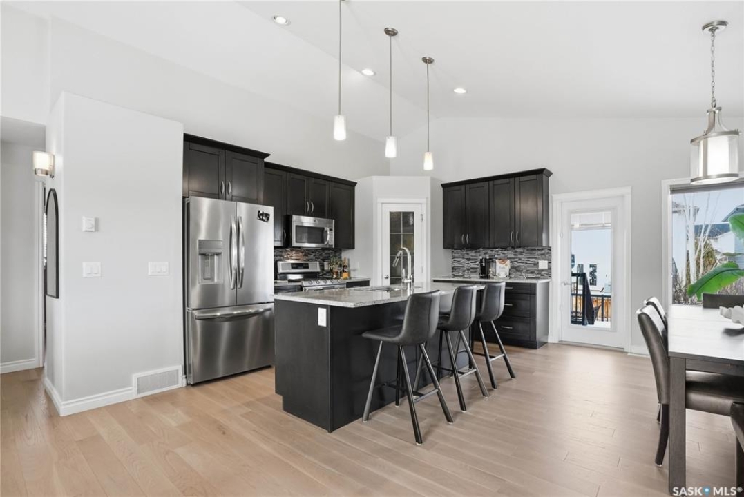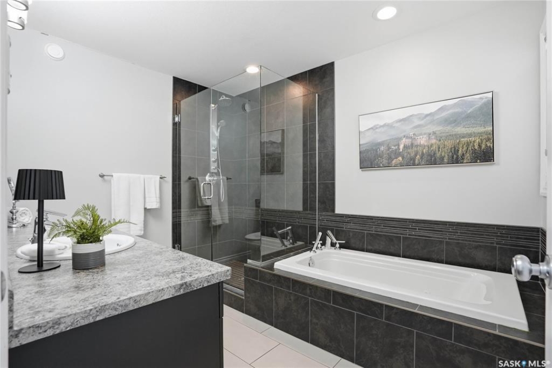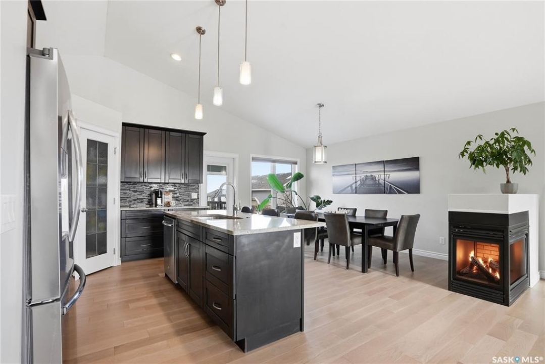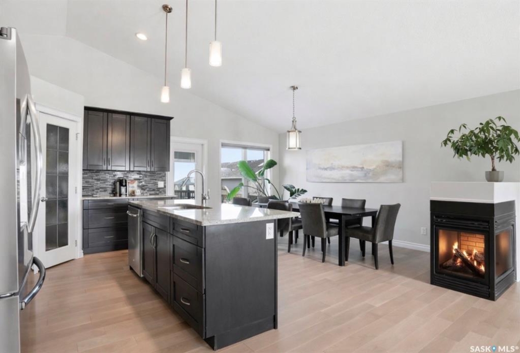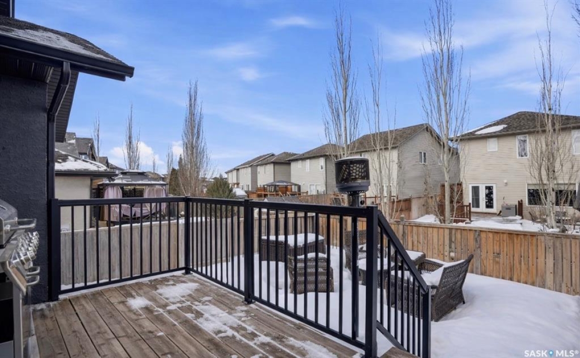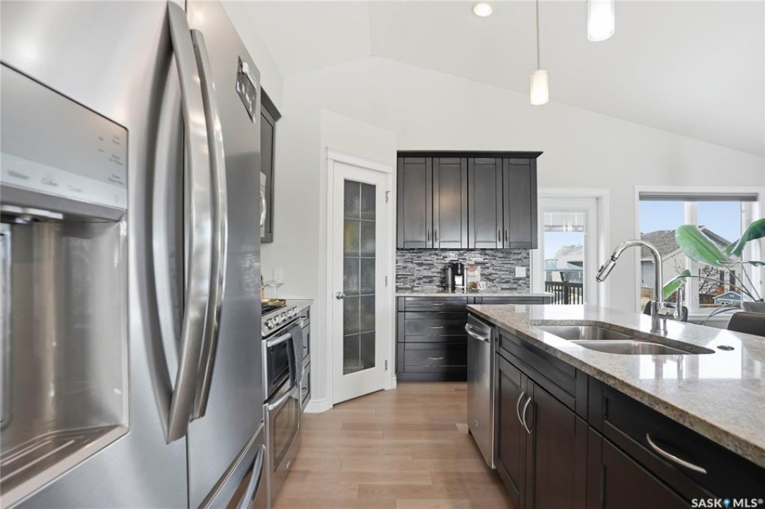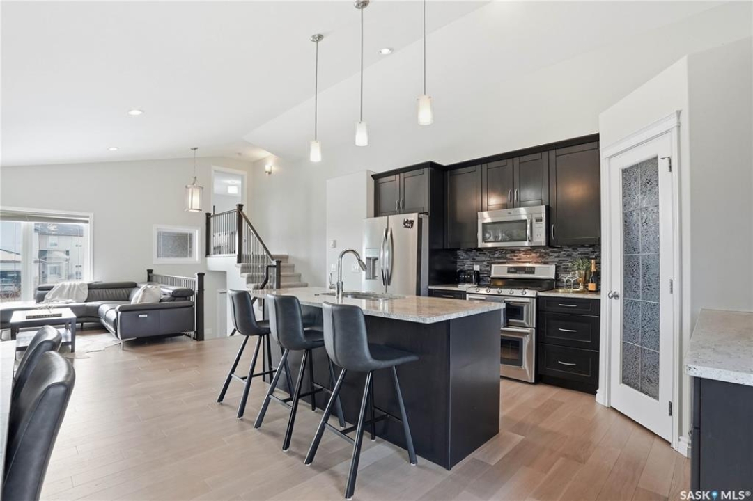 Stonebridge modified bi-level offering 1,455 sq. ft., 4 bedrooms, and 3 full bathrooms, ideally located on one of the neighbourhood's most desirable crescents — with all the features you could hope for! Step into a welcoming vaulted foyer. Just ahead is a bright, open great room featuring gorgeous newer genuine modern hardwood floors, a large picture window, a 3-sided fireplace, and soaring vaulted ceilings that continue throughout the main living space. The great room connects to a spacious dining area and a modern kitchen complete with stainless steel appliances, a central island with granite counters, tile backsplash, and a corner pantry — an exceptional layout for family living and entertaining. The main floor also offers a functional laundry room, 2 bedrooms, and a 4-piece bathroom with granite counters and tile flooring. The second level is a luxurious primary suite, featuring an oversized bedroom with a connected sitting room. The 5-piece ensuite includes a jetted soaker tub, glass shower with tile surround, double sink vanity, and a customized walk-in closet with drawers and built-in storage. The fully developed basement provides even more living space with a very spacious family room featuring a 2nd gas fireplace, a four-piece bathroom, and a connected games area or gym. This level also includes a lrg 4th bedroom with walk-in closet, plus utility and storage space. Outdoor living is accessed from the great room, leading to a fantastic double-tiered deck — truly an entertainer's dream. The yard offers tall trees for privacy and complete landscaping, plus shed storage. Additional upgrades include a heated double garage, heated floors in bathrooms, newer high-end hardwood throughout the entire main floor, central air, u/g sprinklers, nat gas BBQ hookup, customized closets, central vac, and two gas fireplaces. Located just a short distance to parks, schools, and shopping, this home sits on one of Stonebridge's most sought-after streets.