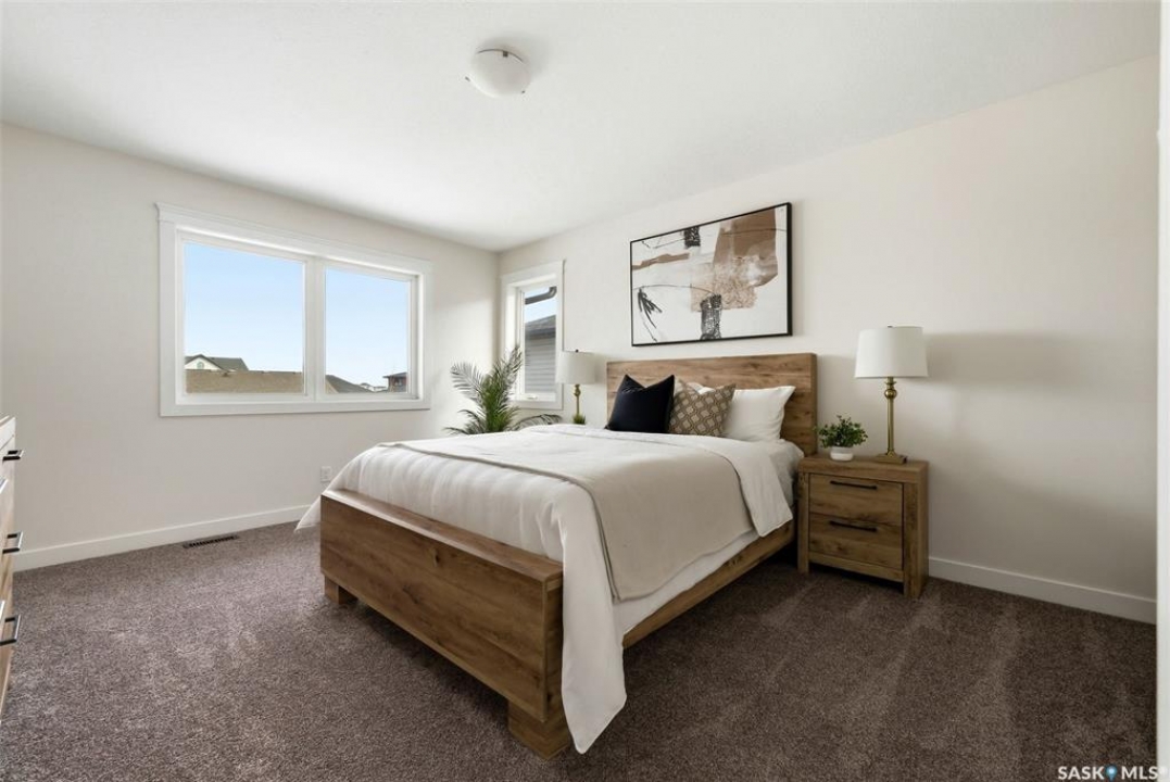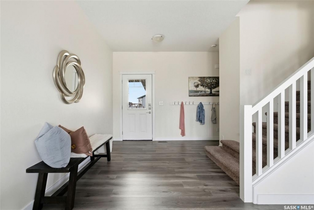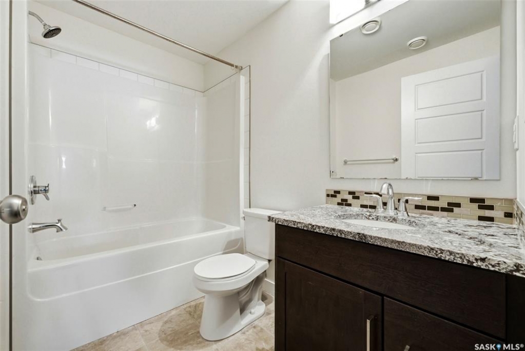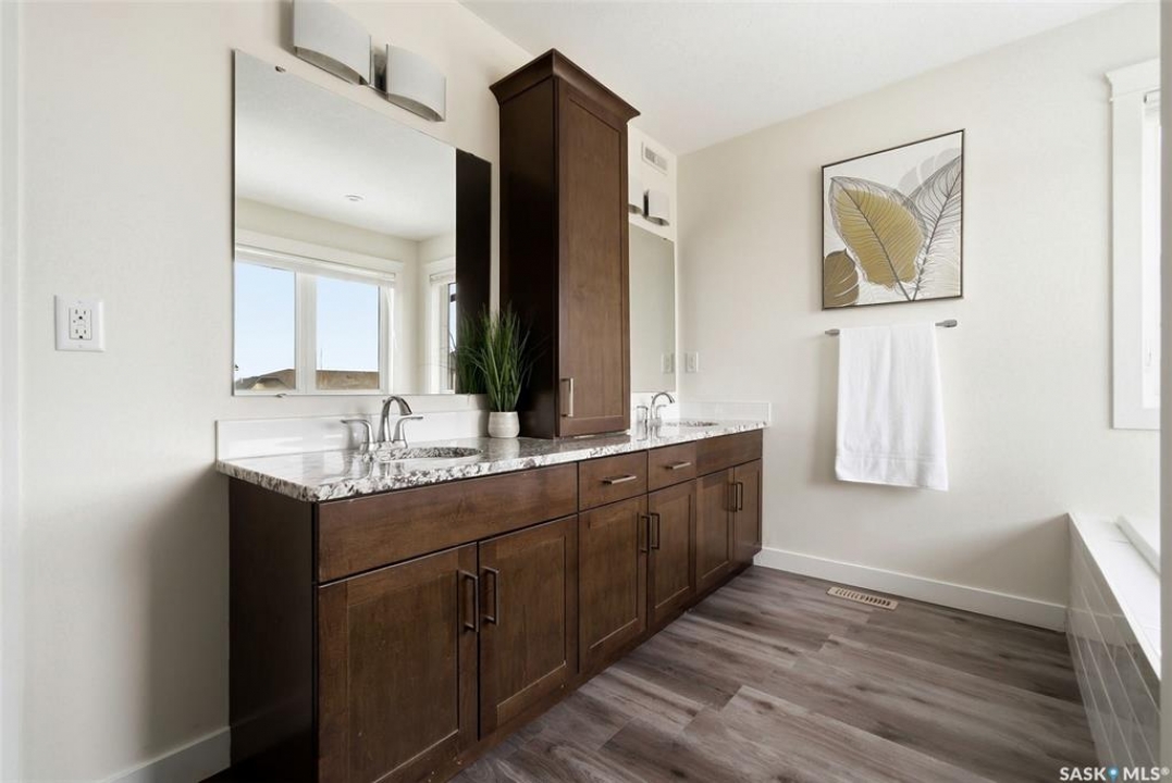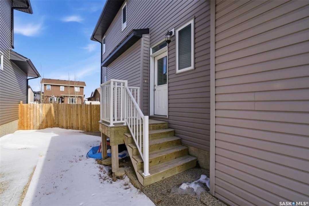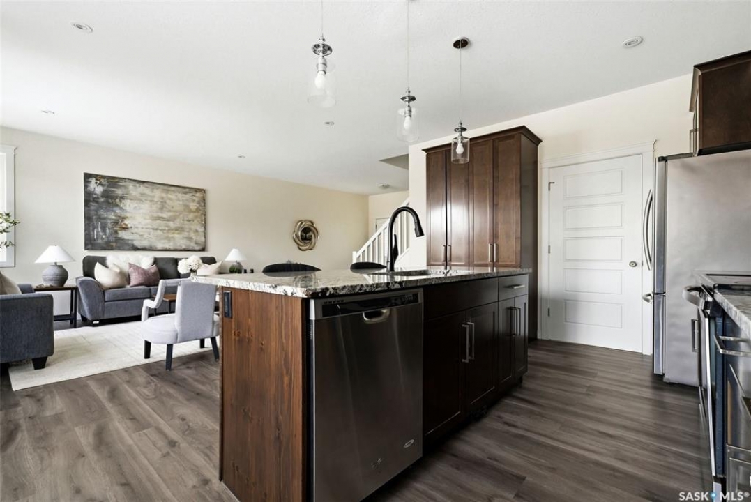 Welcome to 4830 Green Apple Drive, located in the heart of the desirable Greens on Gardiner neighbourhood. This custom-built two-storey offers over 1,730 sq. ft. of well-designed living space, featuring 4 bedrooms and 4 bathrooms, plus a fully developed basement with separate side entrance. Open-concept main floor features 9-foot ceilings and newer vinyl plank flooring throughout, creating a bright and modern living space. A convenient mudroom area leads to the double attached garage, adding functionality for everyday living. The spacious living room is filled with natural light thanks to large windows overlooking the backyard. The kitchen is beautifully finished with espresso-toned maple cabinetry, a built-in pantry, granite countertops, tile backsplash, soft-close drawers, and a large island perfect for meal prep or casual dining. The adjoining dining area provides plenty of space for family gatherings and features a garden door leading to the back deck with gas BBQ hookup. The deck overlooks the fully fenced backyard with lawn, offering great space for outdoor enjoyment. A two-piece powder room is conveniently located near the front closet and garage entrance. Upstairs, the second level offers three good-sized bedrooms, including a spacious primary suite featuring a large walk-in closet and a five-piece ensuite with jetted tub, double vanity with granite countertops, and separate shower. The second level also includes a full four-piece main bathroom and convenient second-floor laundry. New carpet throughout the second level adds a fresh feel. Fully developed basement, with separate side entrance, features a large recreation room with wet bar area, an additional spacious bedroom, and a four-piece bathroom with granite vanity, offering great extra living space. This home is ideally located within walking distance to École Wascana Plains School and École St. Elizabeth, as well as parks, walking paths, and all east-end amenities.