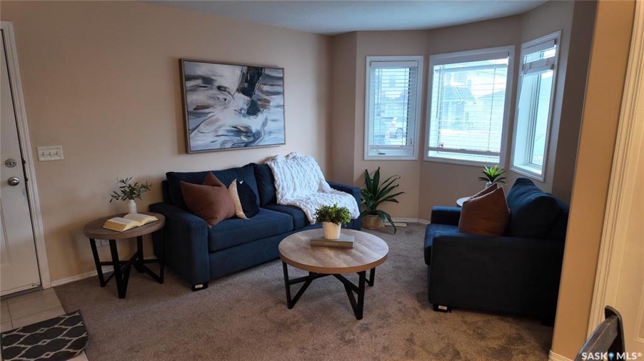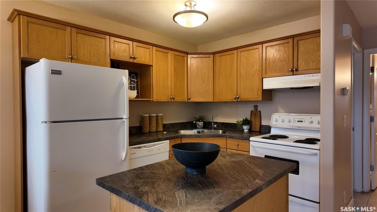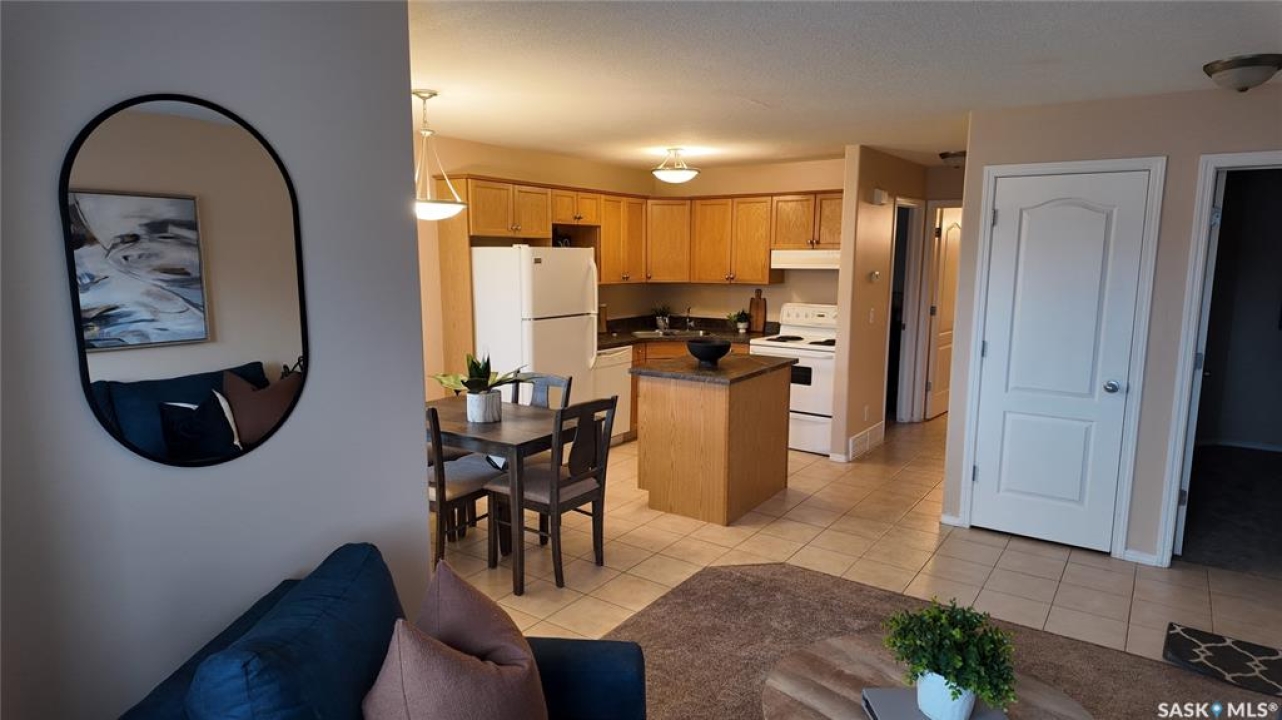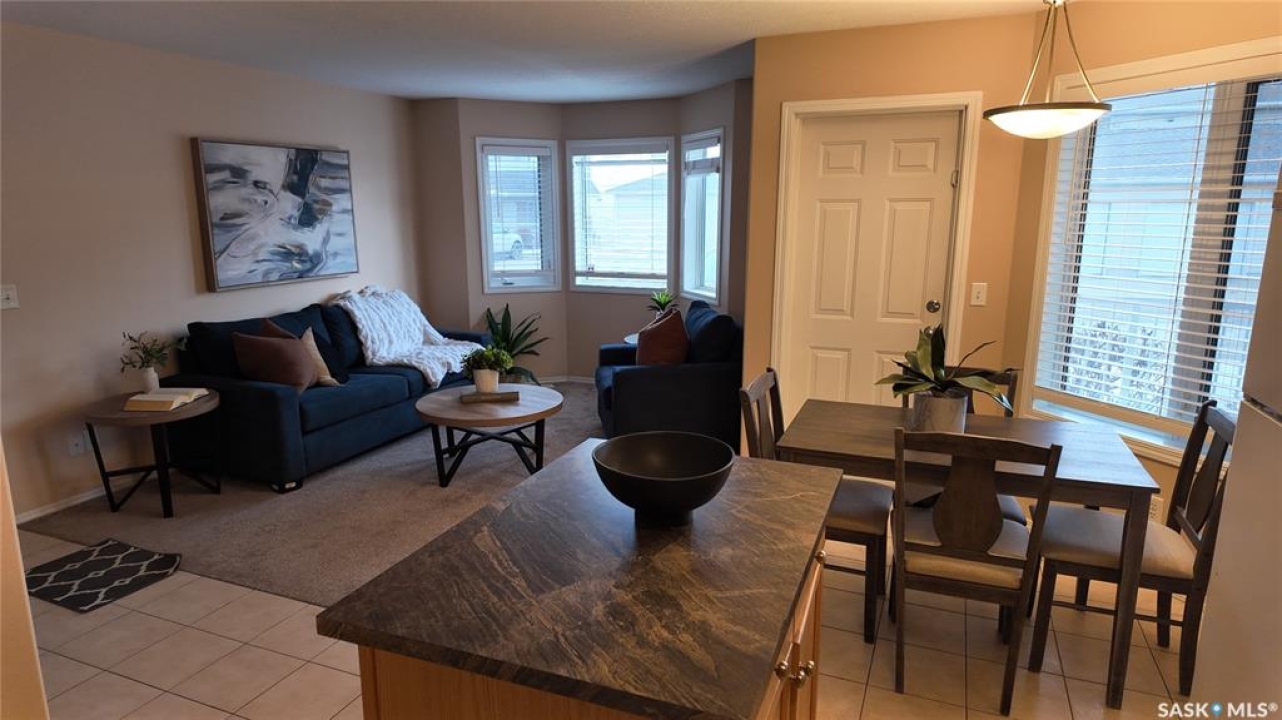 Move-in ready and full of natural light, this **2-bedroom condo** is located in Regina's sought-after **east end** in a **quiet, well-maintained condo complex**. Ideally situated **across the street from public and separate schools**, this home offers a functional **open-concept layout** combining the kitchen, living, and dining areas. **Morning sunshine fills the unit**, adding warmth and brightness throughout the main living space. The kitchen is well-equipped with **plenty of cabinetry**, a **centre island**, and **new countertops**, making it perfect for everyday use and entertaining alike. Both bedrooms are generously sized with **walk-in closets**, and the **private deck** is a great spot to enjoy your morning coffee. **Four appliances are included**, making this an economical and practical choice for a variety of buyers.