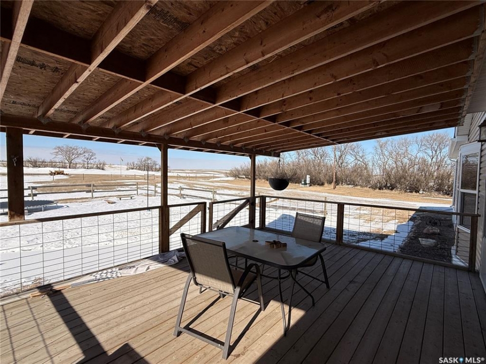 Tucked away on a no-thru road, just 15 minutes from the Town of Outlook with only 3 minutes of gravel...sits this move in ready, 4 acre West Outlook Acreage. This well-designed home features 3 Bedrooms and 2 Bathrooms with a thoughtful separate kids/parents floor plan that offers comfort and functionality. A dedicated playroom area gives families their own space while keeping the main living areas free and inviting. The heart of the home includes an open kitchen with breakfast bar seating just steps from the beautiful deck to take in those stunning country views! A true standout feature of this property is the impressive 30' x 34' heated garage/shop. Fully equipped with a half bathroom, sloped concrete floors, 220v plug, workbench, side-mount opener and even air conditioning, its perfectly set up for projects, storage, or a home-based business! Outdoors, the property continues to impress with a functional cook shack, 7 CAMPSITES (5 serviced with power, water, septic...2 only power and water) a propane hook-up for BBQ and a garden area with a trenched water line- offering both lifestyle and potential income opportunities! This is country living at its best- private, functional and packed with features!