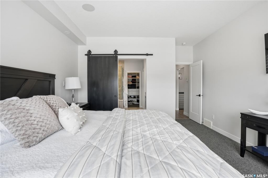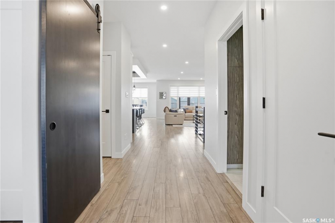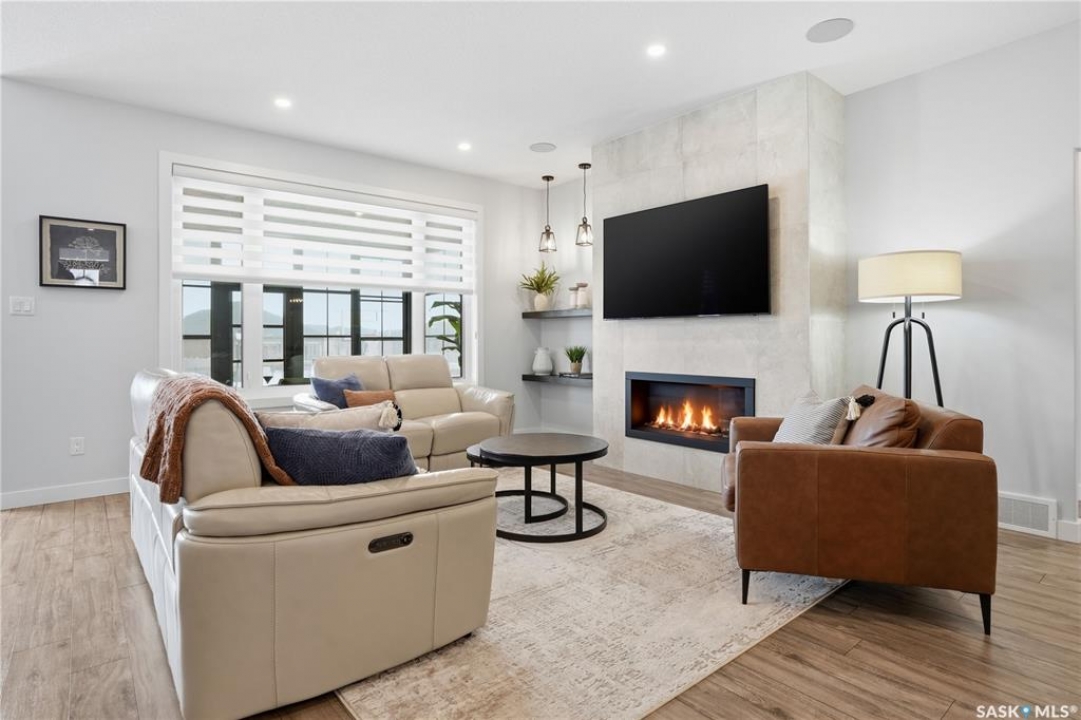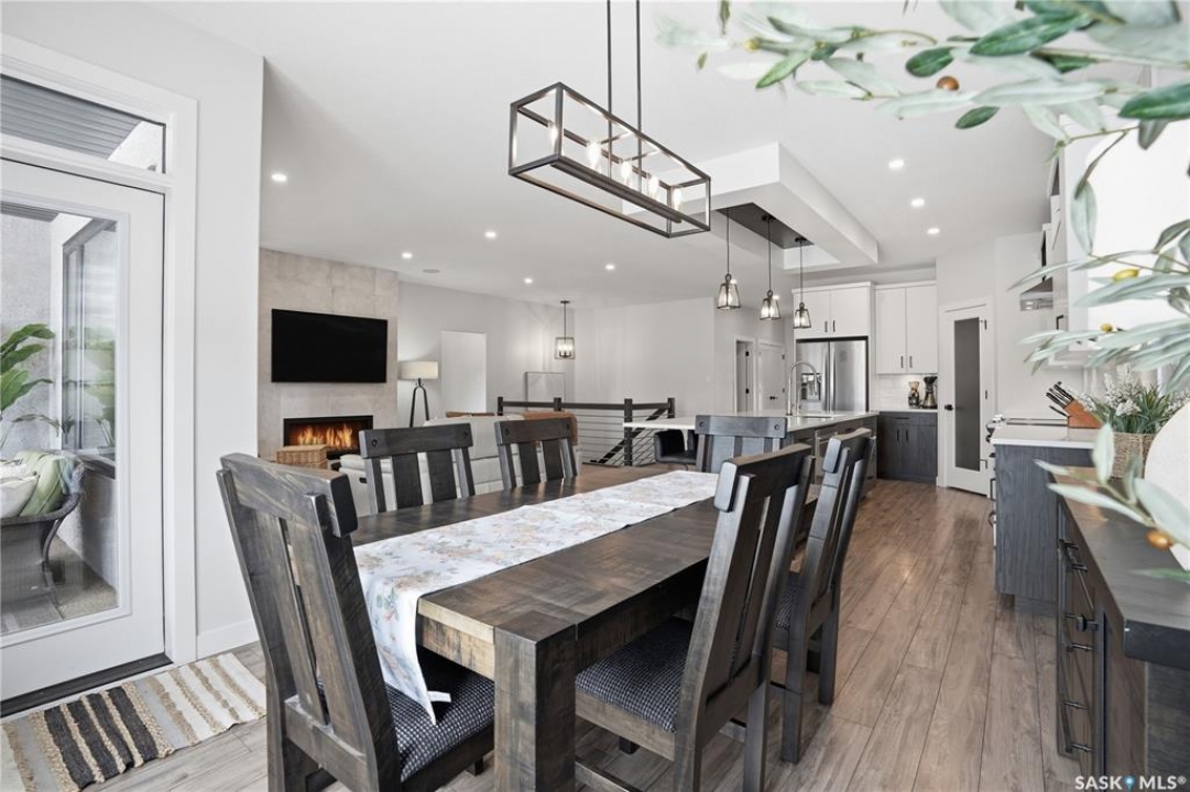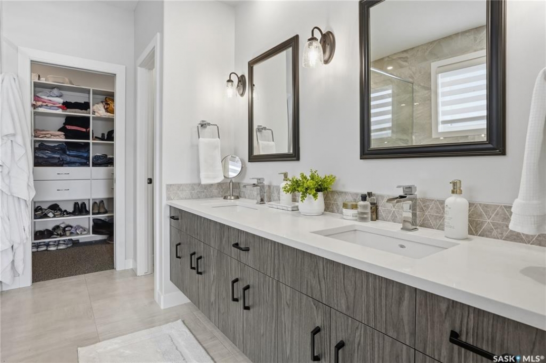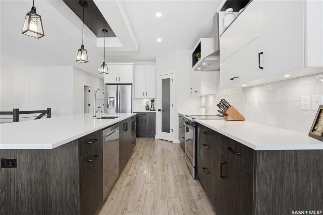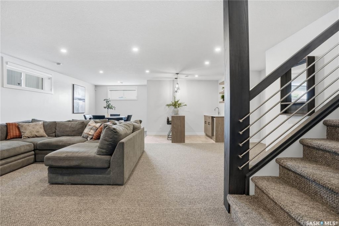 Welcome to 4418 Sage Cr E. This executive-style 1581 sq ft stunning 5 bedroom, 3 bath, fully developed bungalow constructed by Fiorante Homes is perfectly positioned on a large 6297 sq ft lot backing a walking path. Located in The Creeks, & built in 2018, this immaculate property showcases exceptional craftsmanship & an array of high-end upgrades. Upon entry, you will immediately feel the bright space illuminates from the large windows & 9ft ceilings. The heart of any home is the kitchen & this area will surely impress! A massive white quartz island is perfect for entertaining & is truly a chef's dream. The sheer volume of cabinets (white uppers & dark lowers) in the open concept design with SS appliances, a corner pantry, tiled backsplash, under-cabinet lighting, unique lighting, & so much space. The living room extends from the kitchen area with a feature wall showcasing a gas fireplace, floating shelves, & modern design. A spacious dining area is overflowing with light & leads to the sun room with storage beneath. Backing the walking path, this sunroom is truly a beautiful area to enjoy. A sliding barn door off the foyer area leads to a front bedroom (currently used as a den), & another barn door opens to a large mudroom & laundry rm with built-in cabinets/bench, & access to a triple garage. The primary suite features large windows framing the space & a luxurious ensuite complete with a soaker tub, custom shower with bench, dbl sinks, separate washroom, & walk-in closet. The basement is fully developed with an oversized rec room, games area with wet bar, 3 bedrooms (all include a walk-in closet), a full bathroom, & large storage/utility area. A fully fenced backyard offers trees, sod, sprinklers, nat. gas bbq hookup, access to storage beneath sunroom, & the quiet vibe of a lovely neighborhood with a walking path leading to a green space & park. The triple garage is insulated, heated, includes a pit, & has plenty of storage. 4418 Sage Cr is beautiful & one to see!