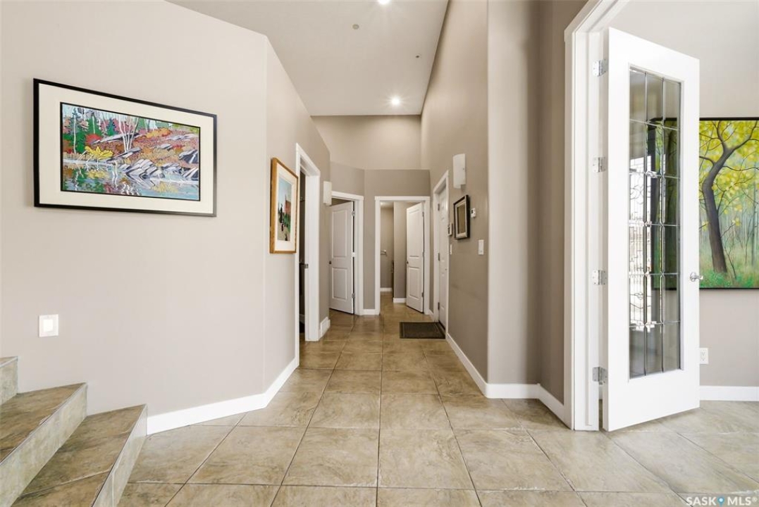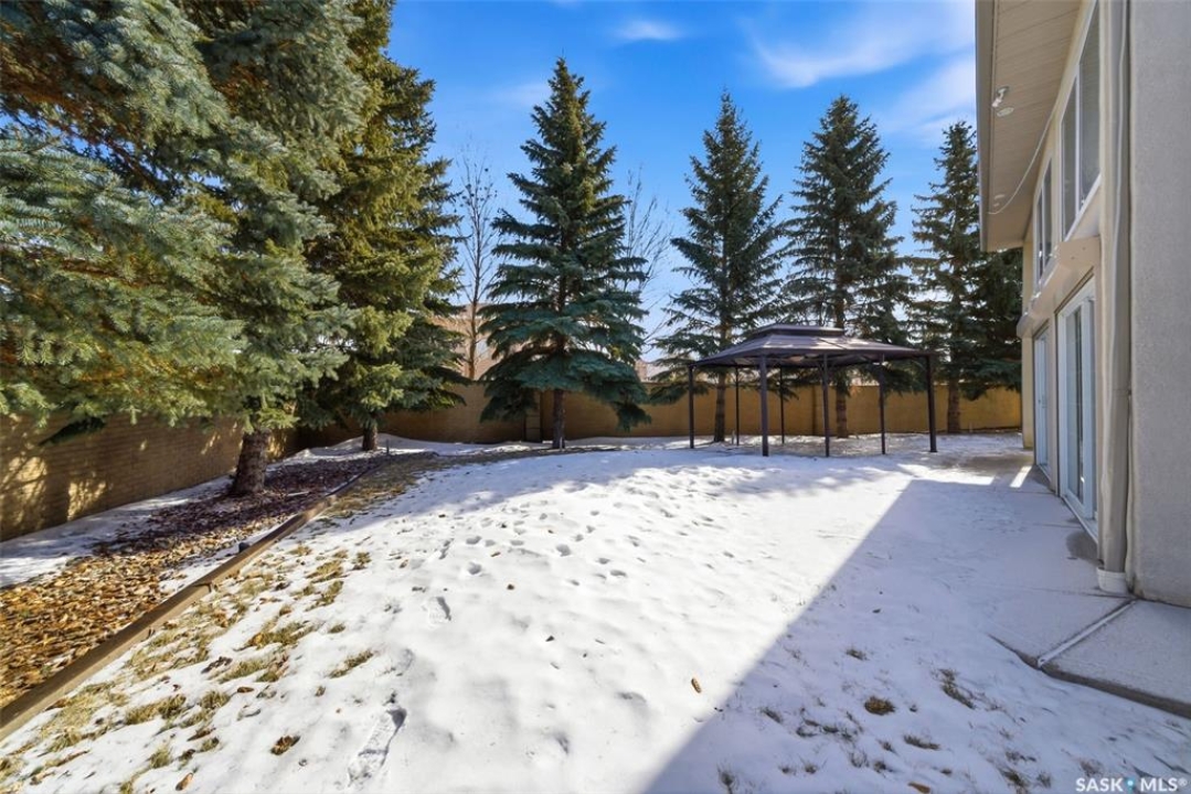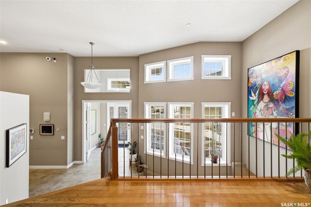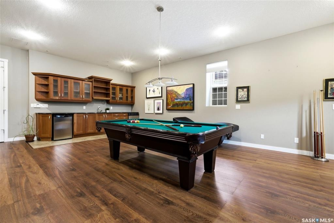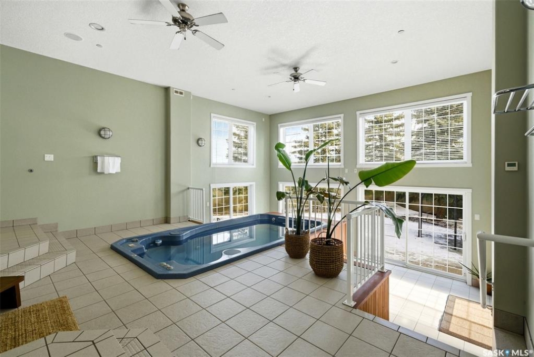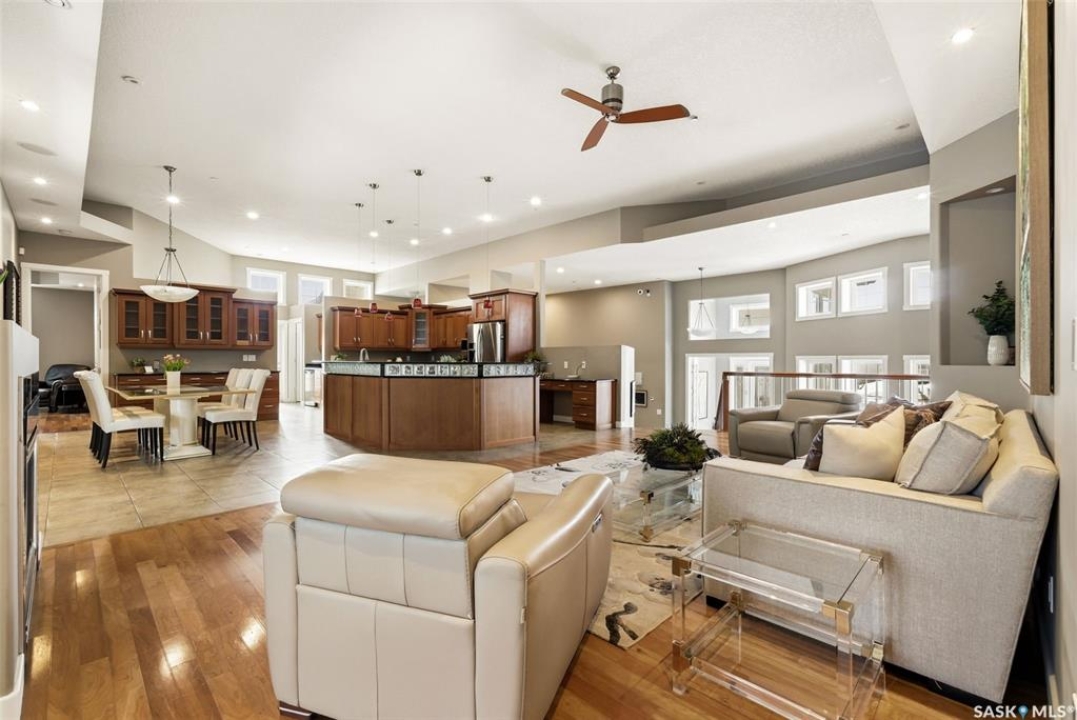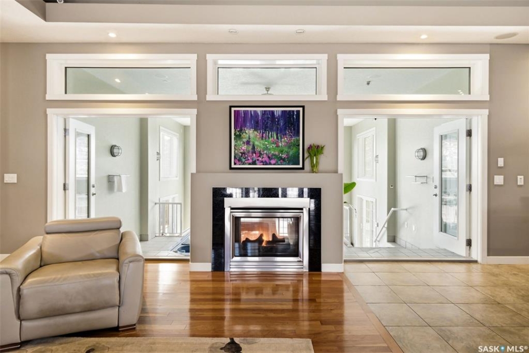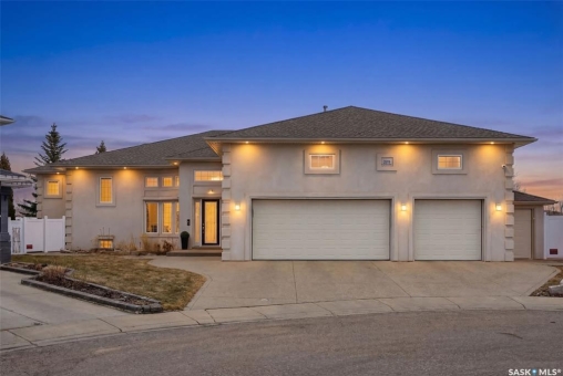 One of a kind in every sense, this custom built home was thoughtfully designed from the ground up. Offering over 3,600 sqft on the main level alone, from the moment you step inside, the scale and quality are undeniable. Featuring 10-ft ceilings & 8-ft doors throughout, hardwood flooring, dimmable pot lighting & expansive windows creating a bright, airy, space that feels more than grand. In the heart of the home, you'll find a chef's kitchen with cherry cabinetry, granite countertops, ceramic tile & walk-in butler's pantry. The open-concept kitchen, dining & living rm layout flows into the stunning four-season sunroom with poolspa, separated by a 2-way gas fireplace creating the coziest space. The main level is complete with 4 generous sized bedrooms with ceiling fans, walk-in closets & direct access to a bathroom. 2 more bedrooms & another bathroom on the fully developed lower level, where you will also find a projector & full-screen theatre setup, pool table, gas fireplace & wet bar complete with granite top, sink, mini-fridge & dishwasher. The perfect space for teenagers, a growing or extended family & friends. Comfort and efficiency were top priorities in the design with radiant in-floor heating, powered by a boiler system & furnace (2023), air exchanger & humidifier. Additional features include reverse osmosis. air exchanger &humidifier, built-in sound system, 200-amp service, backup generator, electric roll-up security shutters, cold storage &built-in fire sprinkler system. The oversized triple garage (tandem for 4 vehicles) includes a separate 125-amp panel, floor drain, side overhead door for backyard access, and a loft space ideal for a workshop. Outside, the expansive crescent lot is fully fenced yard with mature trees, fenced garden & outdoor kitchen. Located on a quiet cul-de-sac & steps from Jack Mackenzie &St.Gabriel, Sandra Schmirler Leisure Centre &all east-end amenities. A truly distinctive property in one of Regina's most established neighborhoods.