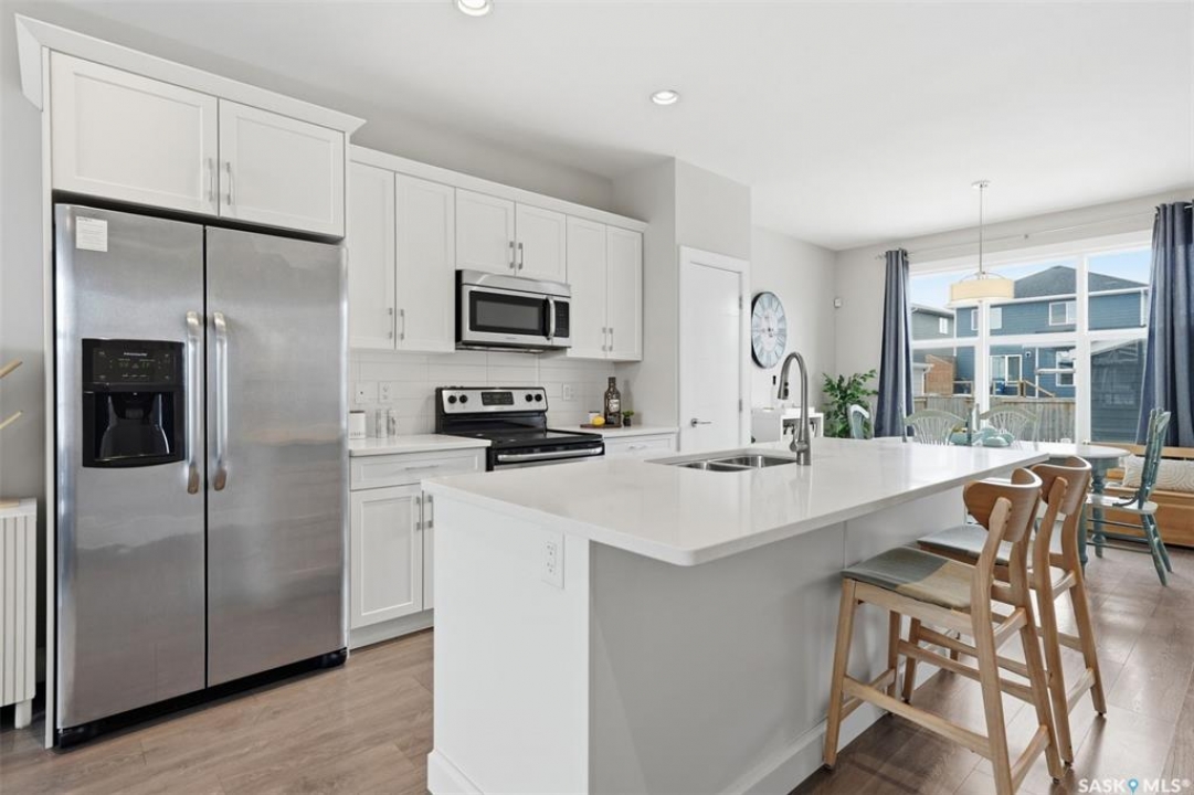 This well-maintained home is located in The Meadows of Rosewood and features a functional open-concept main floor with a spacious family room, dining area, and kitchen. The kitchen includes quartz countertops, a tiled backsplash, stainless steel appliances, pantry, white cabinetry, and an island with seating. Upstairs offers three generously sized bedrooms, all with large windows, built-in shelving, and French door closets. The primary bedroom includes a walk-in closet and a private ensuite. A full bathroom and optional laundry hookups are also located on the second level. All bathrooms feature quartz countertops and tiled flooring. The basement is undeveloped and ready for future customization. A separate side entrance provides potential for a legal suite.The fully landscaped yard is spacious and fully fenced. The double detached garage is insulated, heated, and finished with epoxy flooring. Additional features include central air conditioning and a security system.