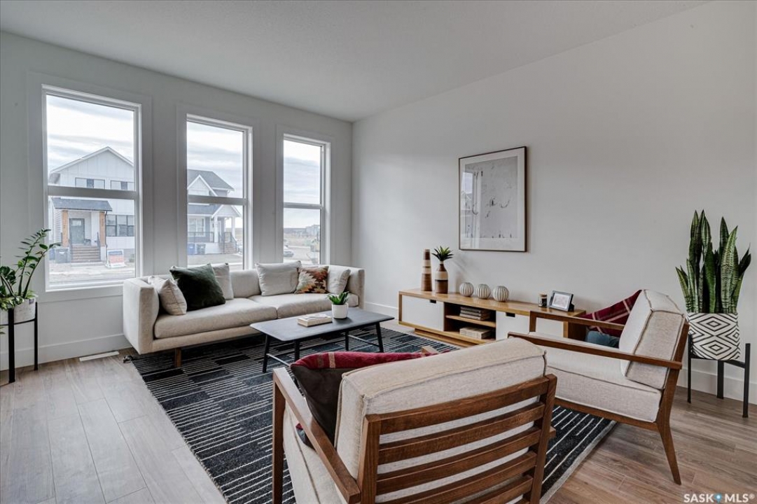 Welcome to Hudson Row 3, Saskatoon's newest townhome project located in The Meadows at Rosewood. This Scandinavian inspired streetscape will create an unmatched timeless curb appeal that is sure to catch people's eye. The 1461 SF open concept interior includes all the premium designer finishes people have come to expect with Arbutus Properties. The main floor includes an efficient layout with large front and back windows that flood the space with natural light and is covered by premium flooring. The centrally located chef's kitchen includes trendy flat panel cabinetry highlighted with matt black hardware, quartz counters, stylish backsplash and a full stainless appliance package. The upper floor includes 3 generously sized bedrooms, 4pc bathroom, a convenient flex space that was designed to cater to a variety of uses and an easy to access laundry closet. Also on the upper floor is the master bedroom that includes a walk-in closet and a private ensuite. The exterior of the home is covered in durable James Hardie composite siding and comes inclusive with private fenced landscaped yards, a rear deck & a double detached garage at the rear. Located near multiple parks, commercial amenities, Costco and within a block from 2 new community schools makes this a must see! "Disclaimer, all cabinets in these units will be flat white , floor tiles will be grey, backsplash is white, AI generated kitchen showing example with Island, but cabinets will be flat panel, picture in listing showing colour patterns! Contact Agent for more information. Garages can not be done until June when frost is all out. Pictures are from our last showhome.