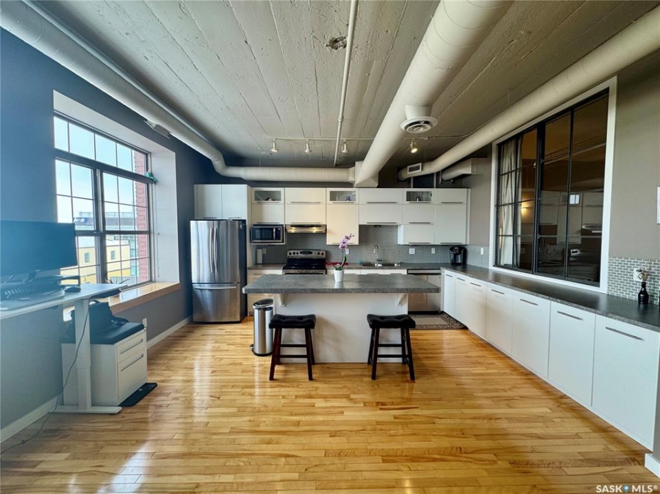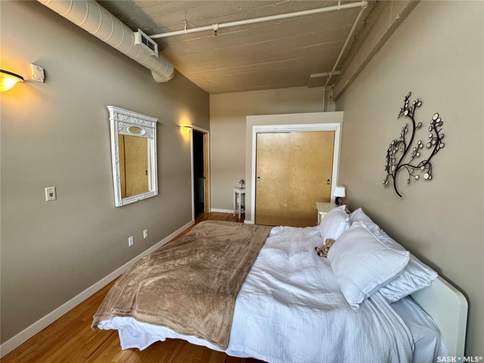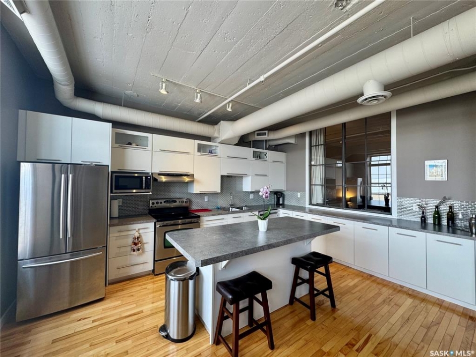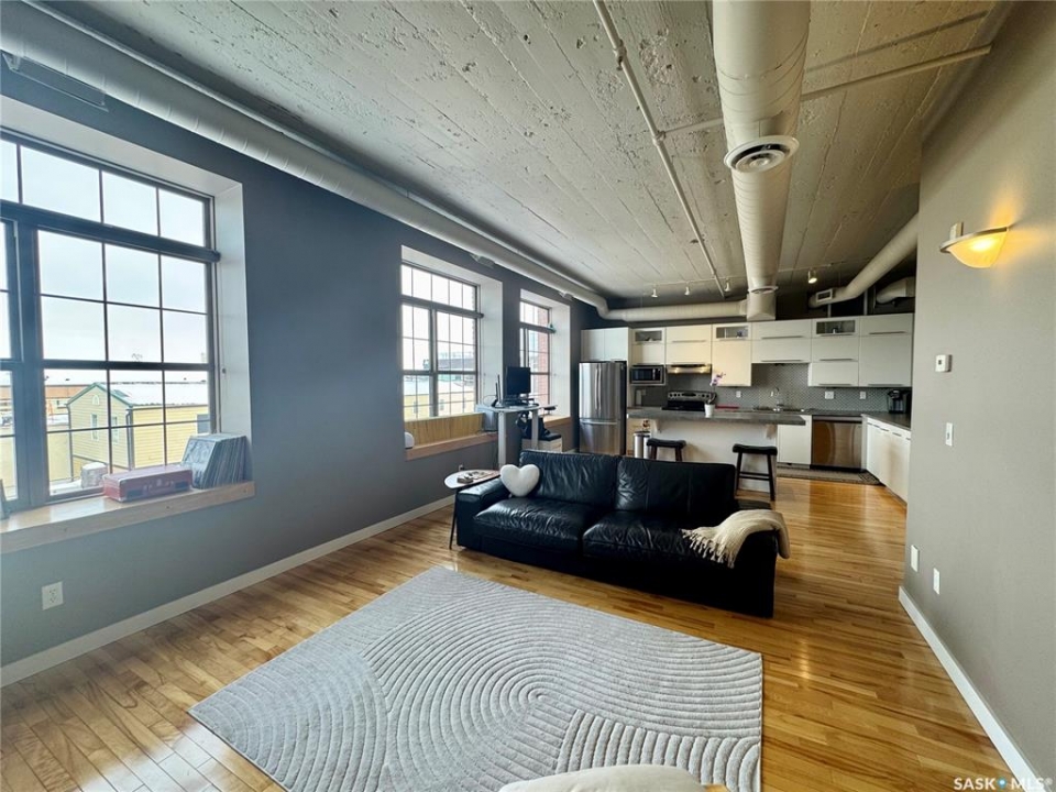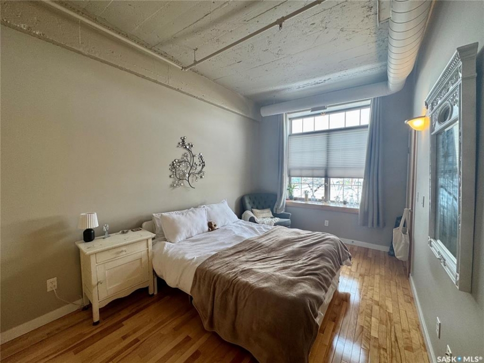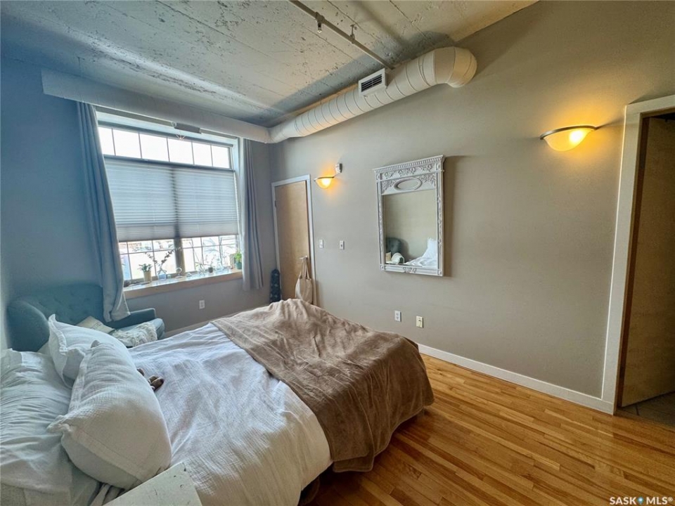 Welcome to the historic Fairbanks building, one of downtown Saskatoon's most recognizable heritage properties. Originally built in 1911 as the Fairbanks Morse warehouse, the building was thoughtfully converted into unique loft-style condos in 2006. This 2-bed, 2-bath suite is full of historic charm. Tall ceilings and oversized windows fill the open-concept living and kitchen area with natural light. The kitchen features an island, stainless steel appliances, and updated laminate countertops (2025). The primary bedroom offers a spacious layout with a 4-piece ensuite. The second bedroom features an original interior window overlooking the kitchen, a unique architectural detail that reflects the building's history. A convenient half bath is located near the entrance, and the unit includes in-suite laundry. Hardwood flooring runs throughout the main living areas, with tile in both bathrooms. This condo also includes a rare, fully insulated and heated detached garage (14' x 21'), along with a private storage room (6'2” x 11'10”) located in the basement. Residents can also enjoy the building's rooftop patio, amenities room, and guest suite available to rent for $40/night. A rare opportunity to own a distinctive loft in one of Saskatoon's most iconic heritage buildings.