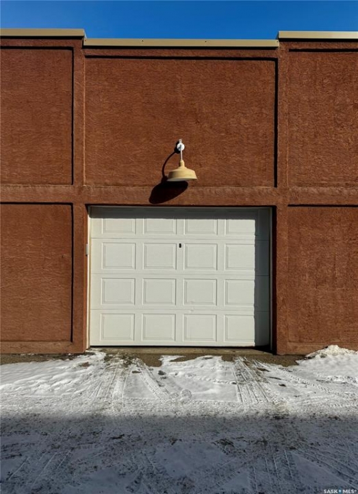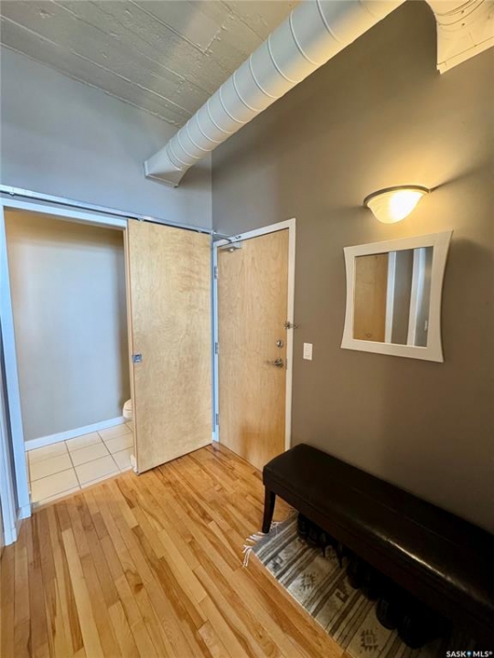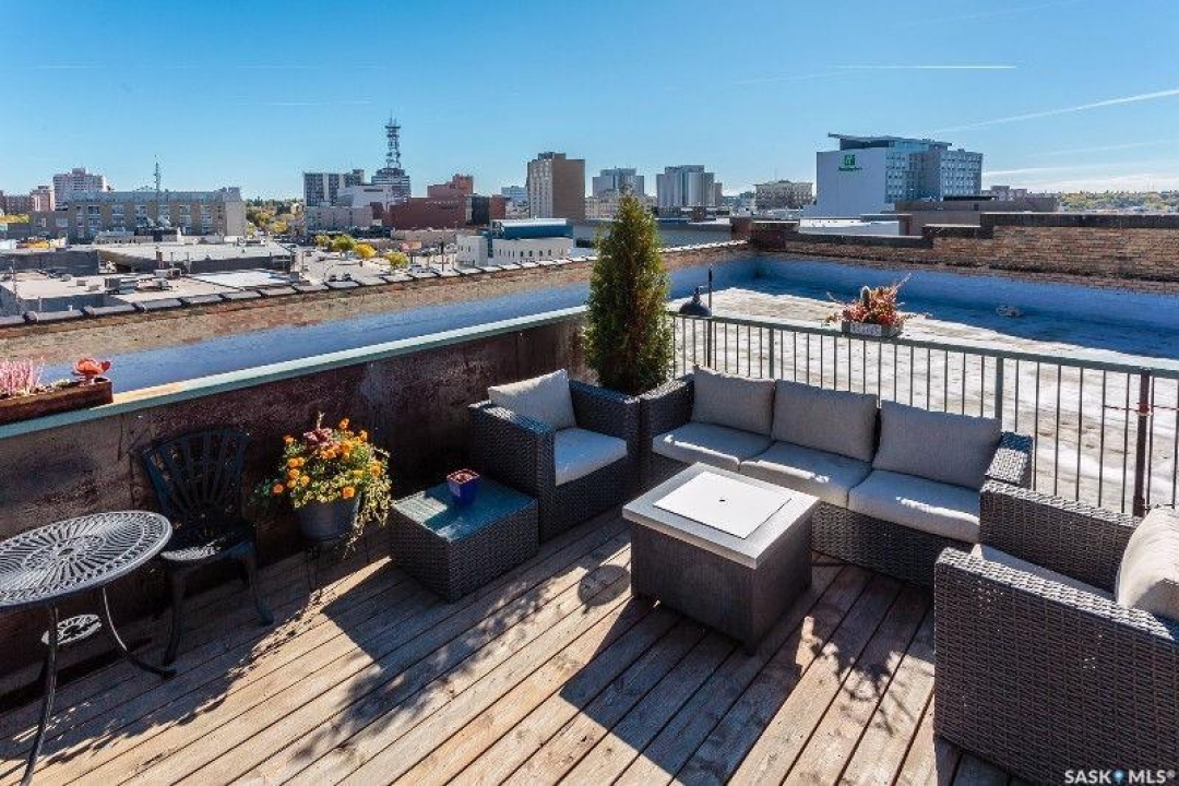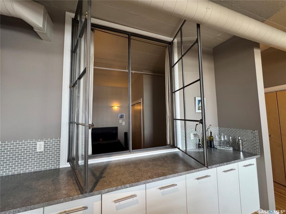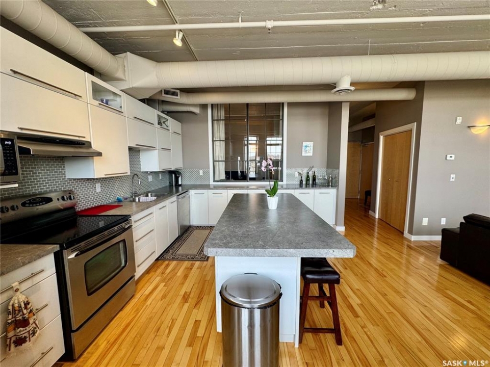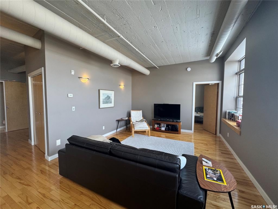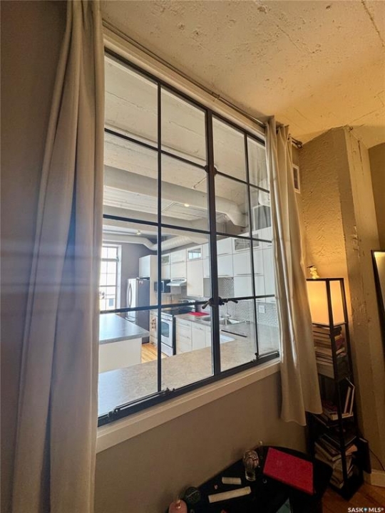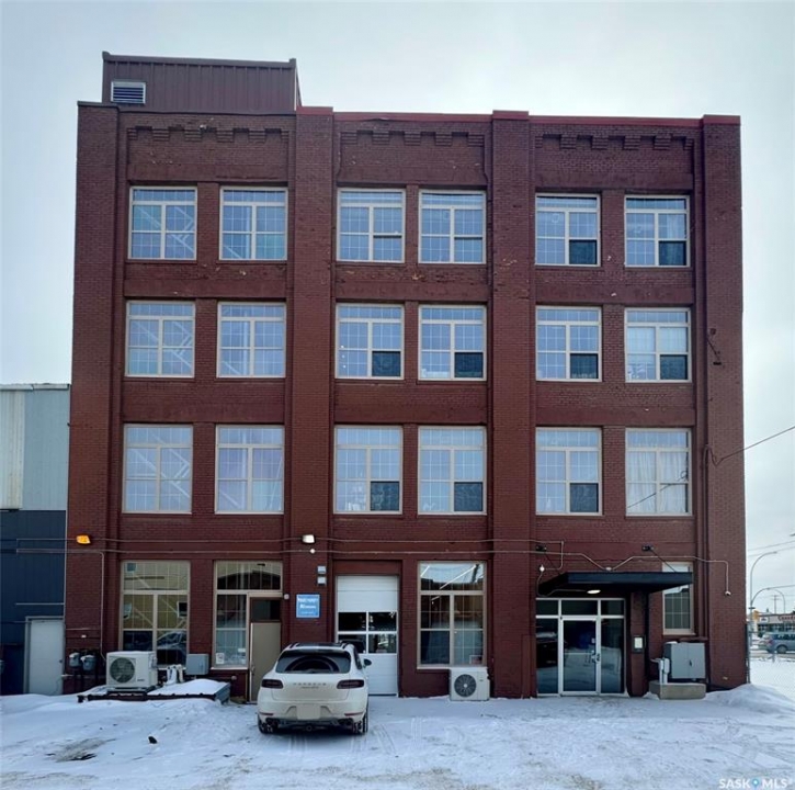 Welcome to the historic Fairbanks building, one of downtown Saskatoon's most recognizable heritage properties. Originally built in 1911 as the Fairbanks Morse warehouse, the building was thoughtfully converted into unique loft-style condos in 2006. This 2-bed, 2-bath suite is full of historic charm. Tall ceilings and oversized windows fill the open-concept living and kitchen area with natural light. The kitchen features an island, stainless steel appliances, and updated laminate countertops (2025). The primary bedroom offers a spacious layout with a 4-piece ensuite. The second bedroom features an original interior window overlooking the kitchen, a unique architectural detail that reflects the building's history. A convenient half bath is located near the entrance, and the unit includes in-suite laundry. Hardwood flooring runs throughout the main living areas, with tile in both bathrooms. This condo also includes a rare, fully insulated and heated detached garage (14' x 21'), along with a private storage room (6'2” x 11'10”) located in the basement. Residents can also enjoy the building's rooftop patio, amenities room, and guest suite available to rent for $40/night. A rare opportunity to own a distinctive loft in one of Saskatoon's most iconic heritage buildings.
