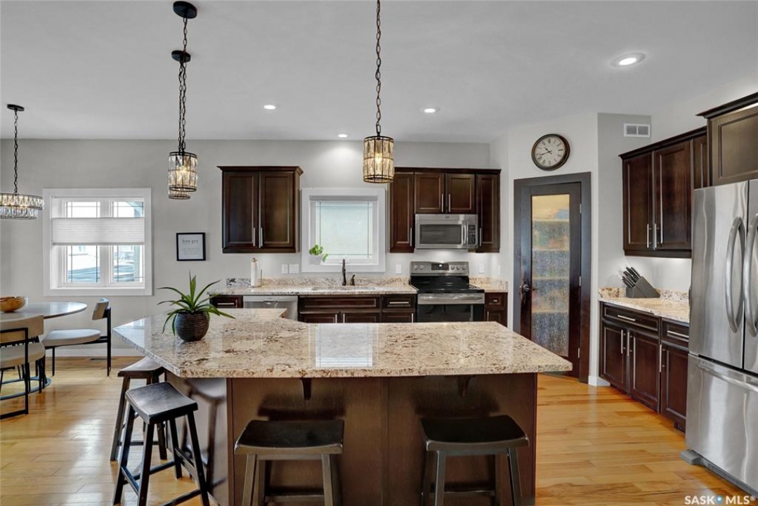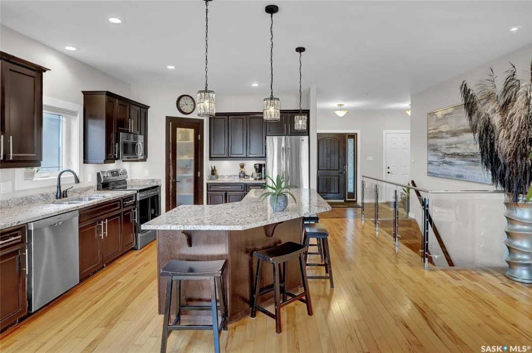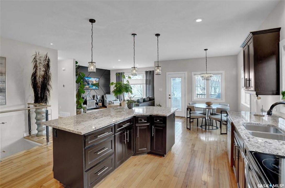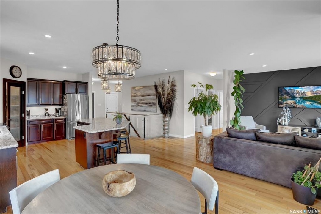 Welcome to upscale living in the heart of Sunningdale neighbourhood. This exceptional custom-built bungalow offers the perfect blend of design, functionality & comfort—ideal for families & those who love to entertain. From the moment you arrive, the curb appeal, manicured landscaping & inviting entrance set the tone for what awaits. Step into a bright, open-concept main floor featuring expansive windows that flood the space w/natural light & the hardwood flooring only enhances your living. The elegant living room showcases refined finishes in a feature wall & flows seamlessly into the dining area & the beautifully appointed kitchen. Designed with both style & practicality in mind, the kitchen boasts fantastic cabinetry, granite countertops, pantry, a large island & ample storage—perfect for everyday living & hosting. The main level offers generously sized bedrooms, including the primary retreat complete w/walk-in closet & a spa-inspired ensuite w/heated floor & towel rack. To complete this floor is the 4pc. bath & laundry w/cabinetry. Thoughtful layout & quality craftsmanship are evident throughout. The fully developed lower level expands your living space w/a large family room w/gas fireplace, game & wet bar area, 2 additional bedrooms, 4pc. bath & storage. Many versatile areas to be tailored to your lifestyle. Step outside to your private backyard oasis, w/tiered deck partially covered that has natural gas hook ups. This is where you will really enjoy the beautifully landscaped yard, which is quite private in bloom, perfect for relaxing or entertaining. Whether it's summer BBQs or quiet evenings, this outdoor space delivers. The oversized dbl. att. heated garage also features an electric car charger. This is a home located in the highly sought-after Sunningdale neighbourhood, you're close to parks, schools, walking paths, and all amenities—making this an exceptional place to call home. CLICK ON MULTI MEDIA TOUR FOR A VISUAL TOUR.