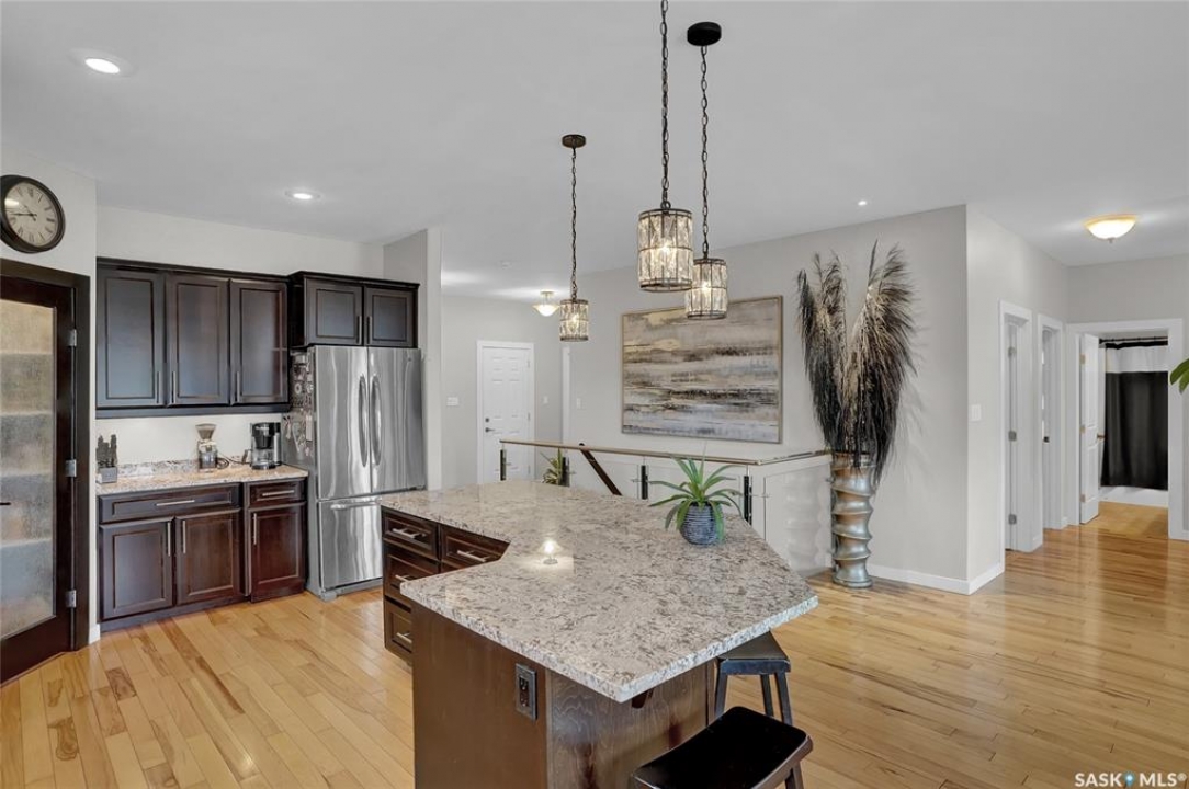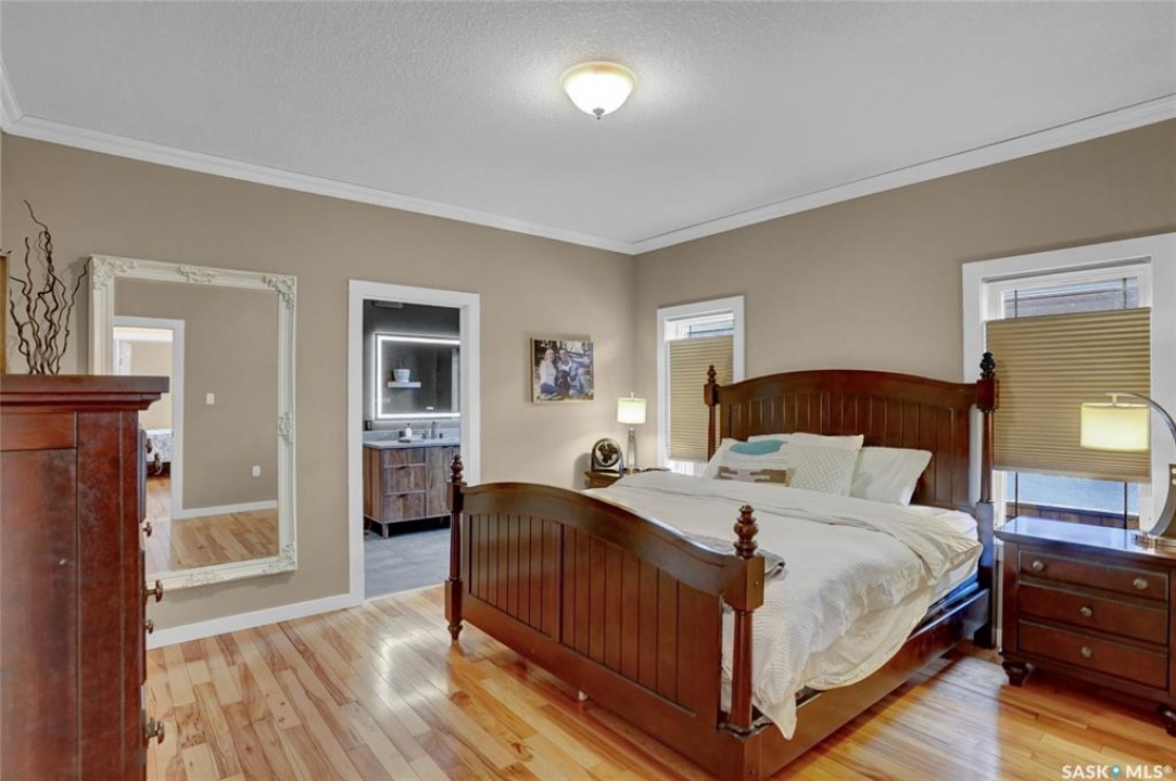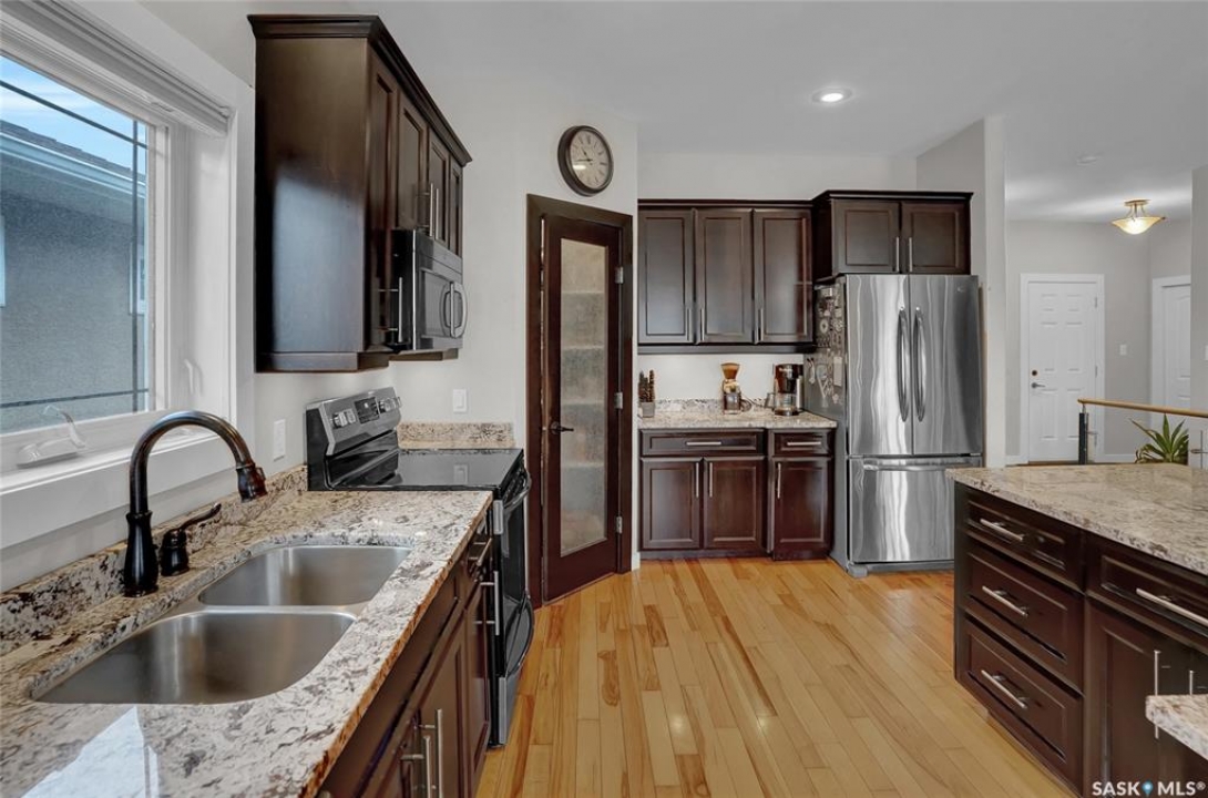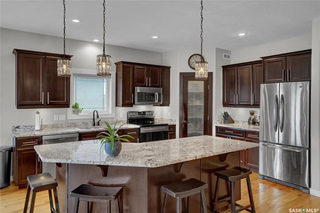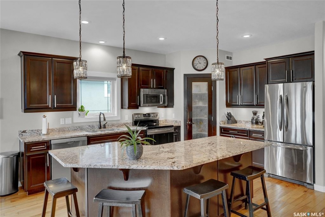 Welcome to upscale living in the heart of Sunningdale neighbourhood. This exceptional custom-built bungalow offers the perfect blend of design, functionality & comfort—ideal for families & those who love to entertain. From the moment you arrive, the curb appeal, manicured landscaping & inviting entrance set the tone for what awaits. Step into a bright, open-concept main floor featuring expansive windows that flood the space w/natural light & the hardwood flooring only enhances your living. The elegant living room showcases refined finishes in a feature wall & flows seamlessly into the dining area & the beautifully appointed kitchen. Designed with both style & practicality in mind, the kitchen boasts fantastic cabinetry, granite countertops, pantry, a large island & ample storage—perfect for everyday living & hosting. The main level offers generously sized bedrooms, including the primary retreat complete w/walk-in closet & a spa-inspired ensuite w/heated floor & towel rack. To complete this floor is the 4pc. bath & laundry w/cabinetry. Thoughtful layout & quality craftsmanship are evident throughout. The fully developed lower level expands your living space w/a large family room w/gas fireplace, game & wet bar area, 2 additional bedrooms, 4pc. bath & storage. Many versatile areas to be tailored to your lifestyle. Step outside to your private backyard oasis, w/tiered deck partially covered that has natural gas hook ups. This is where you will really enjoy the beautifully landscaped yard, which is quite private in bloom, perfect for relaxing or entertaining. Whether it's summer BBQs or quiet evenings, this outdoor space delivers. The oversized dbl. att. heated garage also features an electric car charger. This is a home located in the highly sought-after Sunningdale neighbourhood, you're close to parks, schools, walking paths, and all amenities—making this an exceptional place to call home. CLICK ON MULTI MEDIA TOUR FOR A VISUAL TOUR.