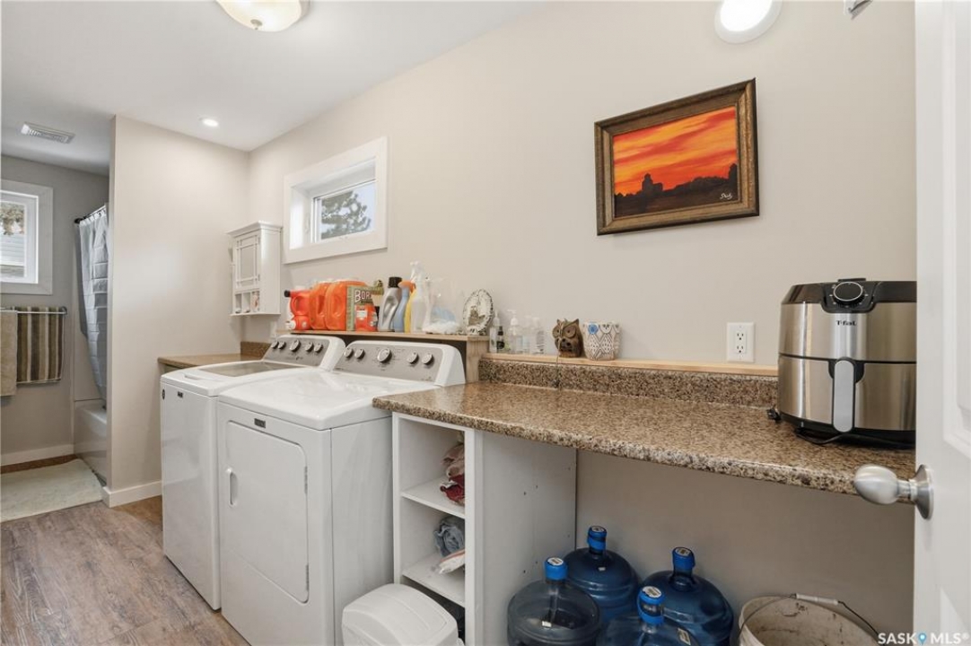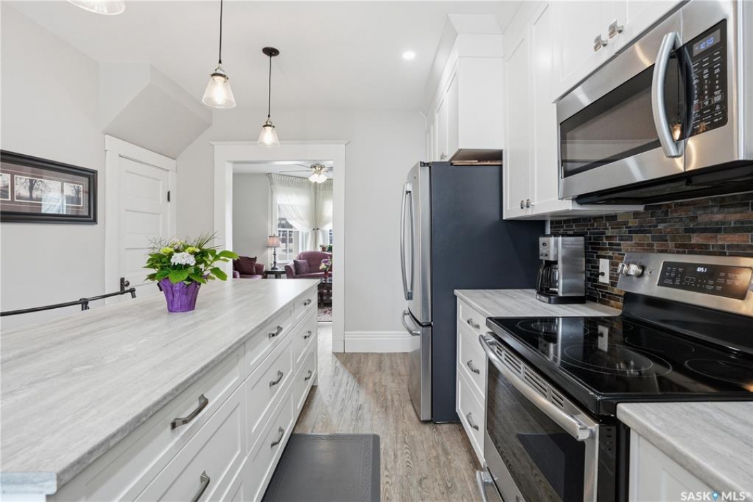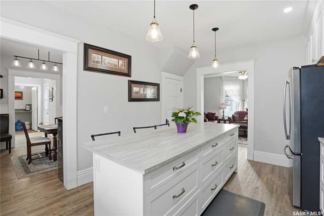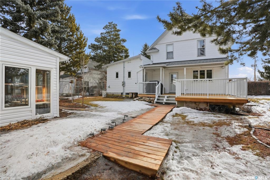 Set on a beautifully landscaped 100 x 125 ft. lot in Harris, this extensively renovated 2-storey home blends character with modern upgrades. Originally built in 1910 and completely redone in 2019 down to the studs, the home has new drywall, vapour barrier, plumbing, electrical, and a backflow valve. The updated interior includes new vinyl plank flooring, fresh paint, and a fully remodeled kitchen with floor-to-ceiling cabinetry, a large island with drawers, new appliances, and a pantry. A 2019 addition brought functionality with a second bathroom, mudroom, and laundry area with new washer and dryer. The second floor has three bedrooms, including a primary suite with a custom walk-in closet and a beautifully redone bathroom. Character has been carefully preserved with original fir trim, baseboards, and door casings. Major mechanical upgrades include a high-efficiency furnace, on-demand water heater, upgraded electrical service, and a 22 kW Generac generator hardwired to power both the home and garage to automatically kick in during a power outage. Additional improvements include triple-pane windows (some updated), new shingles, vinyl siding, and increased attic insulation to R58. Outside, the home has a large new deck, new fencing, two RV plugs, and extensive landscaping including 13 newly planted trees, hundreds of perennials, and regraded yard for improved drainage. A 20 x 12 greenhouse offers year-round growing potential with proper setup. The oversized single attached garage (2018) connects to the original garage, now a functional workshop with loft space. The partially developed basement has lots of storage space and an office. With 1,629 sq. ft. of living space and every major update already completed, this is a rare opportunity to own a fully upgraded character home in a peaceful community. Right across from the elementary school, this home has small-town charm just a short drive to Rosetown, Delisle and the Nutrien Mines and only 40 minutes to Saskatoon.