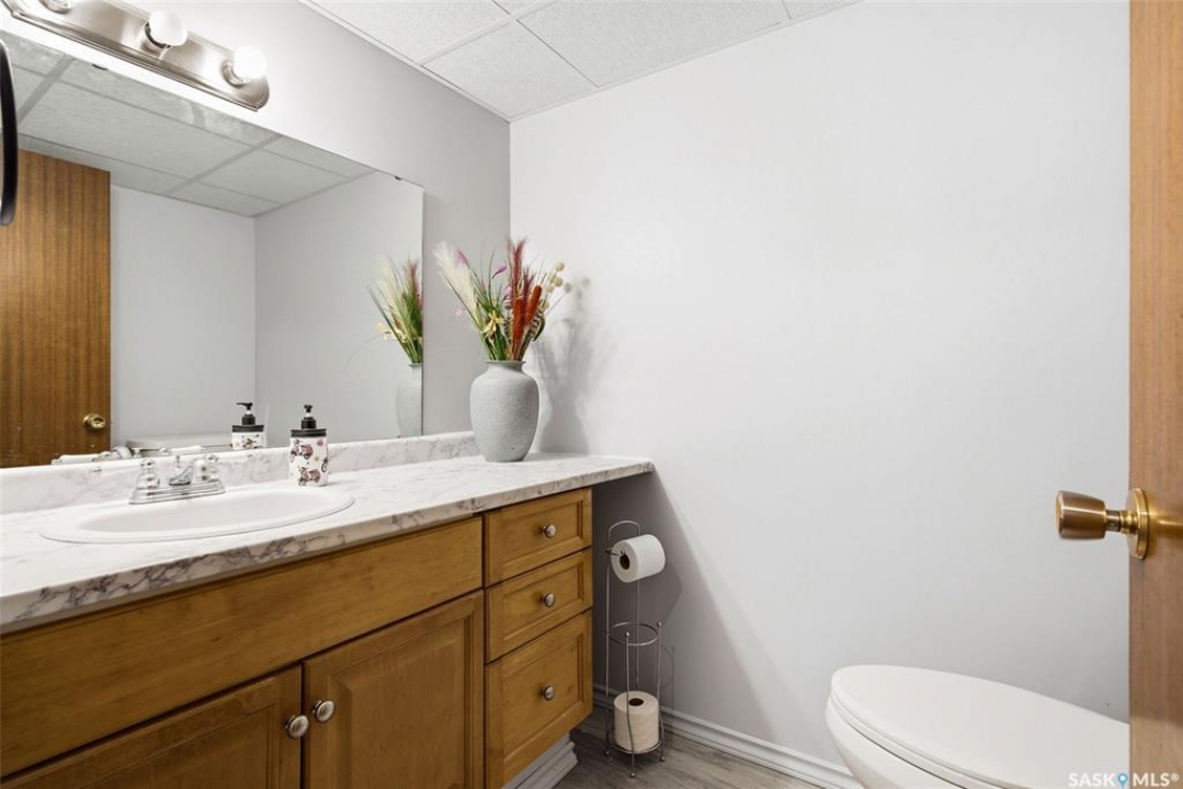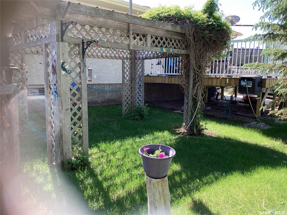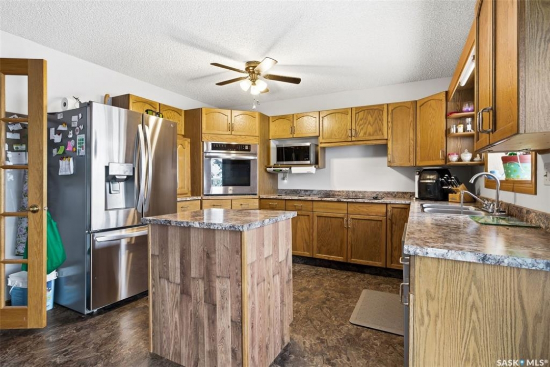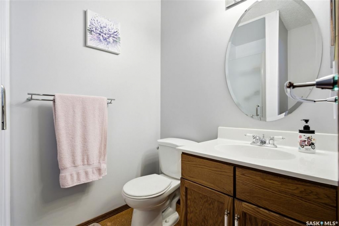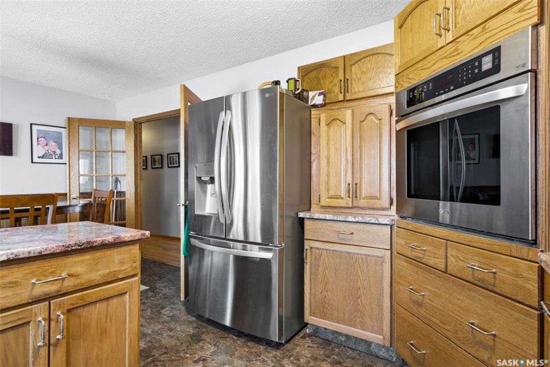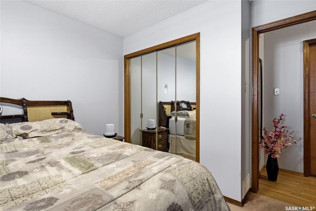 Welcome to this 1,207 sq. ft. raised bungalow tucked away on a quiet bay in Rochdale Park. This home offers a double attached garage, three main floor bedrooms, and two main floor bathrooms including a 3-piece ensuite off the primary bedroom. Hardwood flooring adds warmth through the living room, hallway, and primary bedroom, while PVC windows and the raised bungalow design allow for plenty of natural light on both levels. The west-facing oversized backyard is a standout feature, offering no neighbours behind, unobstructed prairie sunset views, a large two-tier deck, and a pond in the yard for added outdoor enjoyment. Seller states the kitchen countertop, laminate flooring, and built-in oven & fridge were updated in 2018, with an island, basement bathroom, and den added in 2019, and High Efficient furnace in 2022. Gas fireplaces in both the main floor and basement living rooms add comfort and character. A well-located family home with space, updates, and a great outdoor setting in a sought-after north Regina neighbourhood.