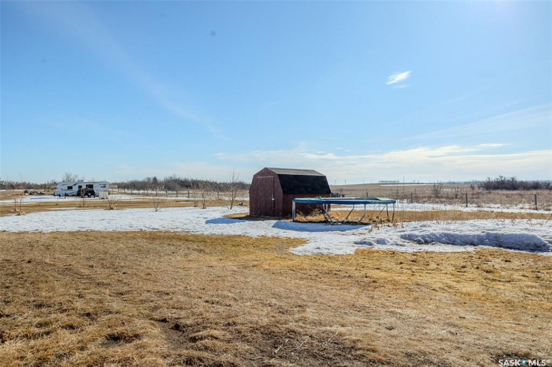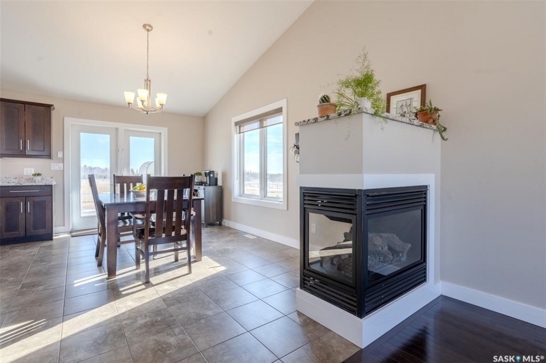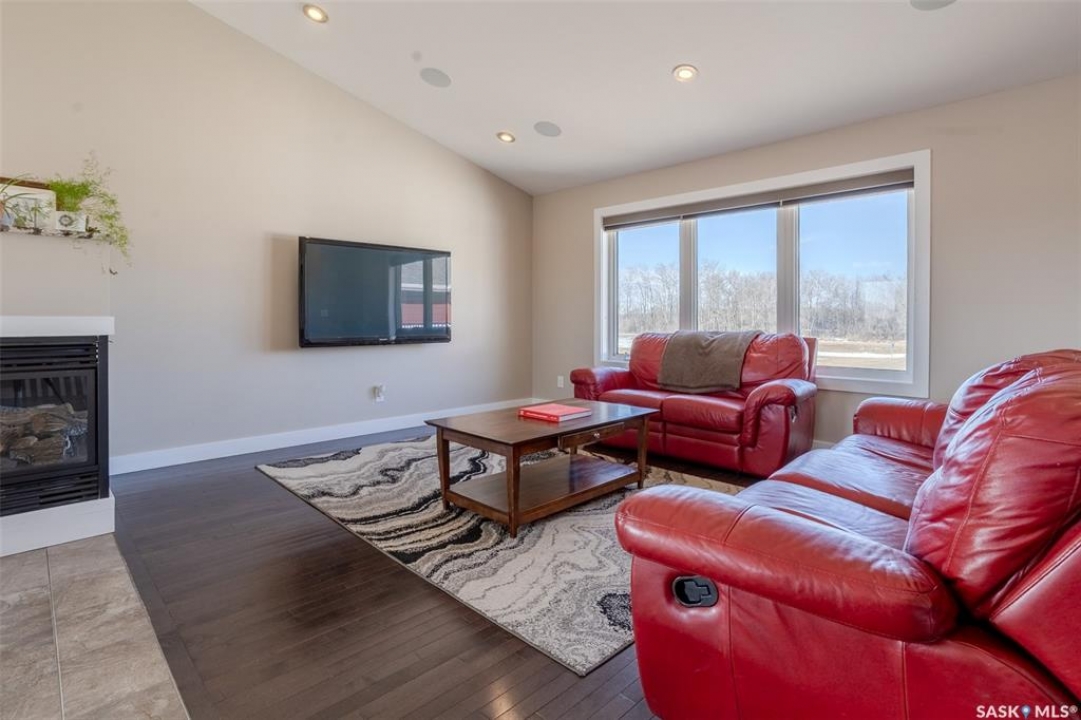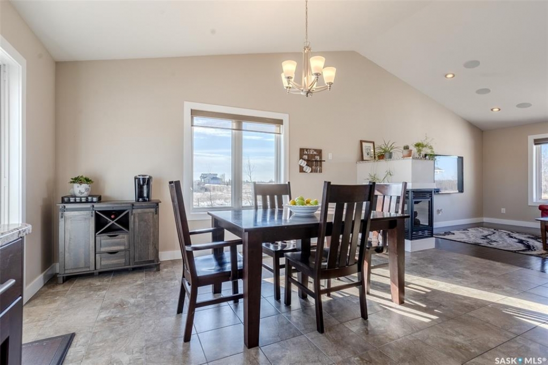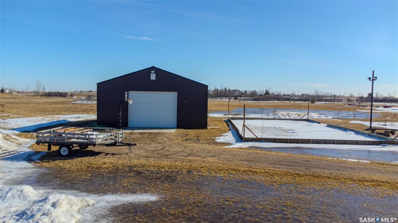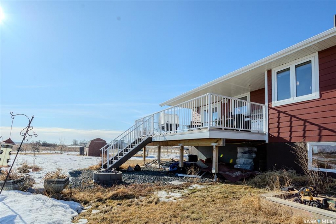 Welcome to this raised bungalow on 5 acres just 10 minutes south of Saskatoon, offering space, privacy, and an easy drive to the city. The main floor features vaulted ceilings and an open concept layout with hardwood flooring in the living room, tile through the kitchen and dining, and a gas fireplace. The kitchen includes granite countertops, under cabinet lighting, soft close cabinetry, a large island with double undermount sink and central vac kick plate, built in dishwasher, microwave hood fan, corner pantry, and a coffee area with a window overlooking the yard. Patio doors off the dining area lead to a partially covered deck with two natural gas BBQ hook ups. Completing the main level are two secondary bedrooms (bedroom closets have lights), a 4 piece bathroom, and a primary bedroom with windows on two walls, a 5 piece ensuite, and walk in closet. In floor heat runs through the living room, kitchen, dining, and bathrooms. Laundry is conveniently located off the garage entry. The attached garage offers 12 foot ceilings, double overhead doors, in floor heat, epoxy flooring, built in shelving, and a separate 60 amp panel. The basement is framed and drywalled for two bedrooms and a full bathroom, with pot lighting, 9 foot ceilings, and large windows. Safe and sound insulation has been added, and the home is wired for Control4. Outside, there is a 36 x 40 steel shop with concrete floor, 16 x 12 overhead door and 100 amp panel. The yard includes over 100 trees on a drip line system, adding future privacy and room to grow. The property is serviced with fiber optic internet, with access in both the garage and shop, and city water with a new pressure system installed in 2024. School bus service is available to South Corman Park for K-8 and Clavet for 9-12. This property has space for kids to run, quiet mornings, and room to build the lifestyle you want. Two large animals allowed, ideal for horse enthusiasts. Call your Realtor today to book your private showing!