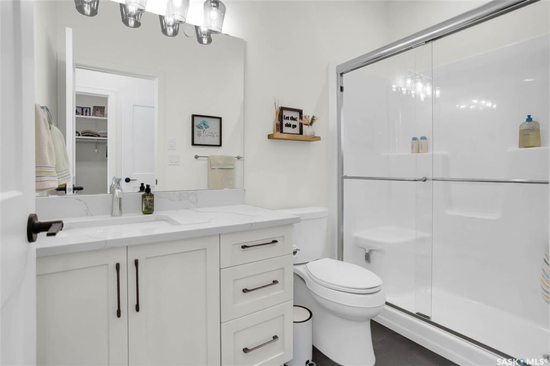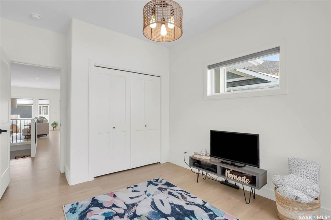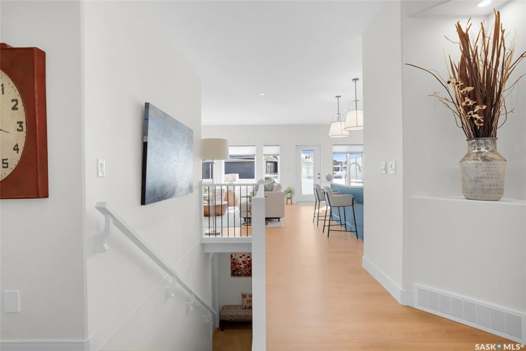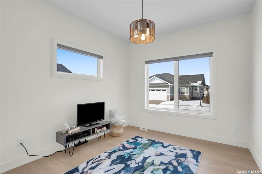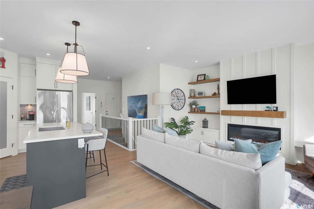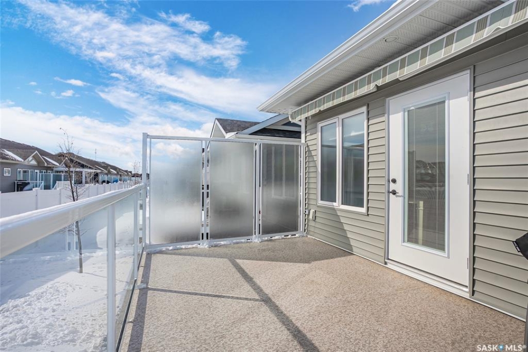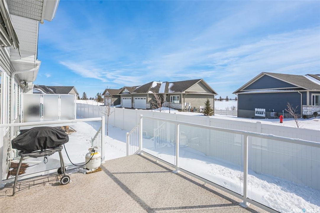 Welcome to the vibrant community of Warman, a city that offers all essential amenities and more. This immaculate end-unit townhome, bungalow style, built by a reputable Northridge builder, is ideally situated in a highly sought-after neighborhood adjacent to the golf course, offering lovely views of surrounding green space. Well maintained by its original owner, the home features thoughtful upgrades throughout, including enhanced lighting, custom living room shelving, and premium Electrolux appliances—a fridge, stove, washer, dryer, built-in microwave/hood fan—as well as a high-end Miele built-in dishwasher. The open-concept floor plan creates an inviting and functional living space. The modern kitchen is bright and stylish, complete with a walk-in pantry, island with breakfast bar, and quartz countertops. The comfortable living room offers a beautiful electric fireplace as its focal point. The primary bedroom includes a private three-piece ensuite. Step outside through the garden door to enjoy the south-facing deck, equipped with a custom motorized awning for shade and comfort when desired. The full basement features four large windows, is fully insulated, and is open for your future development. Additional highlights include custom blinds, central air conditioning and a fully insulated, drywalled double attached garage with direct entry. Located just steps from Corney Klassen Park, you'll have access to excellent walking paths and a wonderful sense of small-community serenity—all while enjoying the convenience of big-city services. With quick access to Saskatoon via a well-maintained double-lane highway, this home offers outstanding livability. Experience condo-townhome living at its finest, offering effortless comfort and low-maintenance convenience. Truly move-in ready and a pleasure to view.