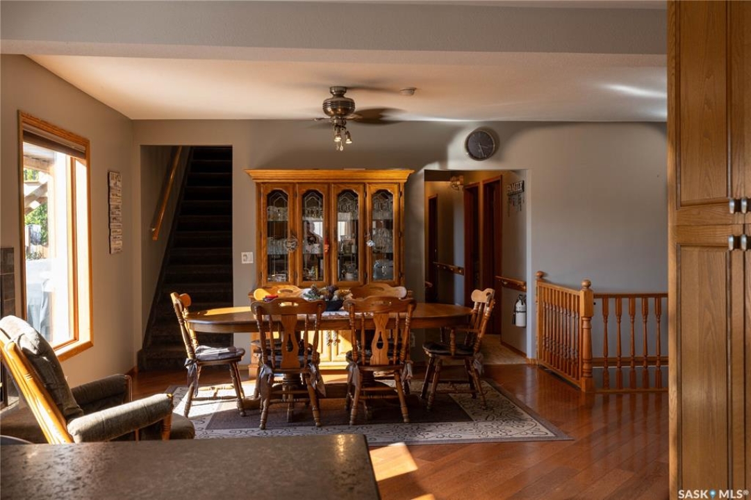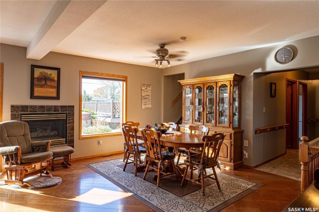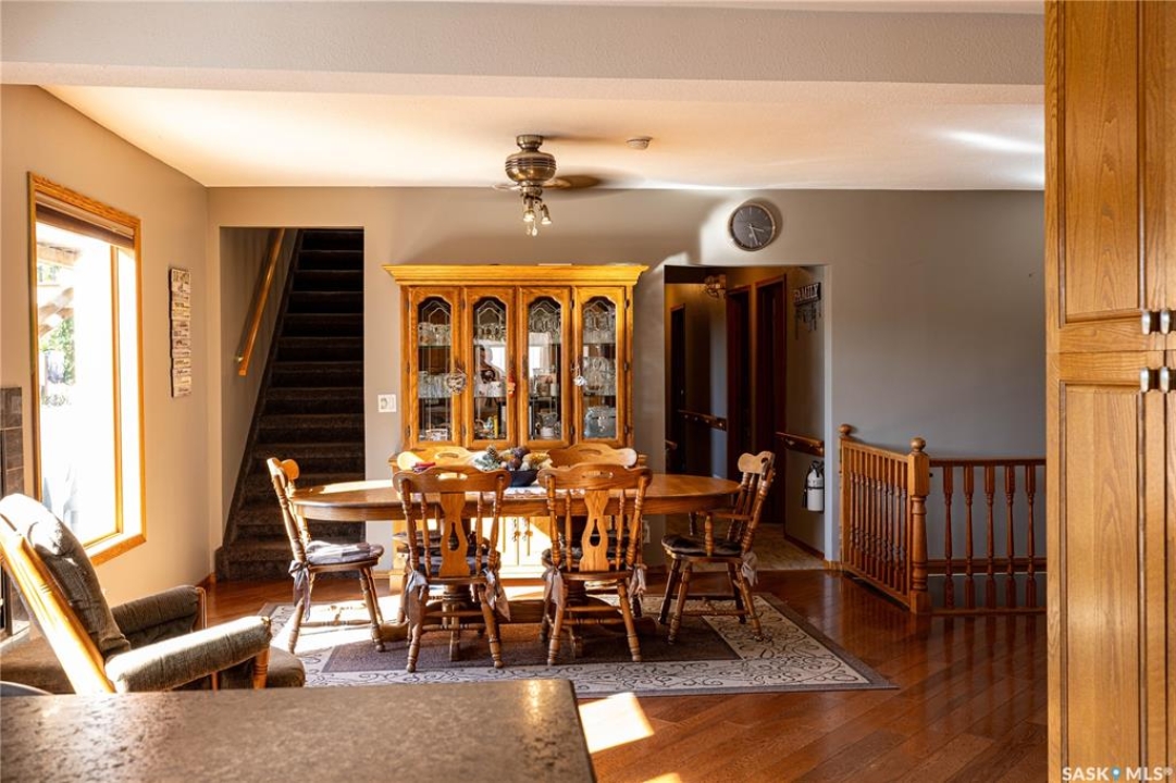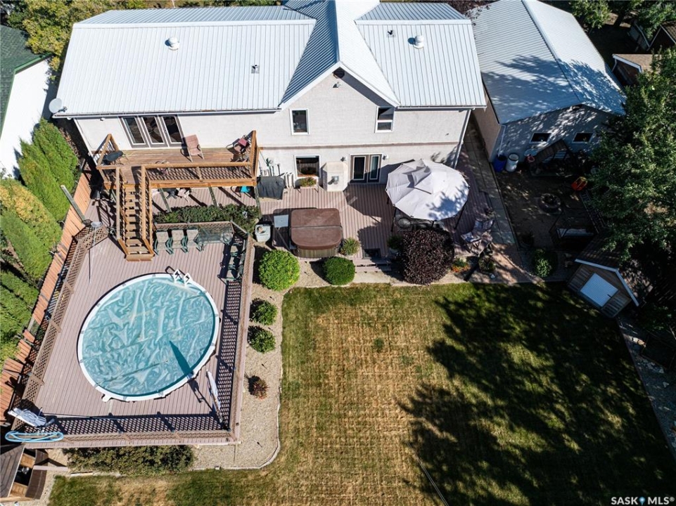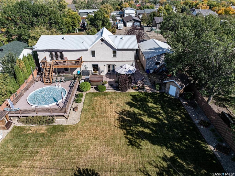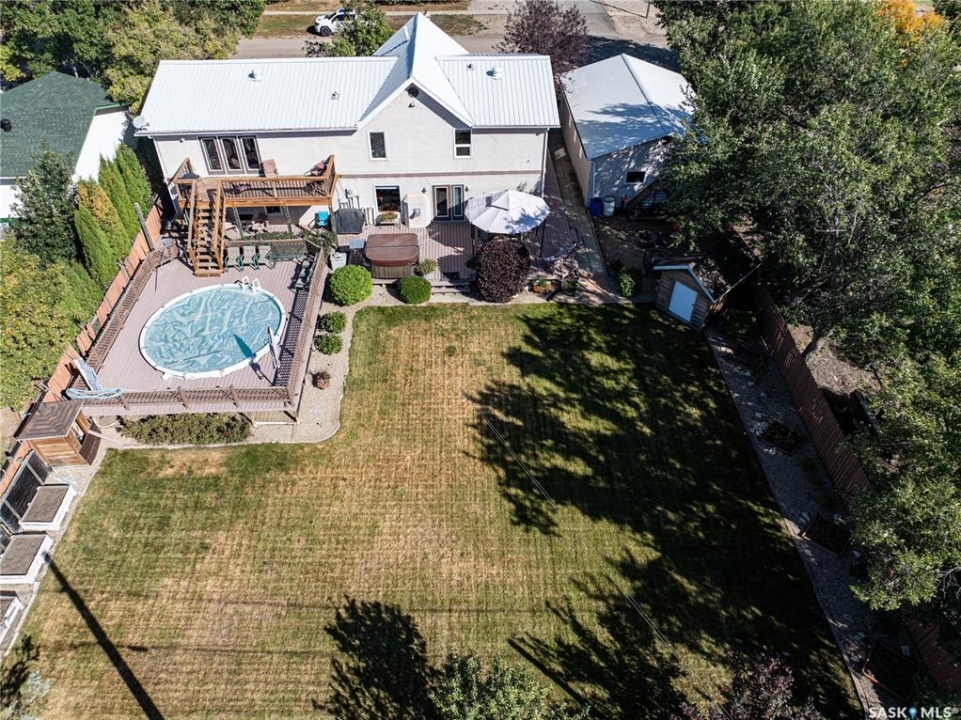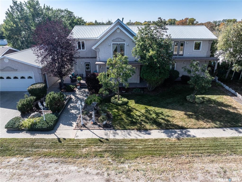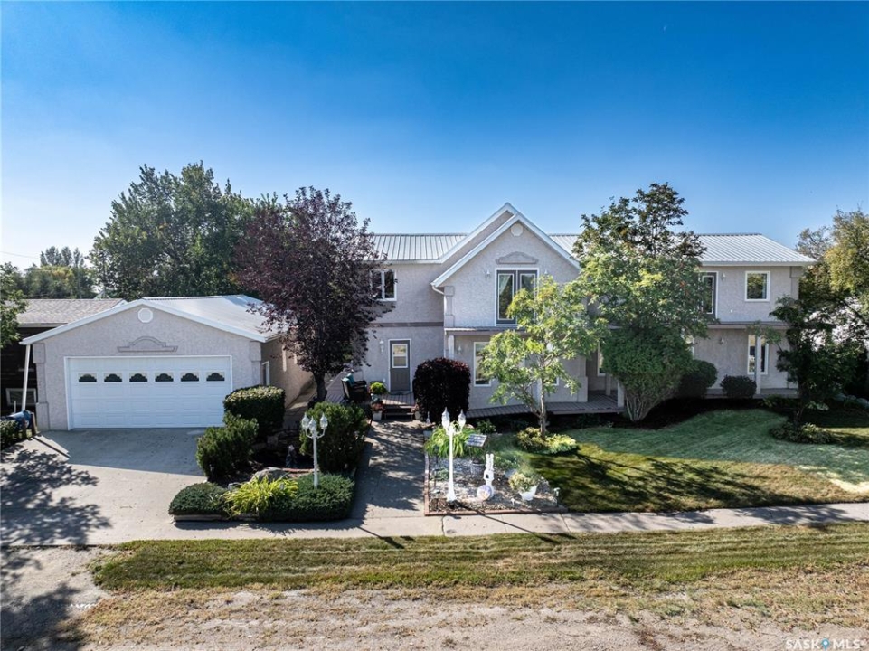 Perfect for a growing family, or ideal to repurpose as a group home or private care facility, this spacious property in Milden offers exceptional value and versatility. Originally built as a personal residence and operated as a 5-bed private care home for 21 years, it now shines as a beautifully maintained family home on a landscaped lot featuring a welcoming water feature, raised garden beds, a firepit area, above-ground pool with wrap-around deck, and a heated double detached garage with room for vehicles and a boat. Inside, nearly 3,600 sq. ft. of living space includes a main floor laundry, oak kitchen with stainless appliances and porcelain tile floors, spacious dining area with natural gas fireplace, main floor living room with fireplace, two bathrooms, and five bedrooms suited for family, guests, or hobbies. The second level offers a large family room with fireplace, games area, office/bedroom, bath with laundry, primary suite with ensuite, and three additional bedrooms. Located just 15 minutes west of Outlook, under 45 minutes to Lake Diefenbaker or Vanscoy potash, and about 65 minutes to Saskatoon, this home combines small-town charm with outstanding space and amenities. Book your private showing today!