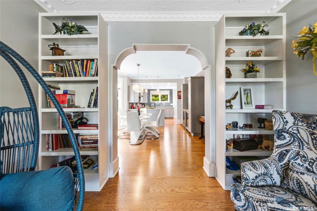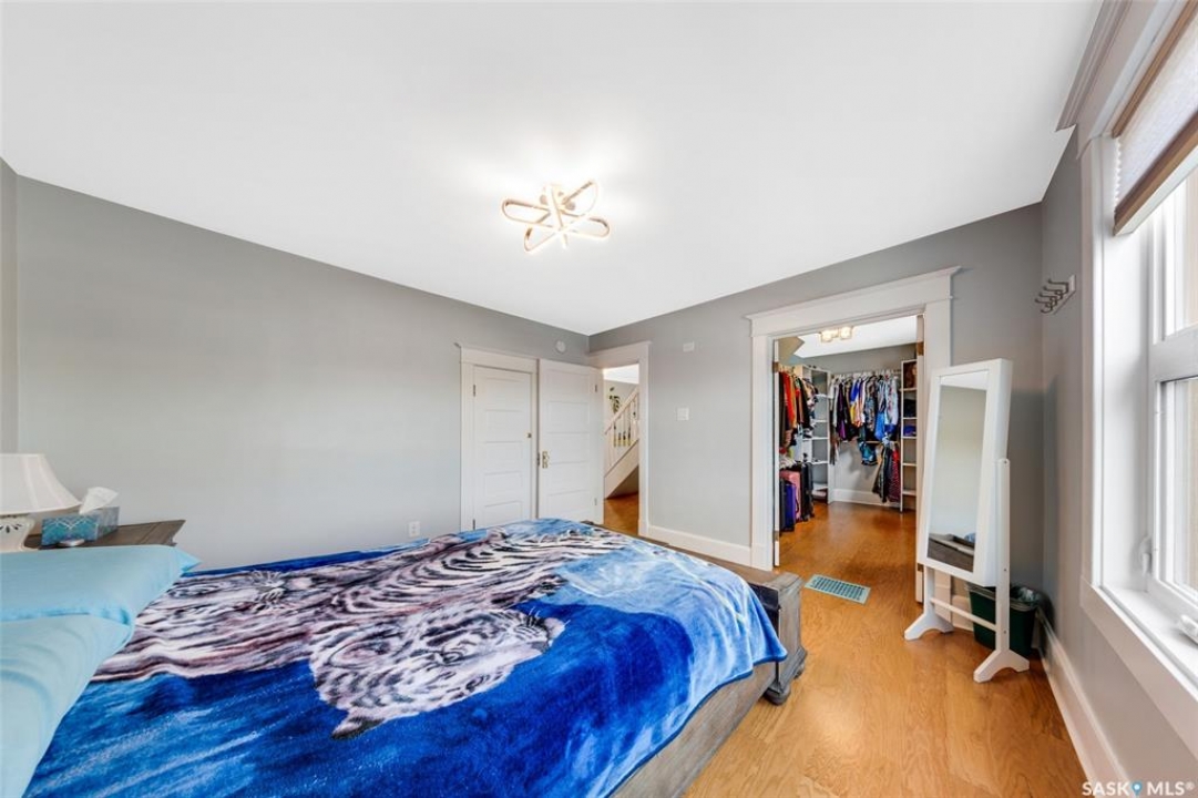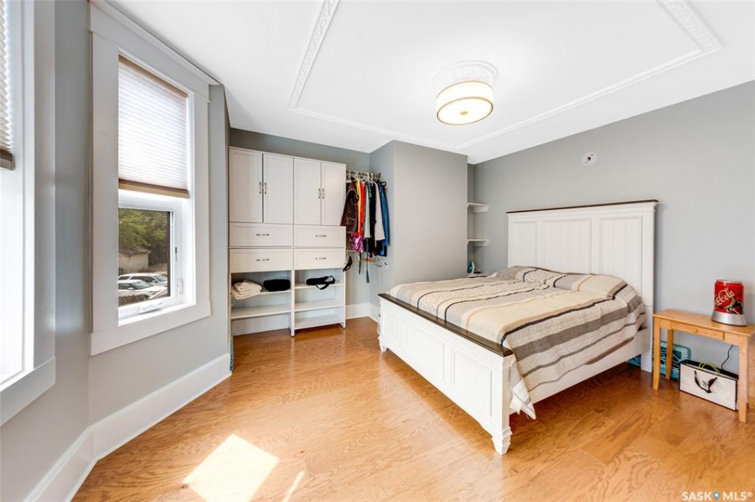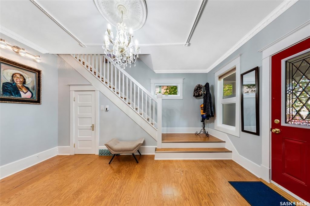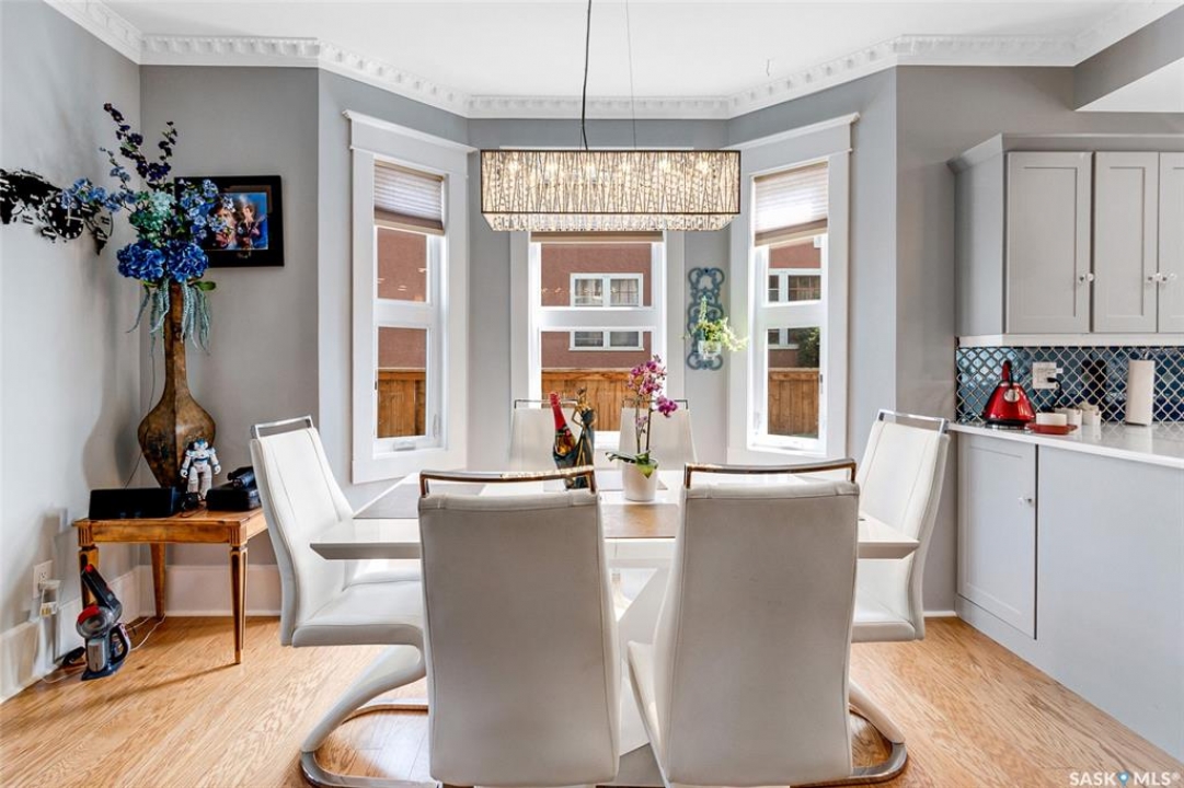 Just steps from the Saskatchewan River, tucked into the historic Nutana Neighbourhood, this Character 1911 home has been lovingly restored for clients who appreciate the history and location of this property. This spacious home has a completely renovated kitchen with quartz countertops, new cupboards and backsplash, under counter lighting, all new appliances, including a newer large wine and beer fridge and a nice open floorplan flowing through to the dining room and living room. An office space and main floor laundry are a great convenience on the main floor. Four- piece bathrooms on each of first two floors and half bath on third floor are convenient. Three large bedrooms on the second floor, one with a very large walk-in closet with window. (Could be used as a nursery.) One of the bedrooms on the second floor can also be used as a Sunroom. A new staircase leads to the third floor where the primary bedroom could be located. This room could also be used as a bonus room or very large office. Owner has replaced much of the crown molding to return this property to its original glory. There are South facing decks off the second and third floor as well as a back deck off the kitchen, also South facing. Most windows are new. Furnace, water heater and reverse osmosis recently changed. New paint everywhere and new engineered hardwood flooring make this is a turnkey property (Vinyl planking on the 3rd floor). Arches, tall baseboards, bay windows and glass doors complete the historic look of this home. This property has a completely fenced in backyard with board sidewalk leading to parking off the back alley. There is room for a garage. The owner has also created a small oasis of gardening boxes tucked around the back yard which is drenched in sunshine most of the day. Come and visit this beautifully renovated historic home, you'll be glad you did.