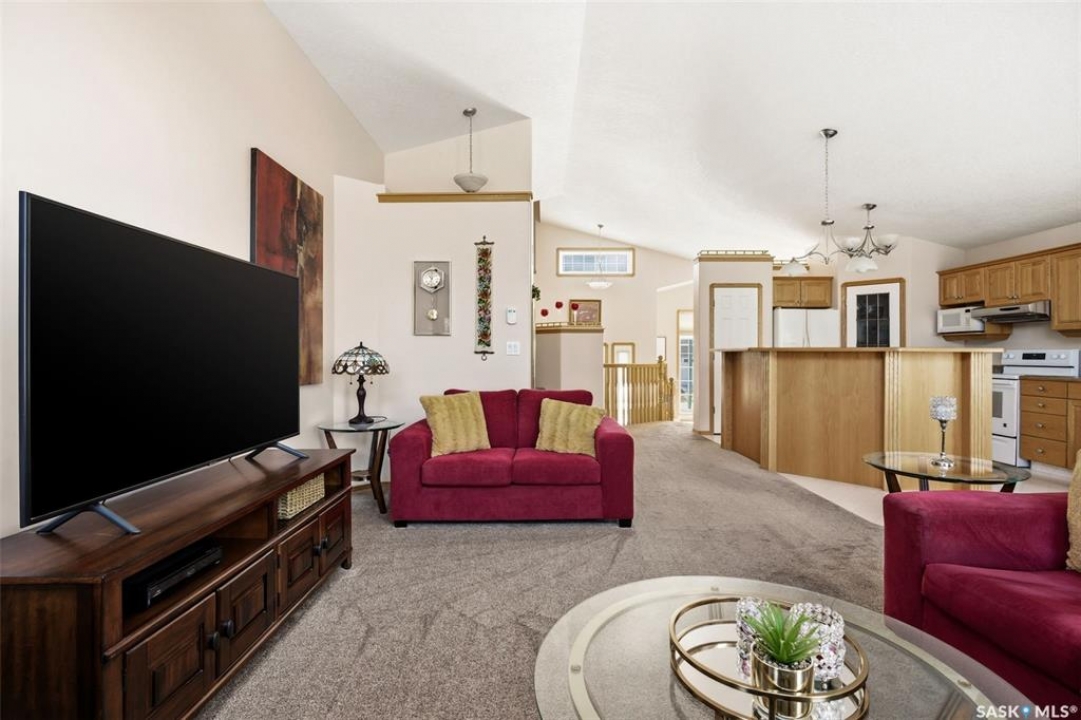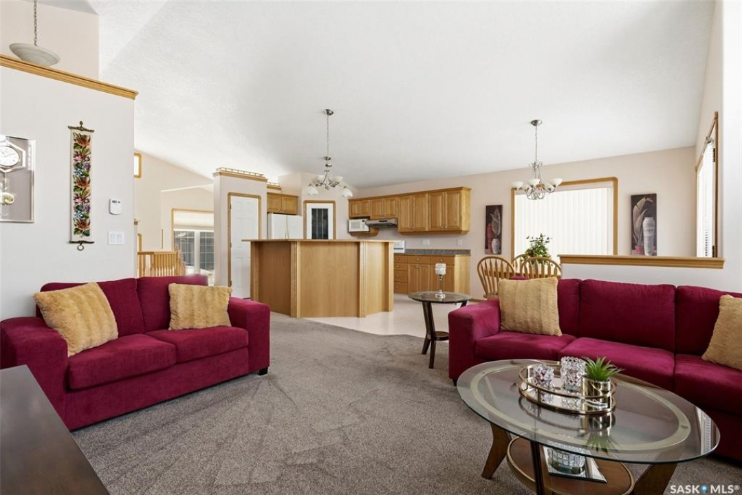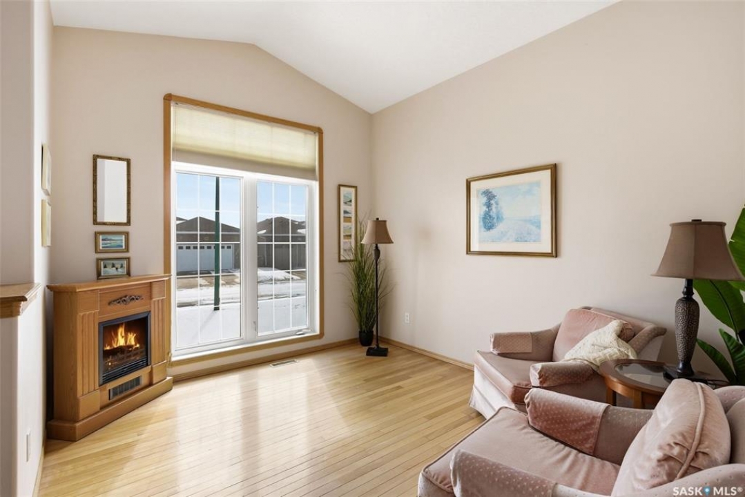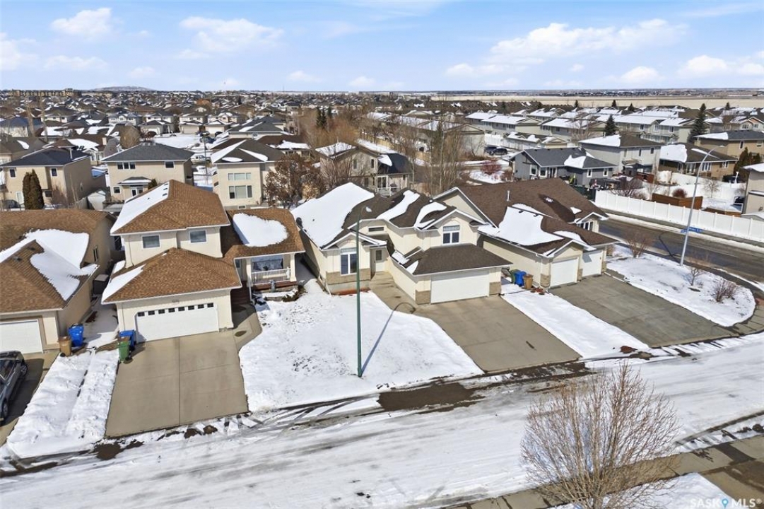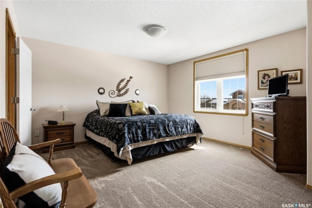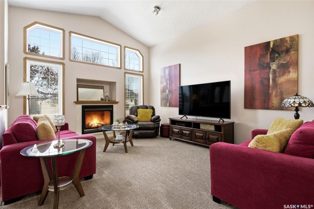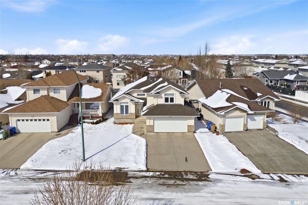 Absolute gem! Meticulously kept, custom-built by Emerald Park Homes, this unique modified bi-level offers 1,674 sq ft of thoughtfully designed living space with the primary suite above the garage. Step into a welcoming front entry featuring a versatile den/flex room—perfect for a home office or playroom. The open-concept main floor showcases a bright kitchen, dining area, and great room with vaulted ceilings, a cozy natural gas fireplace, and an impressive wall of windows that flood the space with natural light. The main level also includes two spacious bedrooms, a full bathroom, and a convenient laundry room. Upstairs, retreat to your private primary suite complete with a walk-in closet and full ensuite—your own peaceful escape. The bright basement features large windows, is fully insulated, and offers a wide-open layout ready for future development (basement plans available). The double attached garage (22' x 21') includes an additional 7' x 12' space ideal for a workshop or extra storage. Value-added upgrades include: Newer PVC fence (2020/21), Shingles (2015), New stove & dishwasher (2026). Additional highlights: corner pantry, under-cabinet lighting, closet lighting, central air conditioning, central vacuum, and all appliances included. Located in a fantastic family-friendly area close to St. Gabriel and Jack MacKenzie Schools—this is a wonderful place to call home!